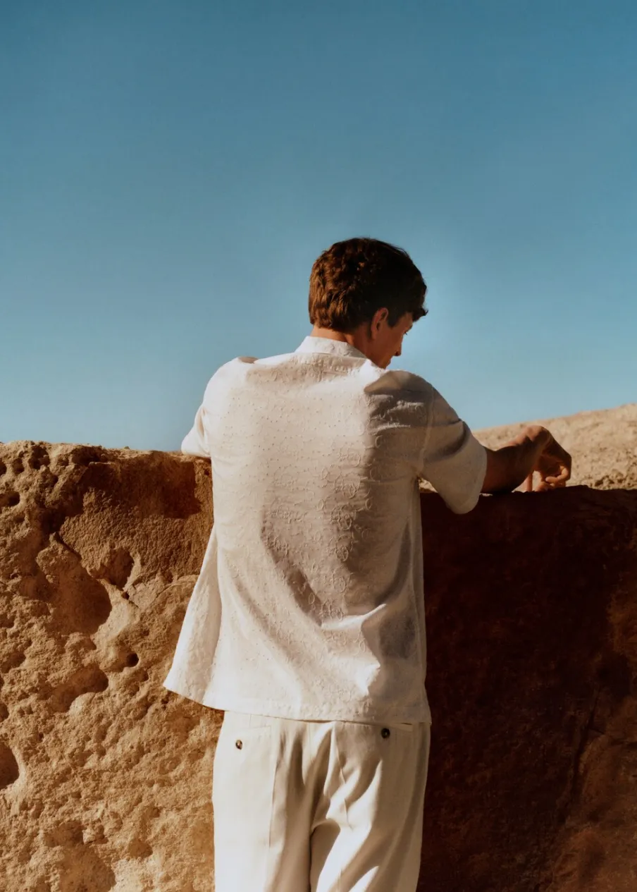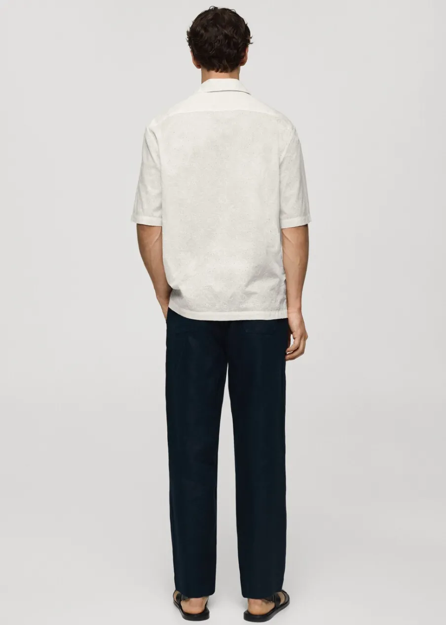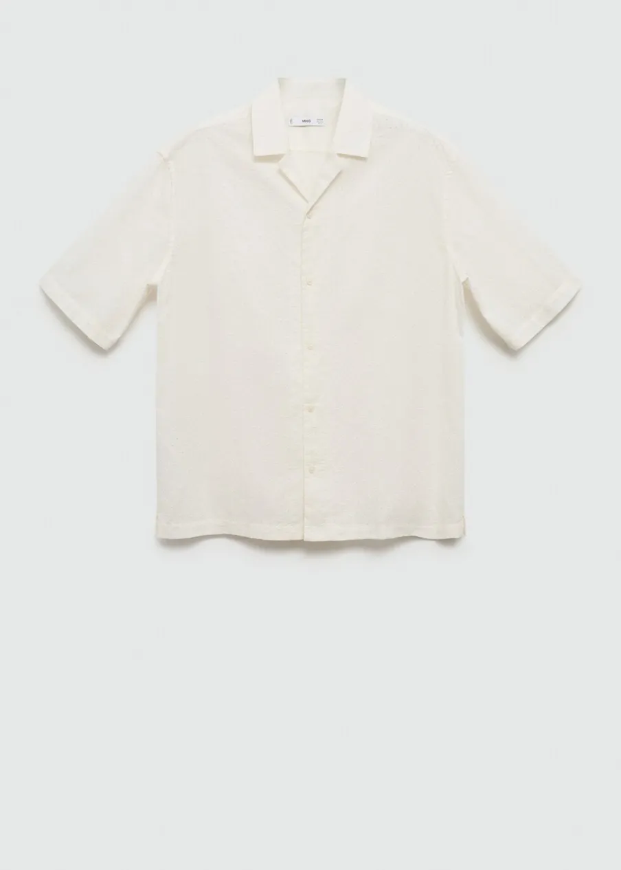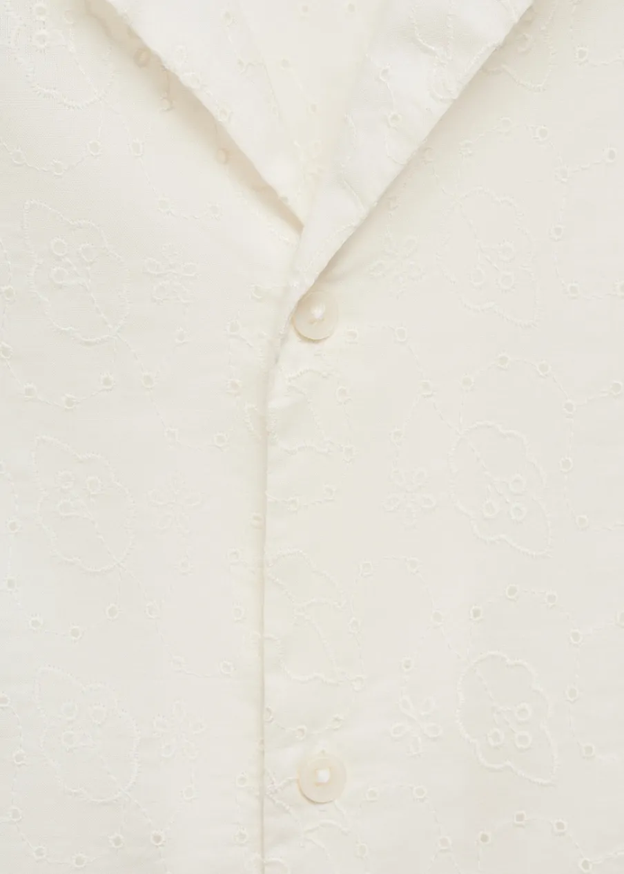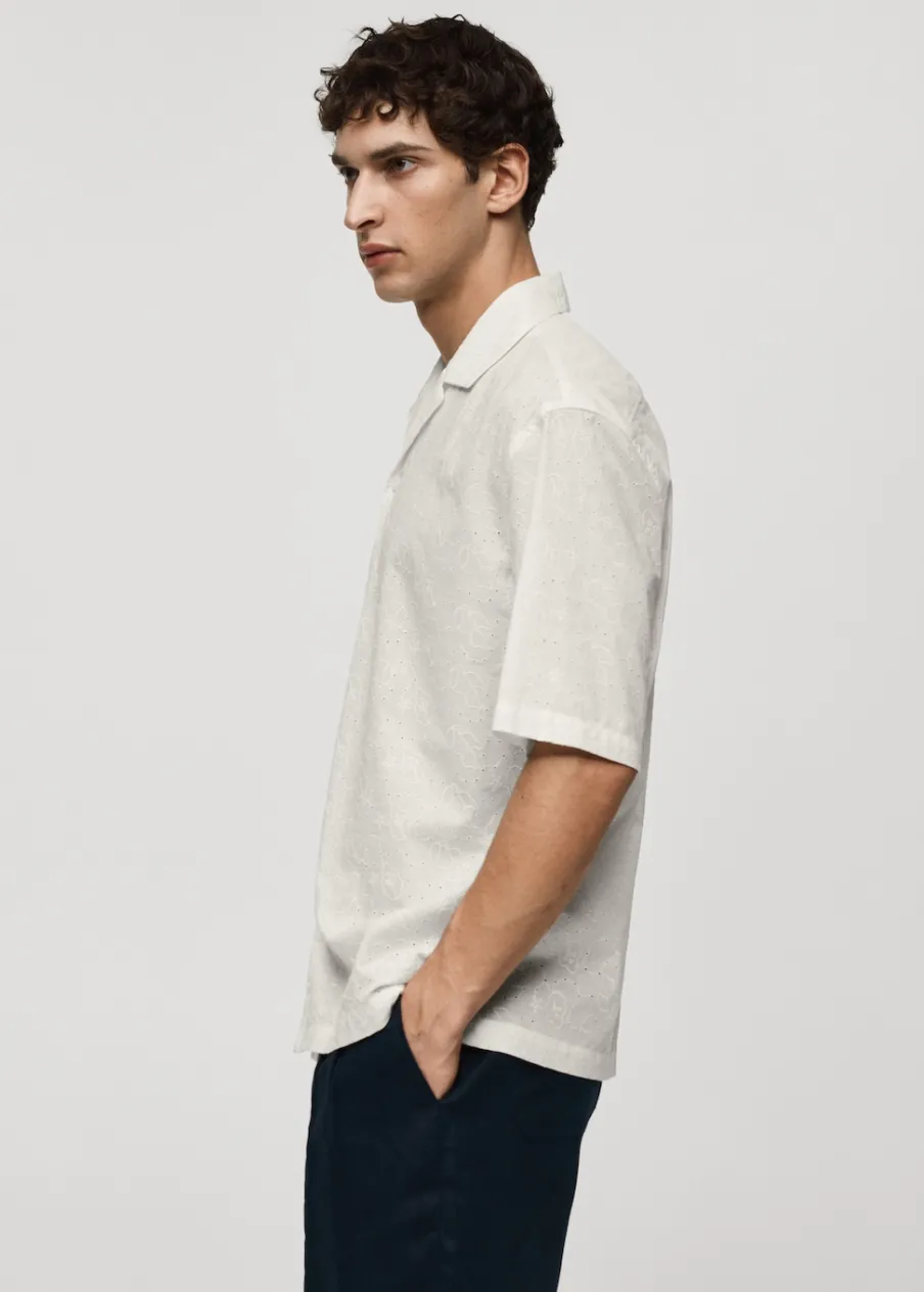 Relaxed fit. Koszulowy kołnierz. Kołnierzyk typu bowling. Krótki rękaw. Prosty dół. Model ma 185 cm wzrostu i nosi rozmiar M. Haftowany motyw. Tkanina z 100% bawełny. Zapięcie na guziki z przodu.
