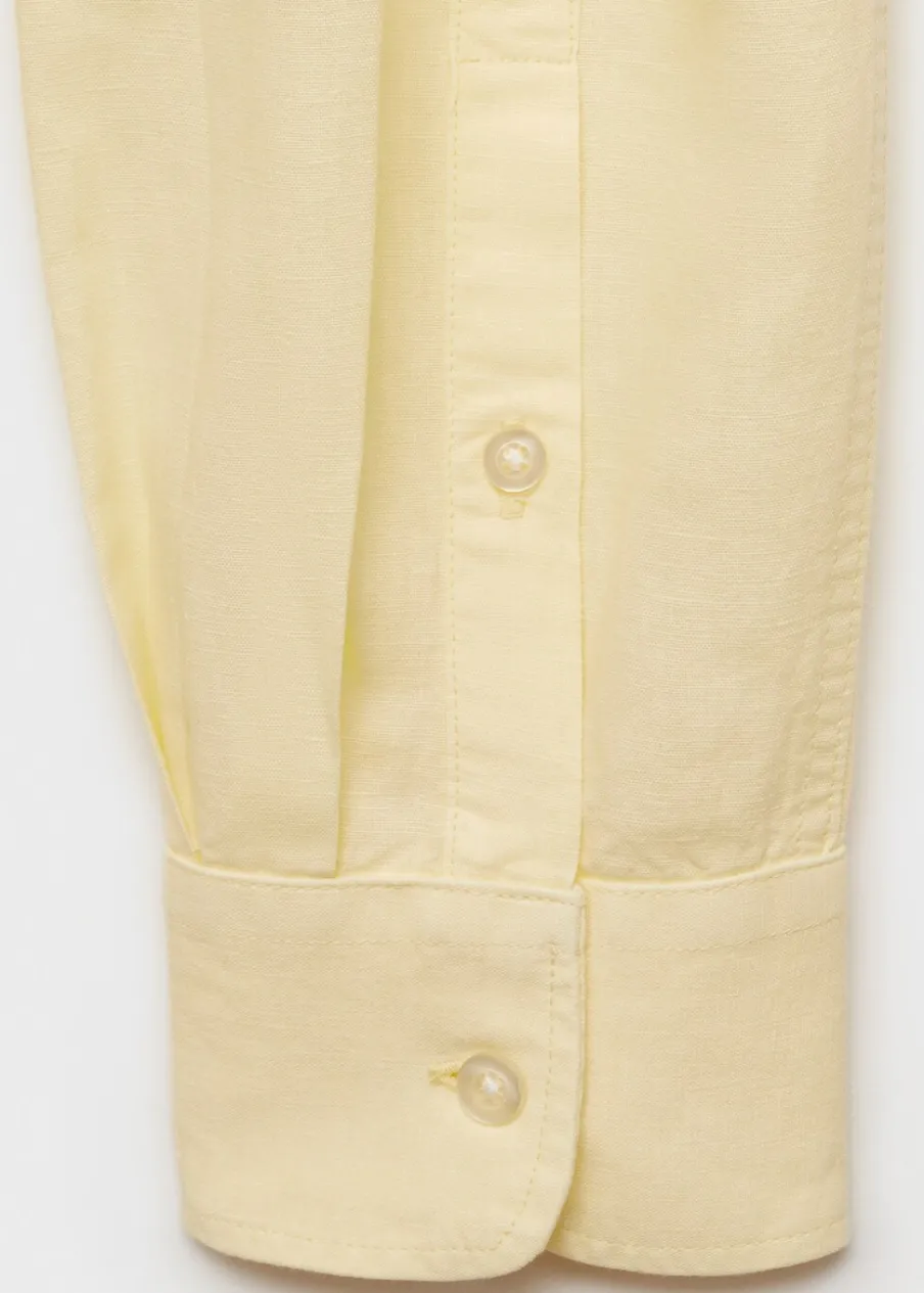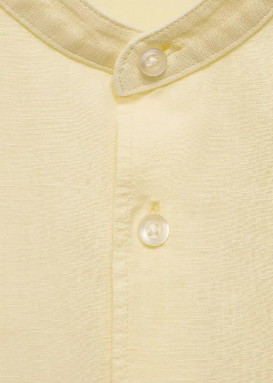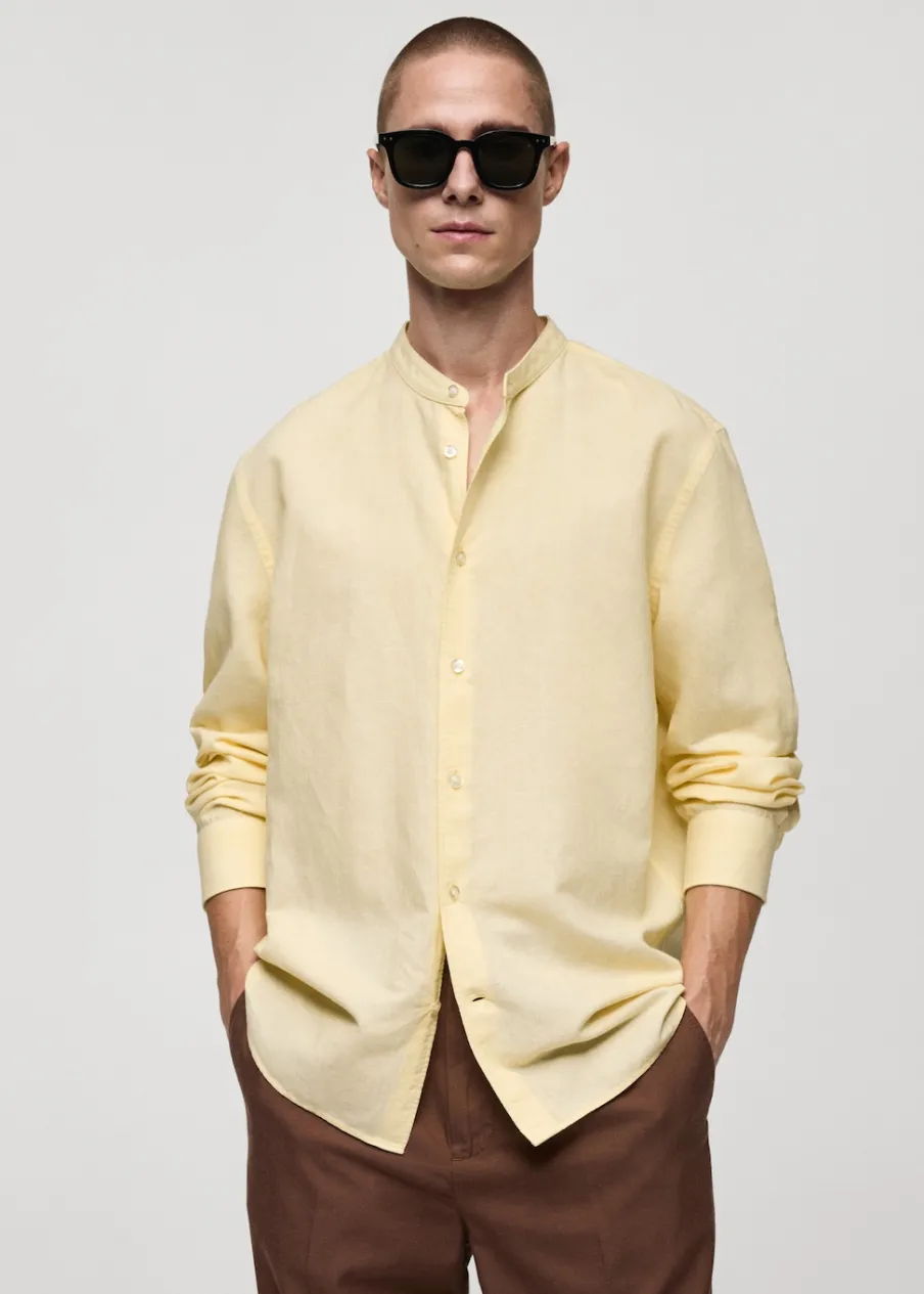 Wyłącznie online. Tkanina z mieszanki lnu i bawełny. Cienka tkanina. Stójkowy kołnierzyk. Zapięcie z przodu na guziki. Długi rękaw z guzikami na mankietach. Model ma 185 cm wzrostu i nosi rozmiar M. Klasyczny krój. Zaokrąglony dół.