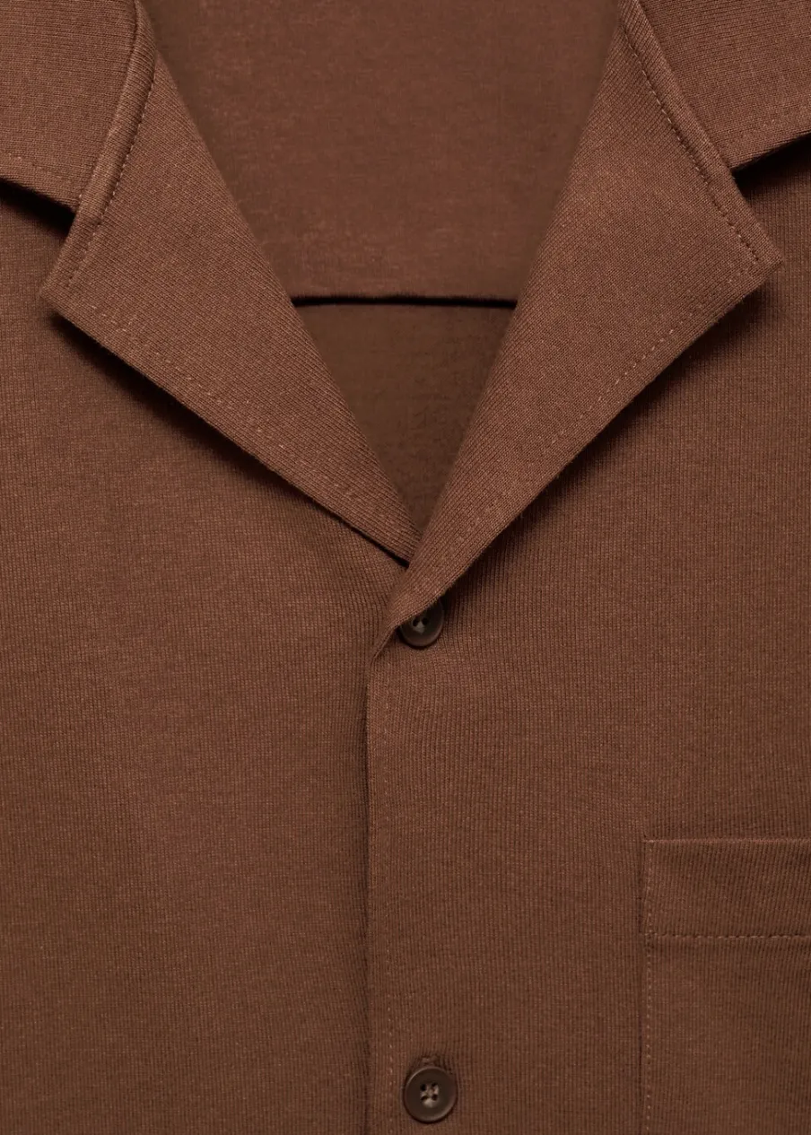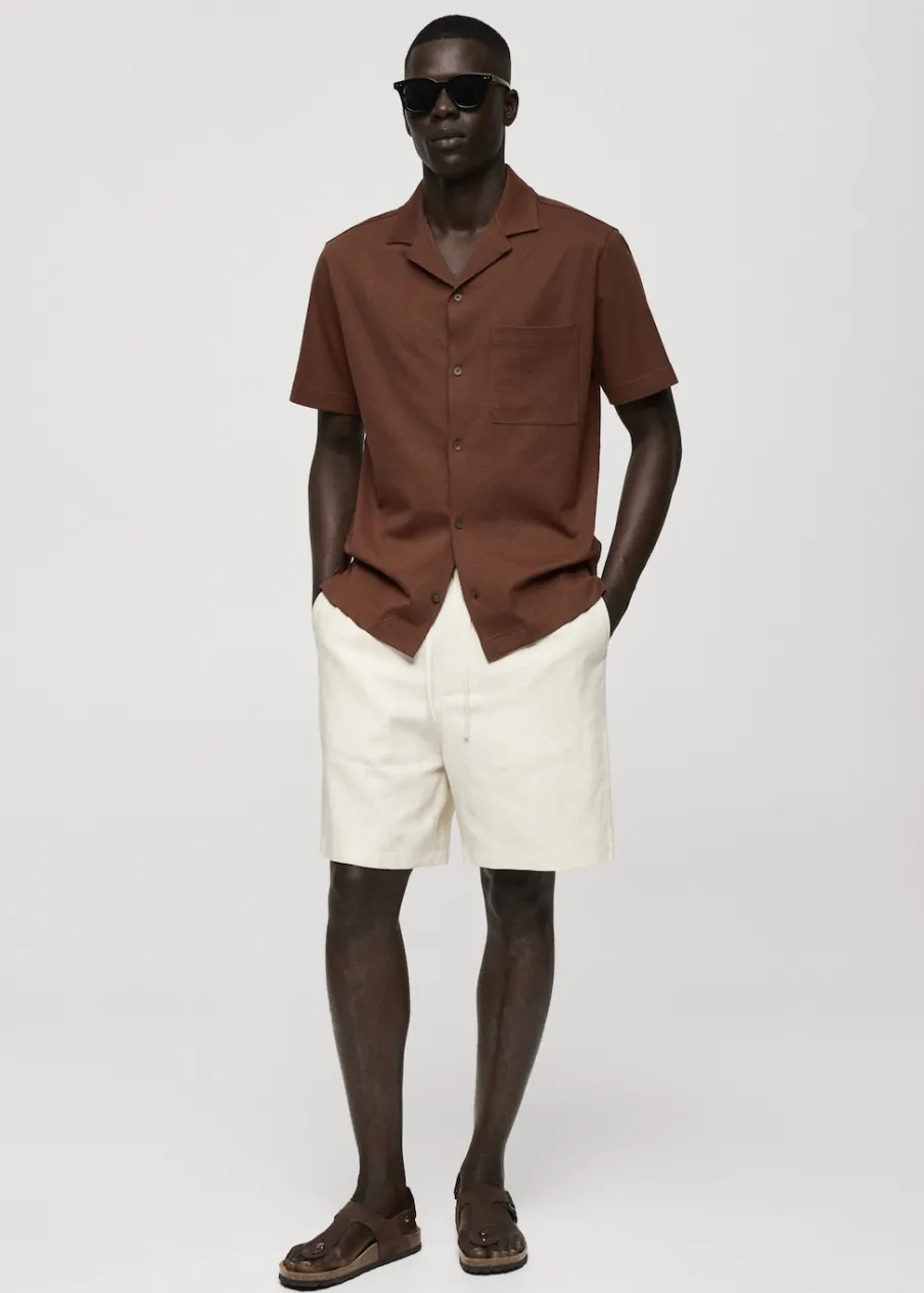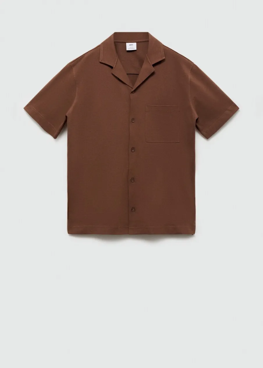 Krój regular. Ciężka tkanina bawełniana. Kołnierzyk typu bowling. Zapięcie z przodu na guziki. Kieszeń nakładana na piersi. Krótki rękaw. Prosty dół. Model ma 187 cm wzrostu i nosi rozmiar M. Tkanina z 100% bawełny.