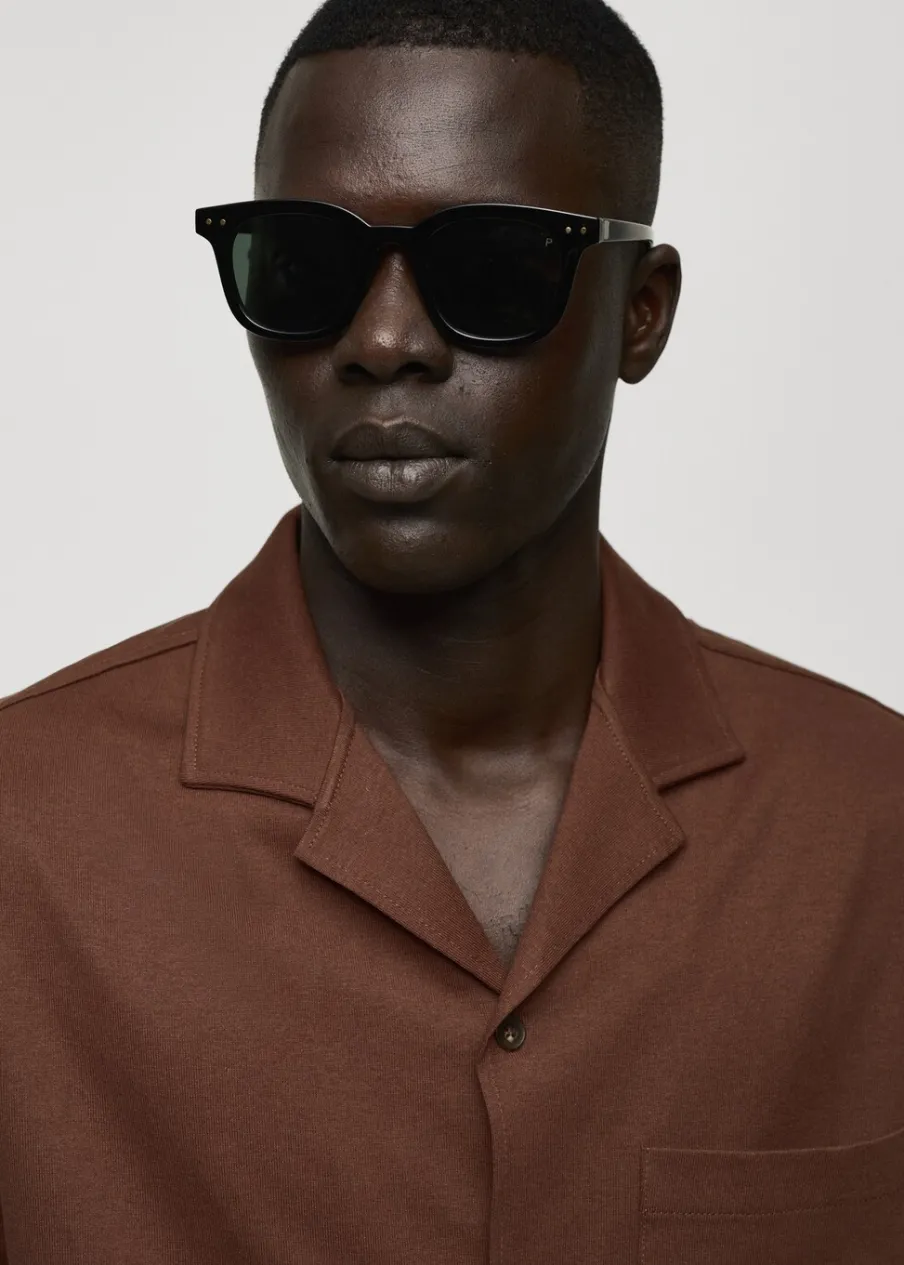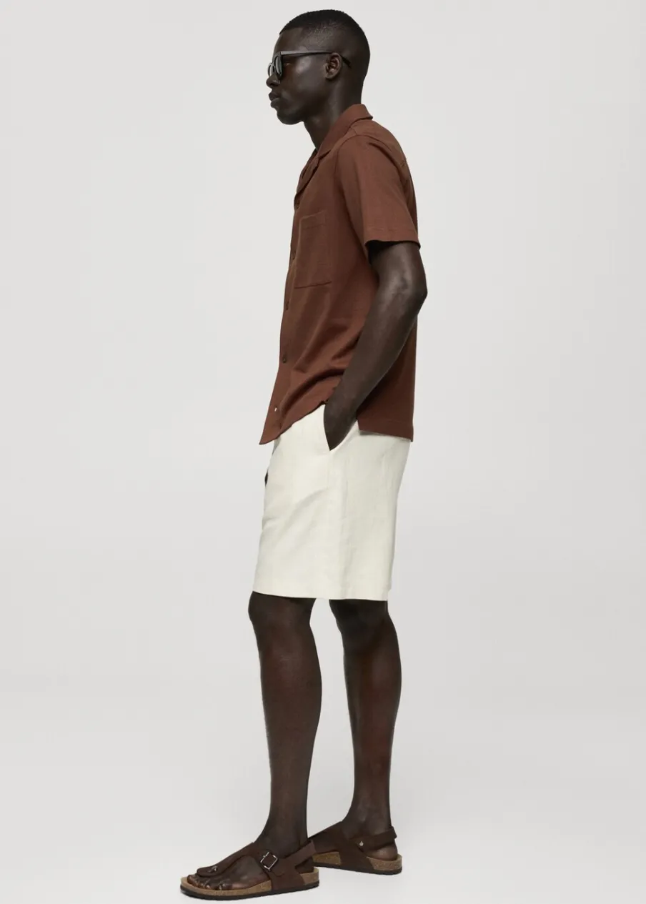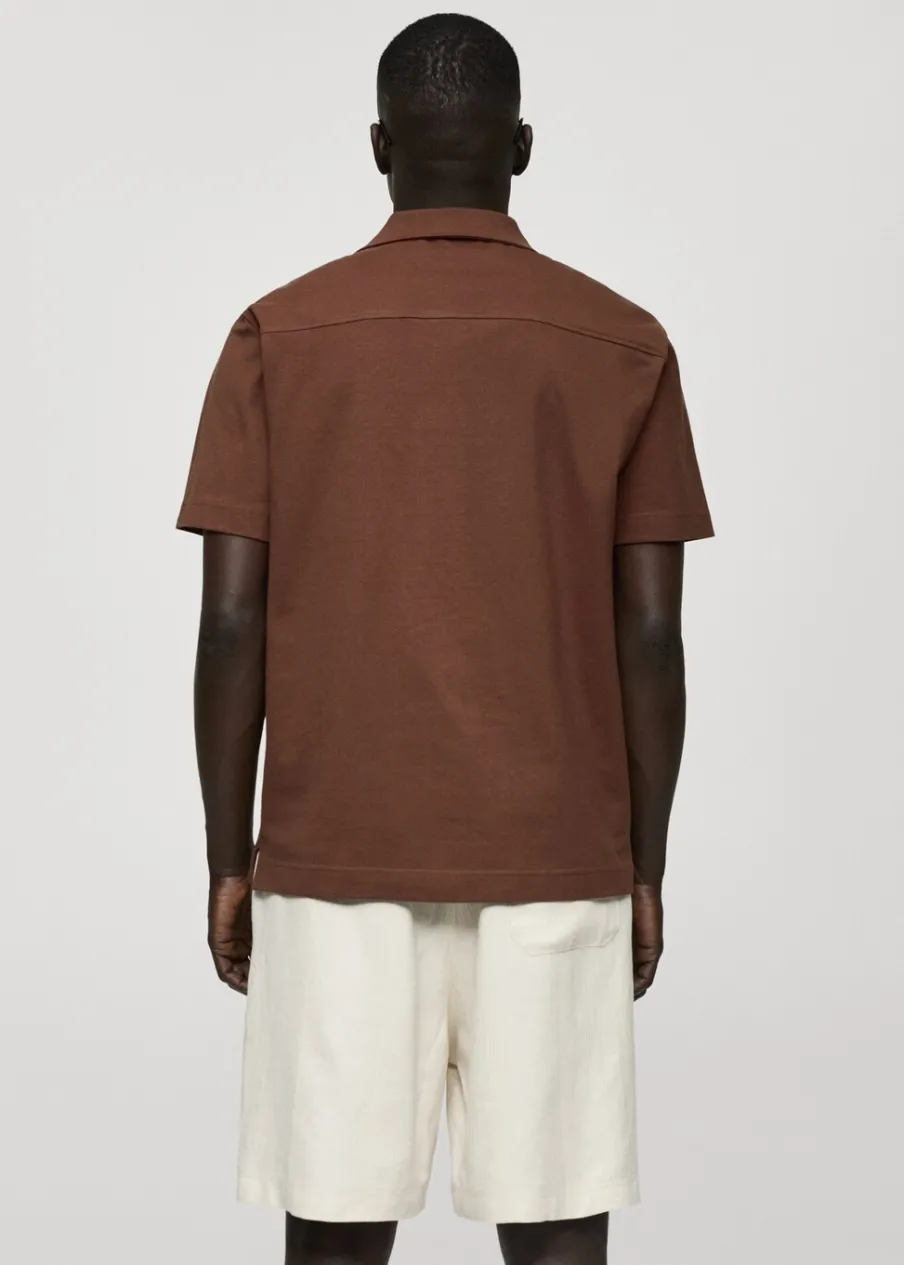 Krój regular. Ciężka tkanina bawełniana. Kołnierzyk typu bowling. Zapięcie z przodu na guziki. Kieszeń nakładana na piersi. Krótki rękaw. Prosty dół. Model ma 187 cm wzrostu i nosi rozmiar M. Tkanina z 100% bawełny.