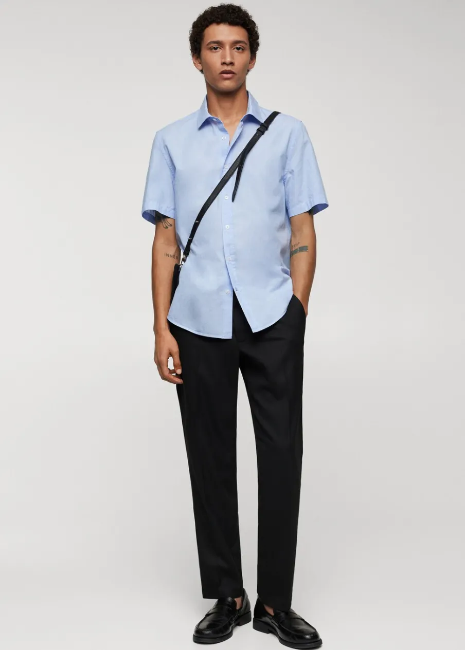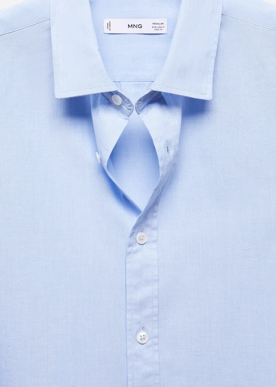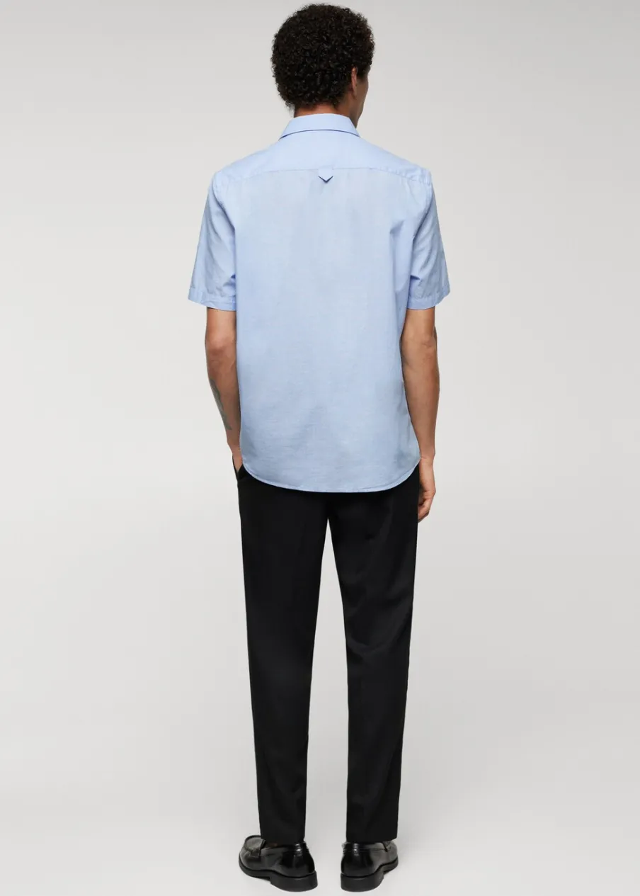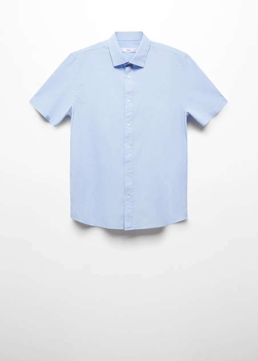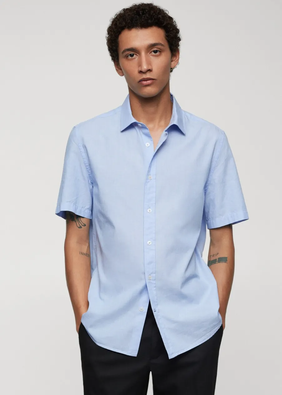 Cienka tkanina. Krój regular. Krótki rękaw. Model ma 190 cm wzrostu i nosi rozmiar M. Zapięcie na guziki z przodu. Tkanina z 100% bawełny. Klasyczny kołnierzyk. Zaokrąglony dół.