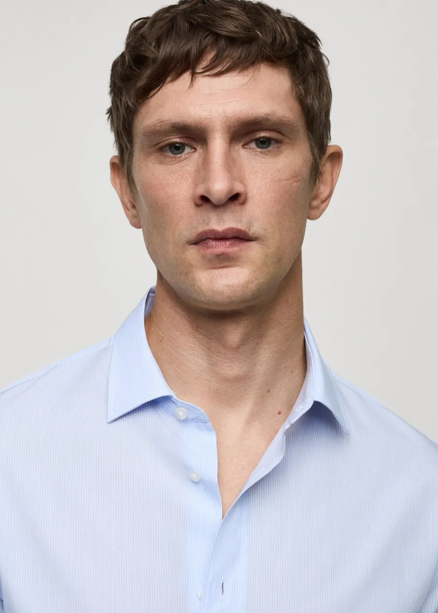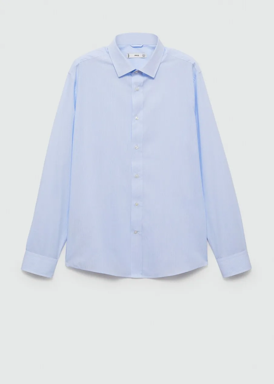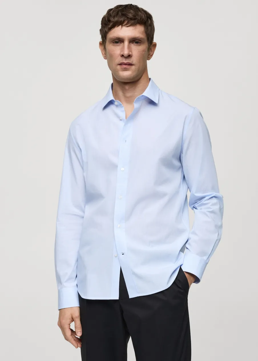 Krój regular. Koszulowy kołnierz. Zapięcie z przodu na guziki. Długi rękaw z guzikami na mankietach. Model ma 185 cm wzrostu i nosi rozmiar M. Tkanina z 100% bawełny. Zaokrąglony dół.