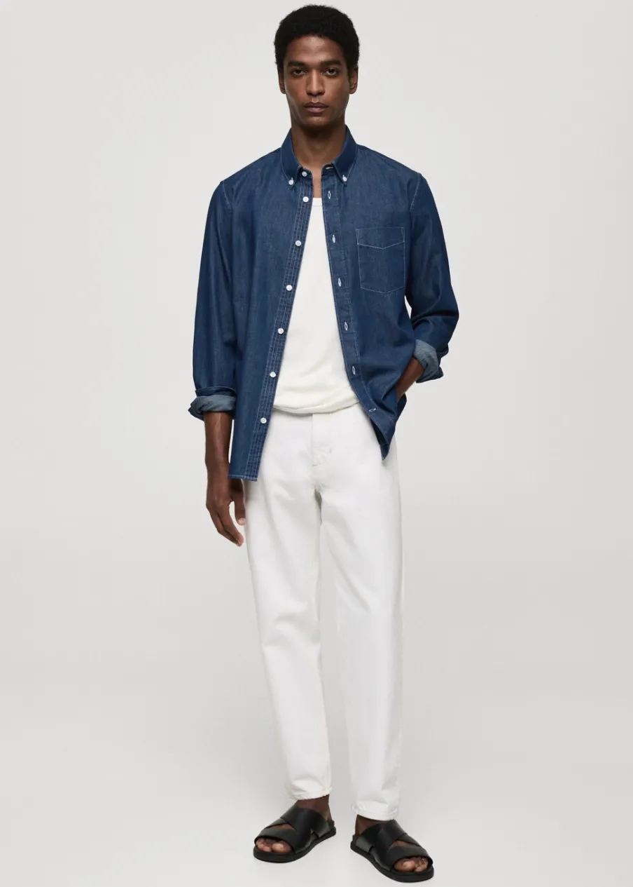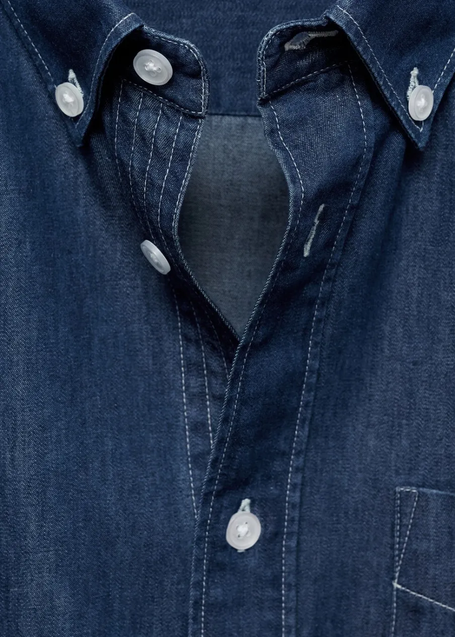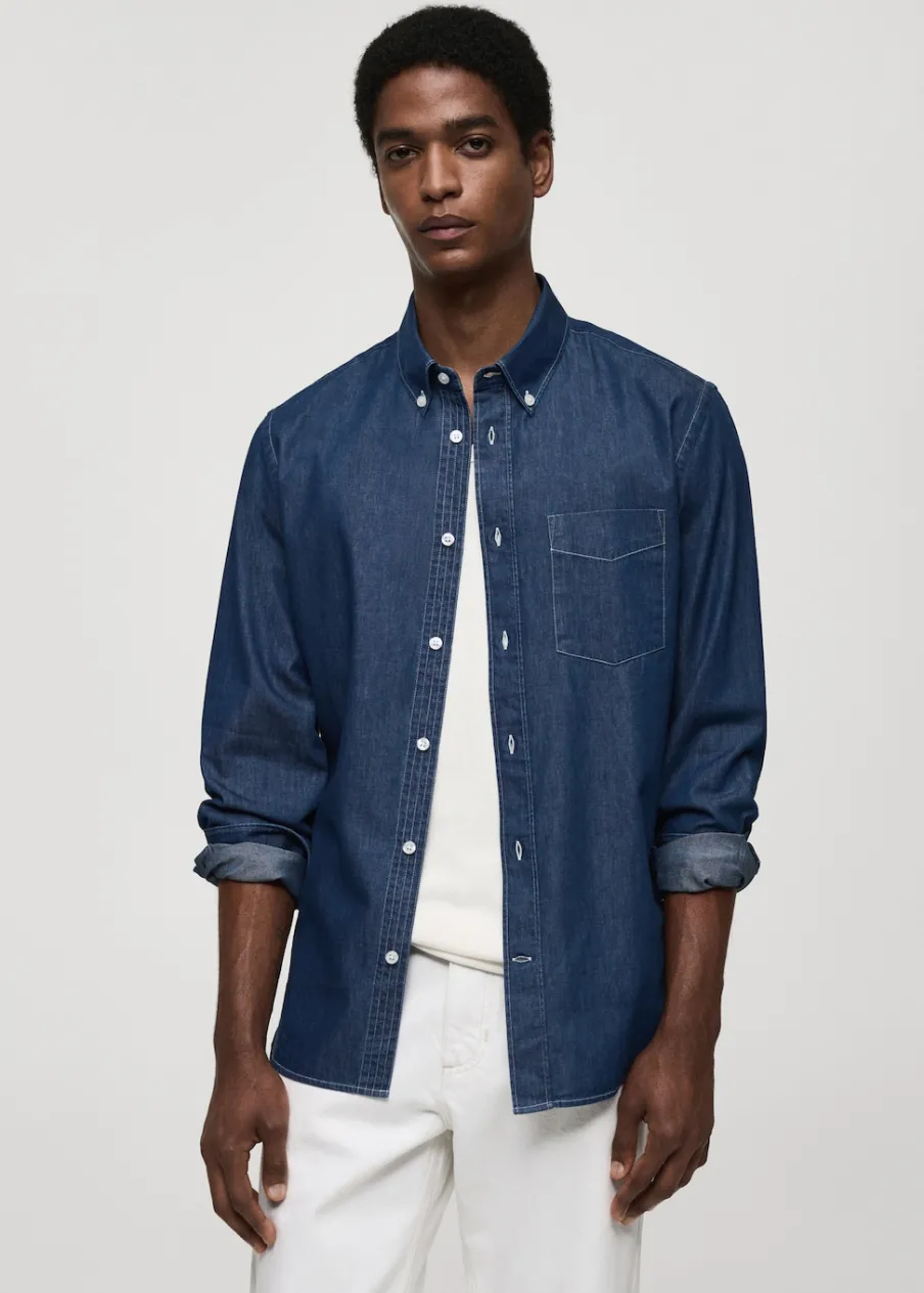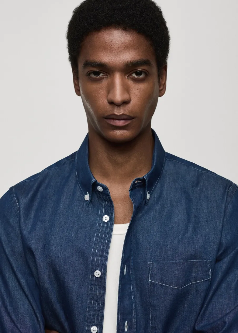 Krój regular. Tkanina z 100% bawełny. Bawełniana tkanina chambray. Zapięcie z przodu na guziki. Długi rękaw z guzikami na mankietach. Kieszeń nakładana na piersi. Zapinany kołnierzyk. Zaokrąglony dół. Model ma 185 cm wzrostu i nosi rozmiar M.