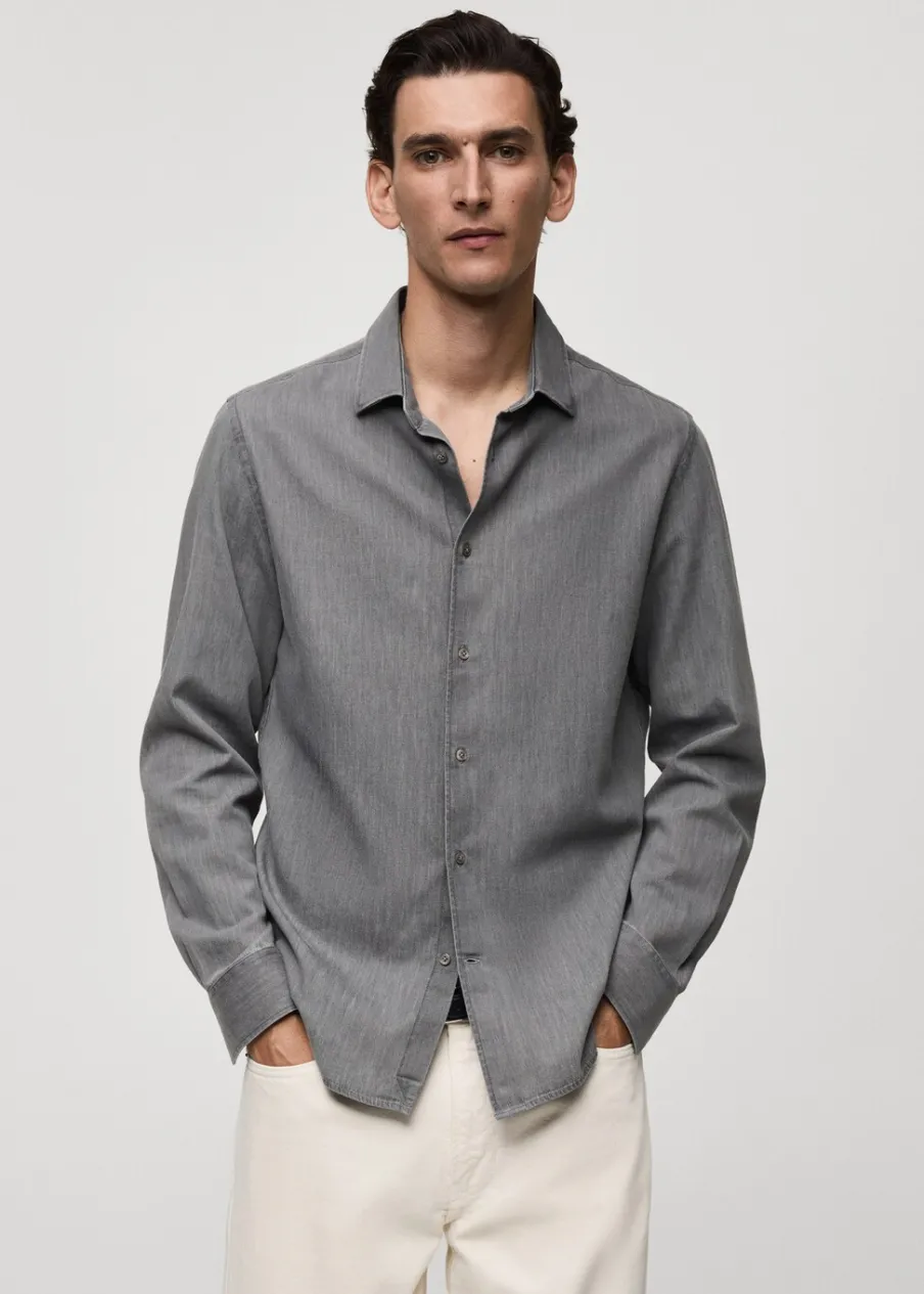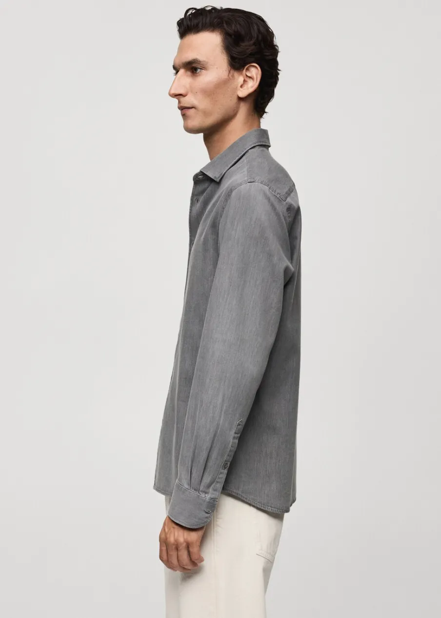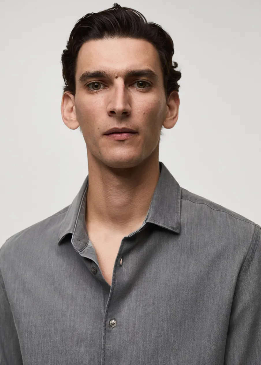 OpisKrój regular. Bawełniana tkanina chambray. Koszulowy kołnierz. Długi rękaw z guzikami na mankietach. Model ma 1…