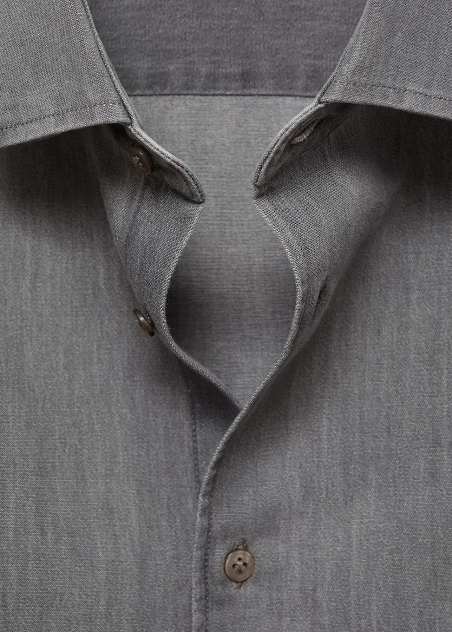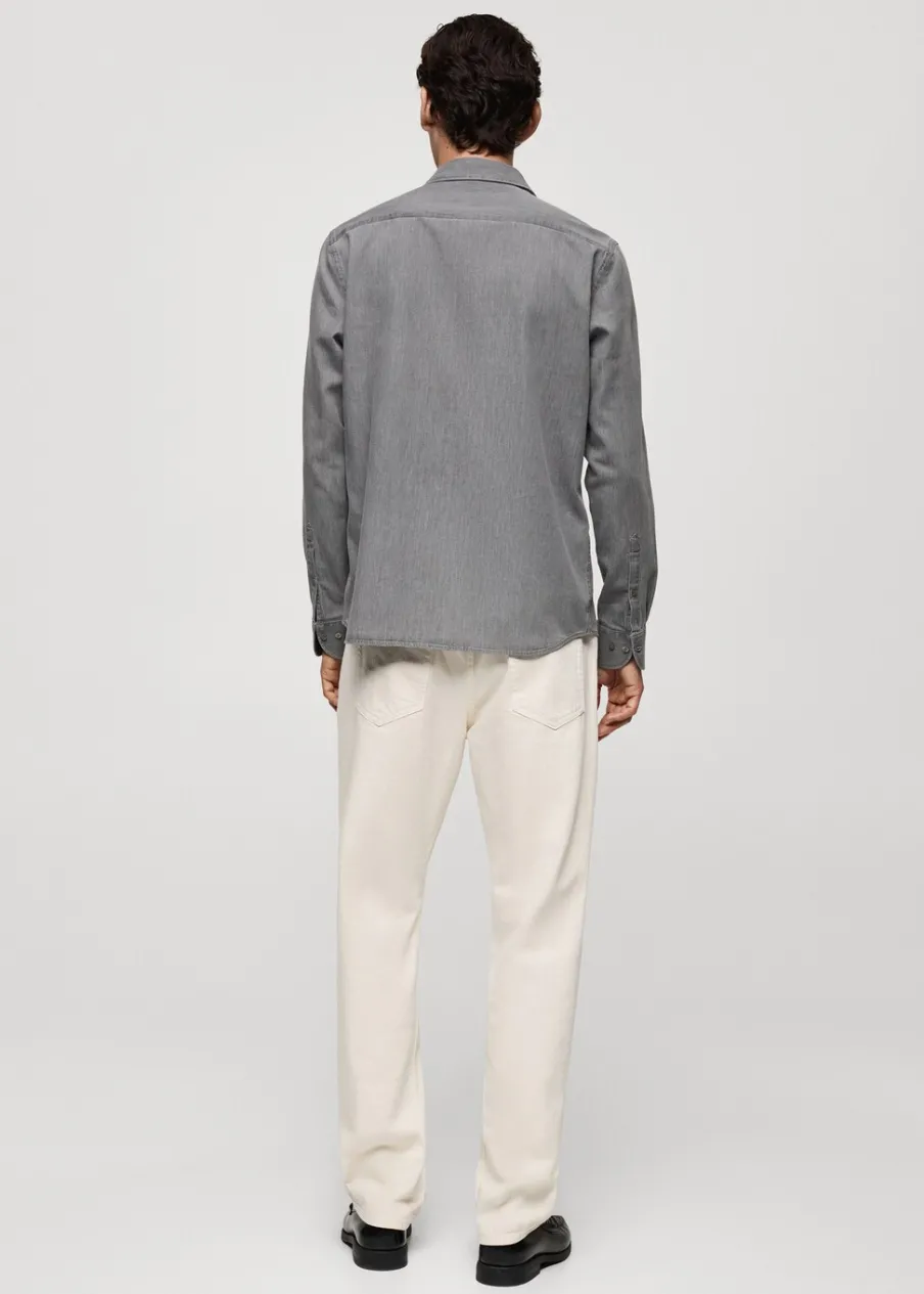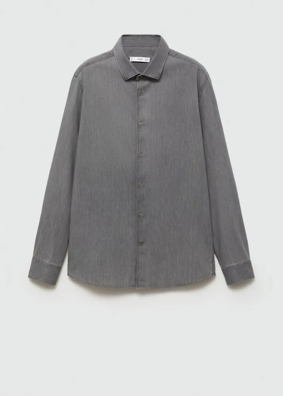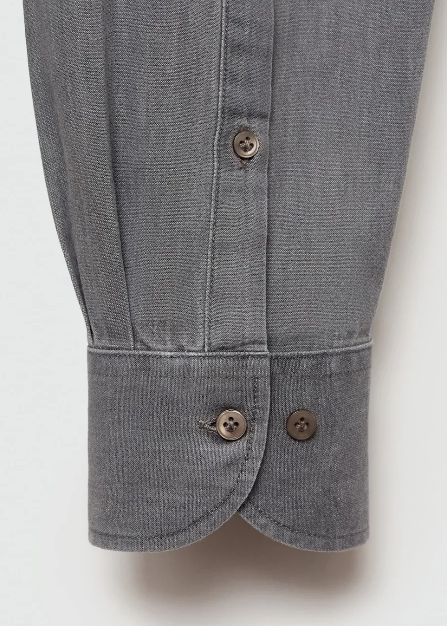 OpisKrój regular. Bawełniana tkanina chambray. Koszulowy kołnierz. Długi rękaw z guzikami na mankietach. Model ma 1…