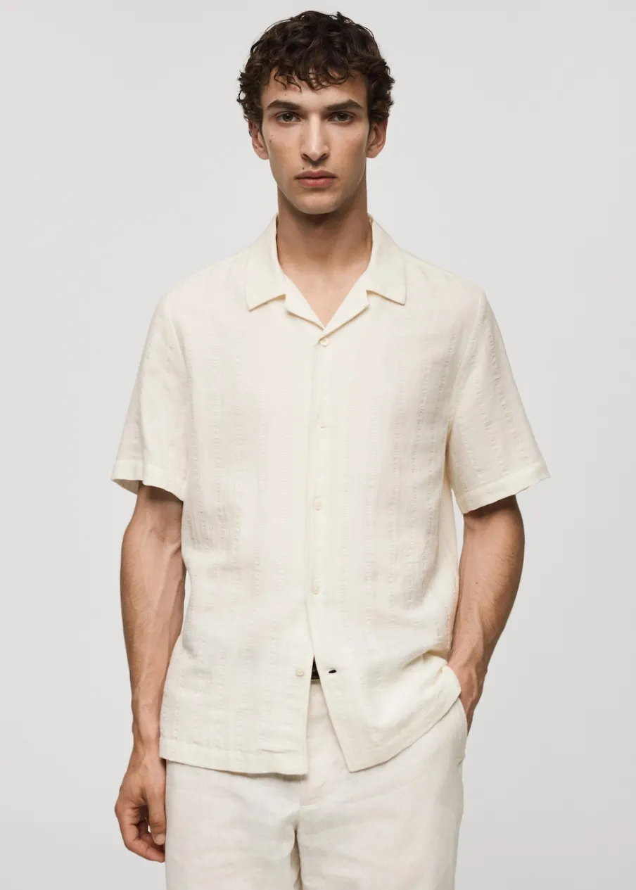 OpisKrój regular. Tkanina seersucker. Kołnierzyk typu bowling. Krótki rękaw. Prosty dół z rozcięciami po bokach. …