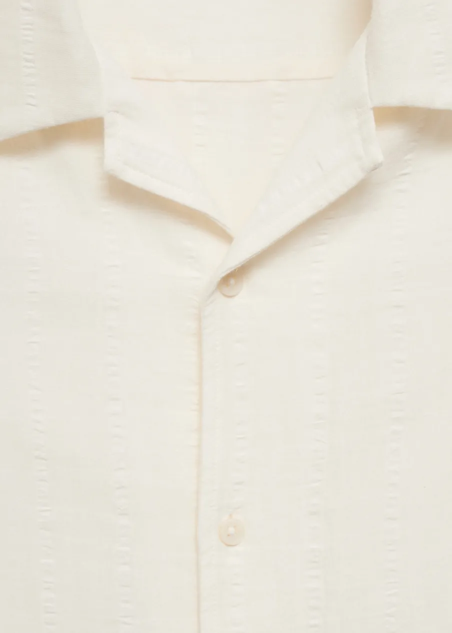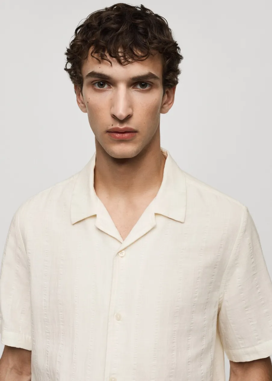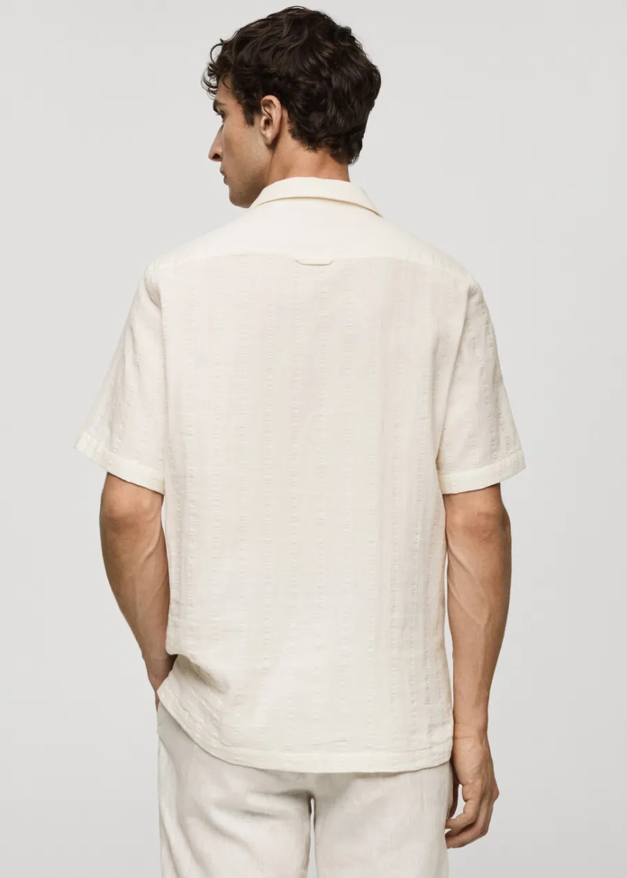Krój regular. Tkanina seersucker. Kołnierzyk typu bowling. Krótki rękaw. Prosty dół z rozcięciami po bokach. Model ma 185 cm wzrostu i nosi rozmiar M. Zapięcie na guziki z przodu. Tkanina z 100% bawełny.