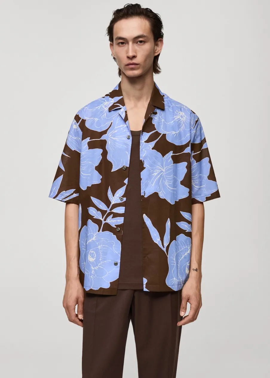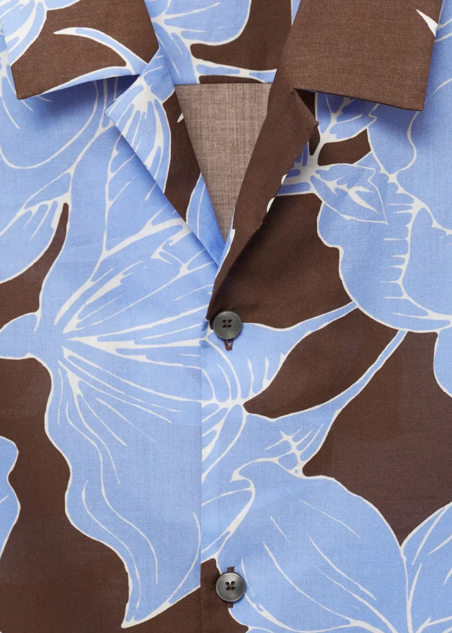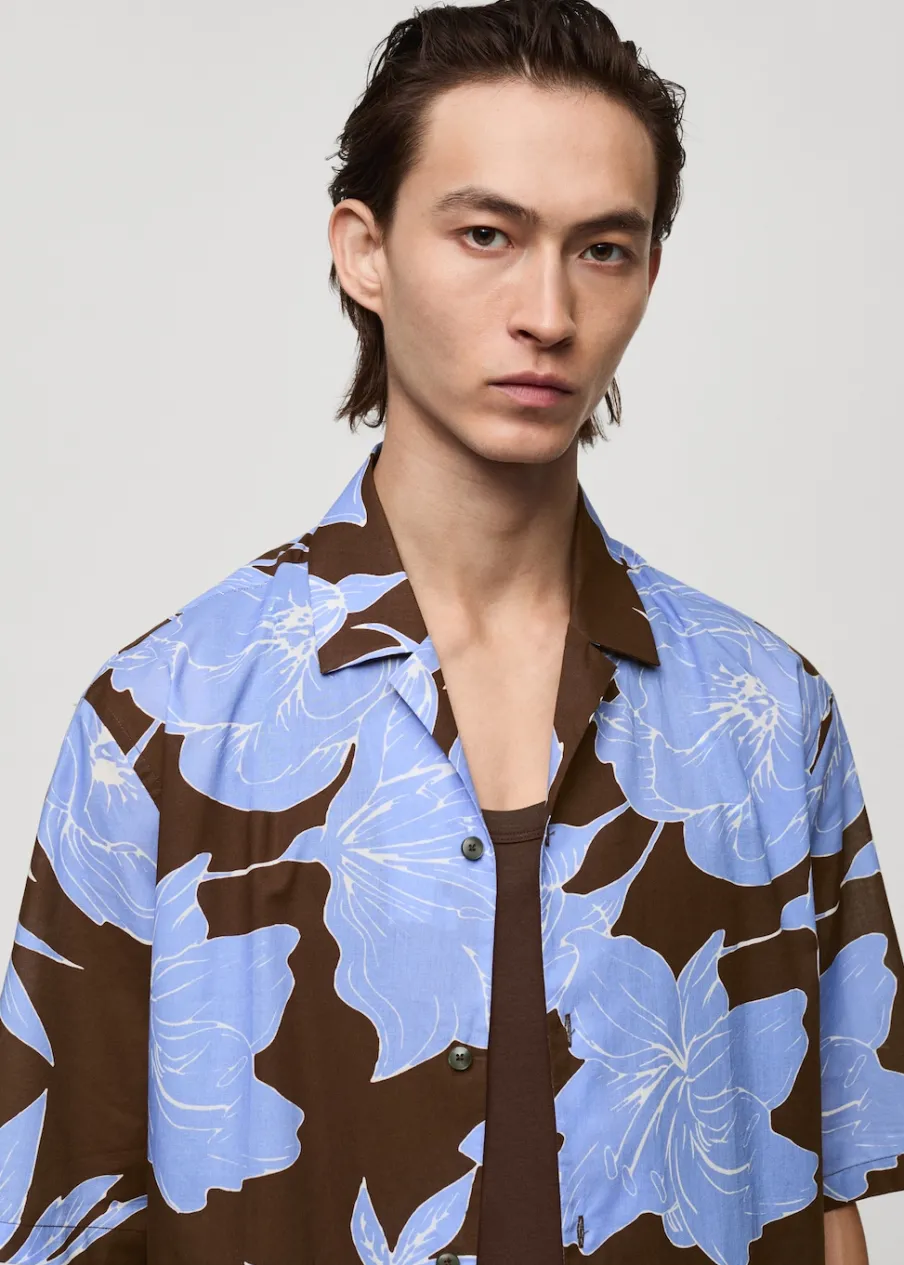 Krój regular. Tropikalny wzór. Kołnierzyk typu bowling. Zapięcie z przodu na guziki. Krótki rękaw. Prosty dół. Model ma 185 cm wzrostu i nosi rozmiar M. Tkanina z 100% bawełny.