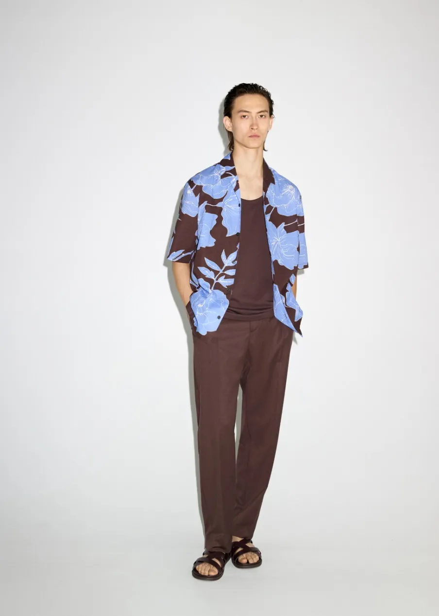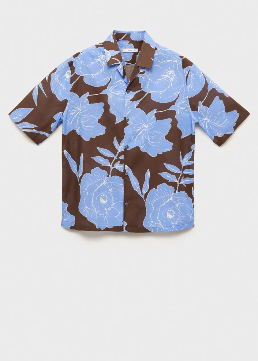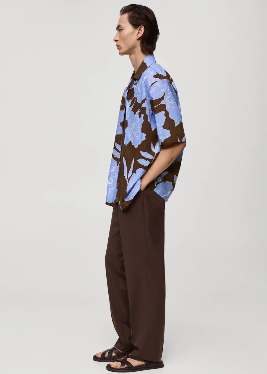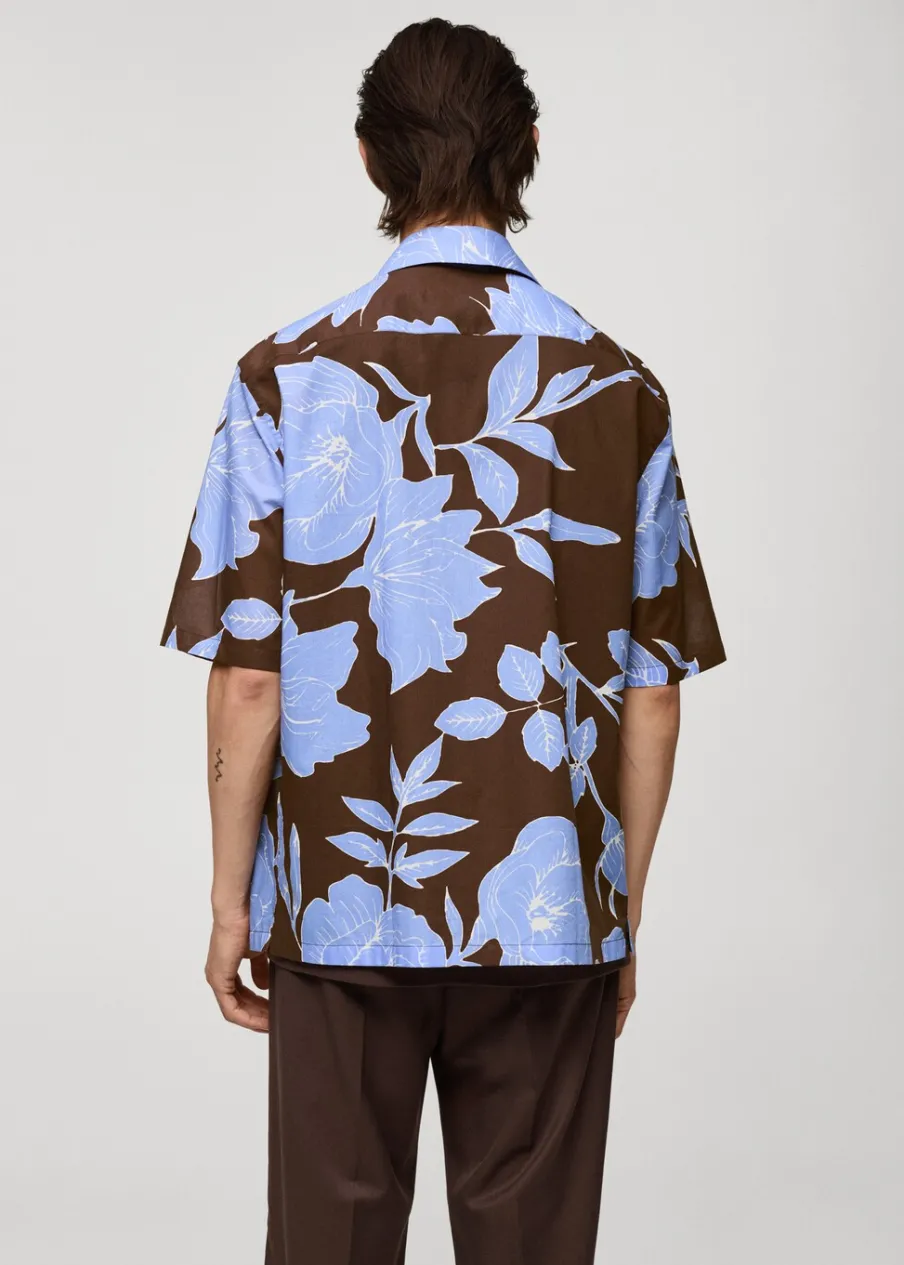 Krój regular. Tropikalny wzór. Kołnierzyk typu bowling. Zapięcie z przodu na guziki. Krótki rękaw. Prosty dół. Model ma 185 cm wzrostu i nosi rozmiar M. Tkanina z 100% bawełny.