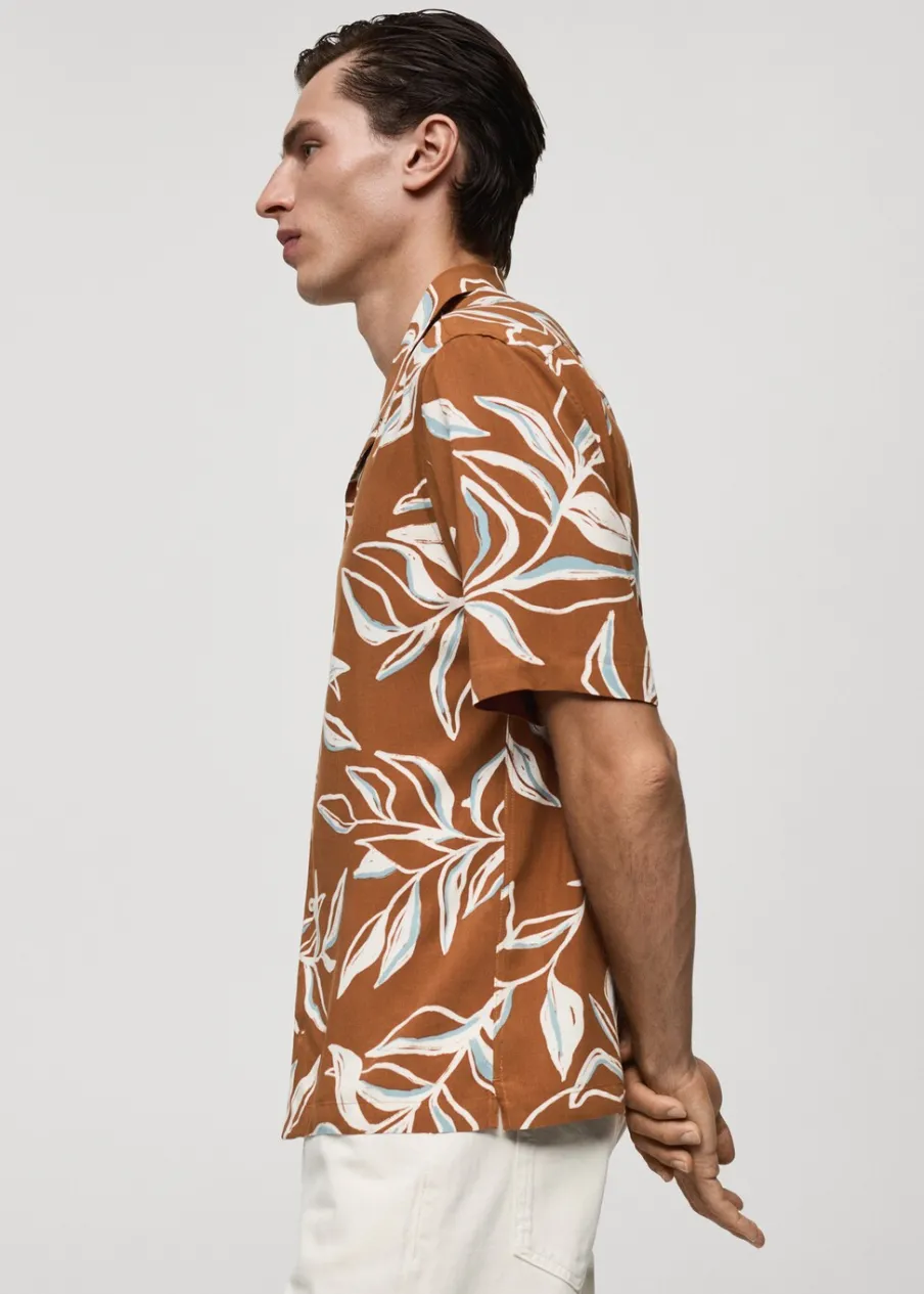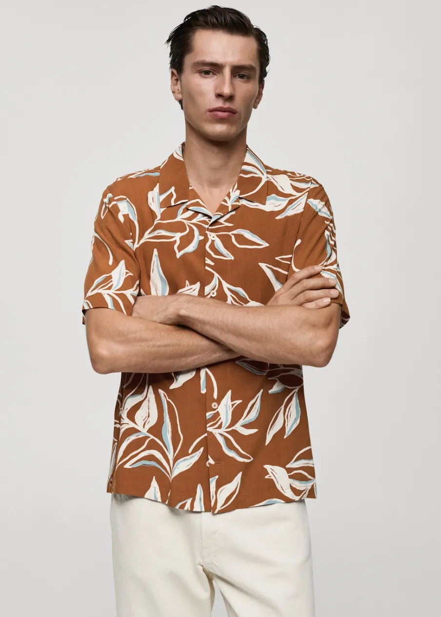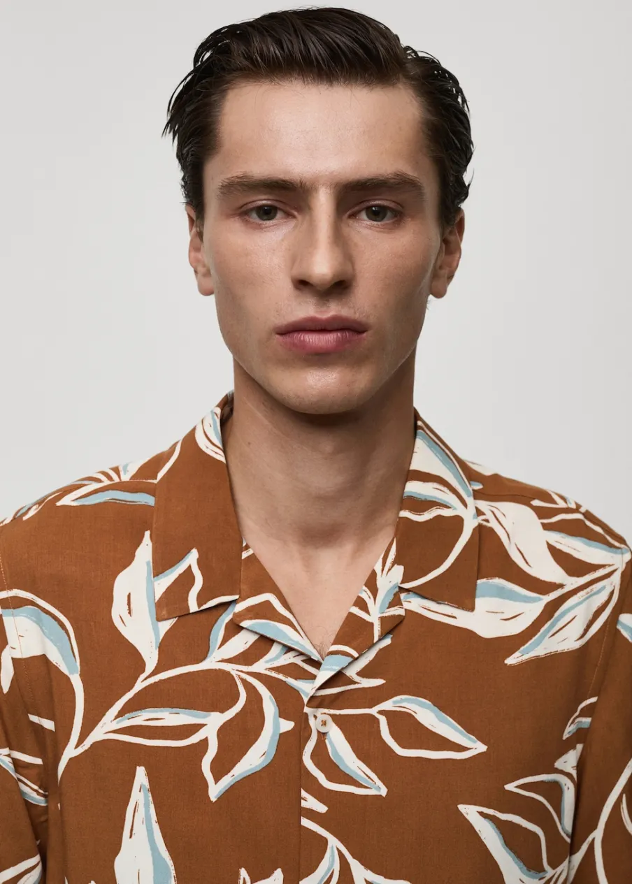 Krój regular. Kwiatowy wzór. Krótki rękaw. Kołnierzyk typu bowling. Zapięcie na guziki. Model ma 185 cm wzrostu i nosi rozmiar M.