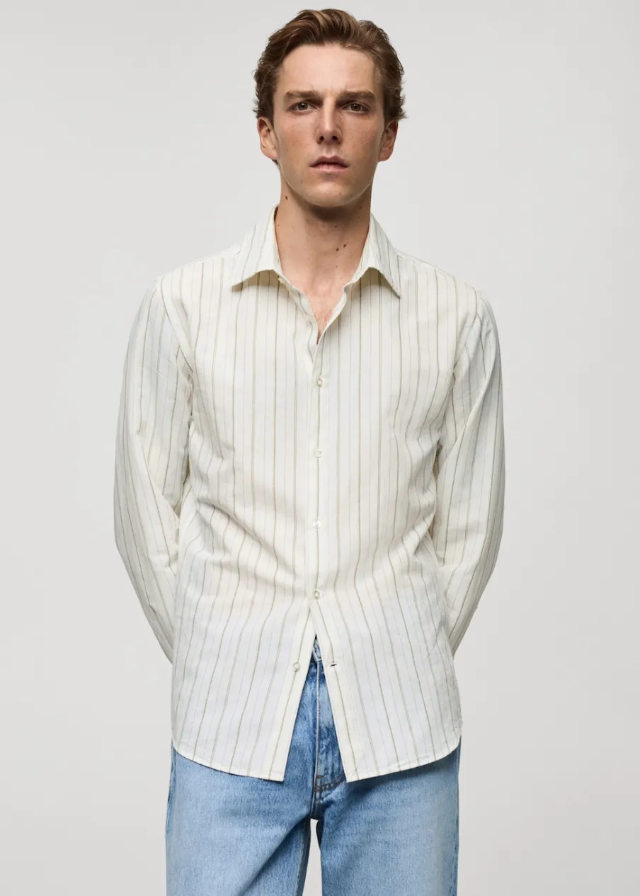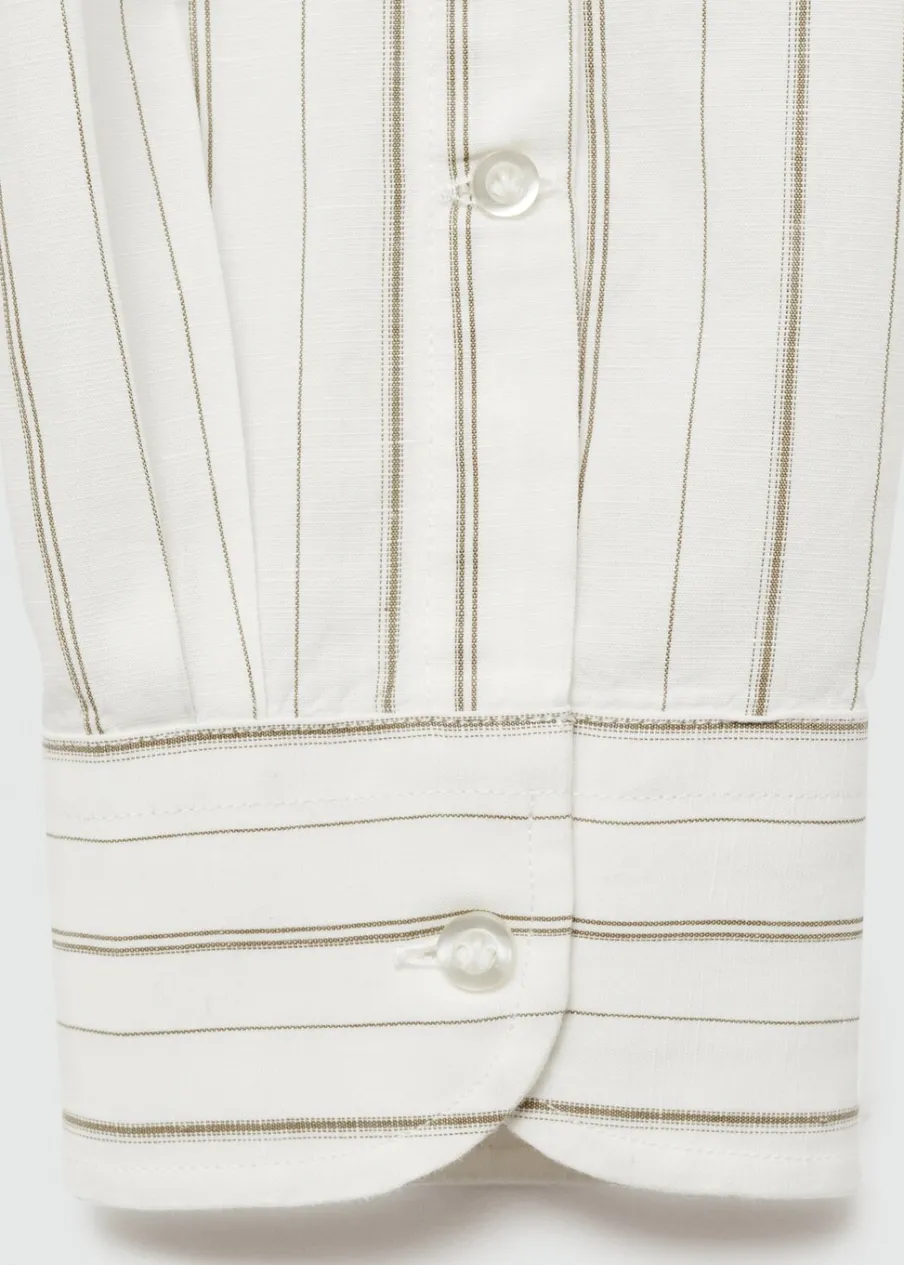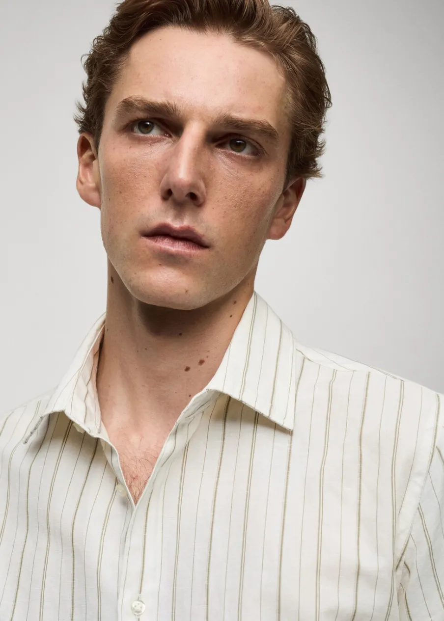 Krój regular. Tkanina mieszanka bawełny i lnu. Nadruk w pionowe paski. Koszulowy kołnierz. Zapięcie z przodu na guziki. Długi rękaw z guzikami na mankietach. Model ma 185 cm wzrostu i nosi rozmiar M. Zaokrąglony dół.
