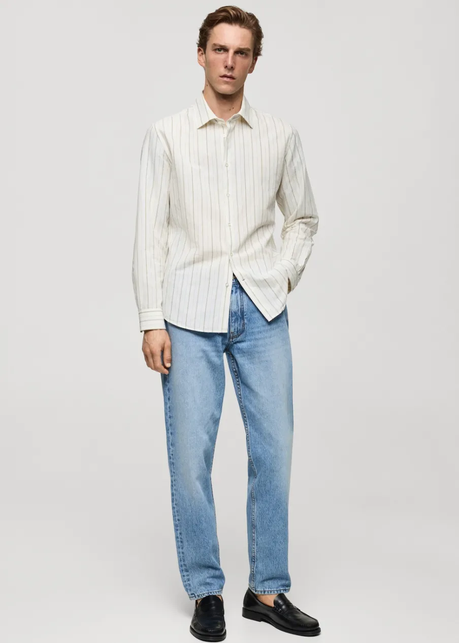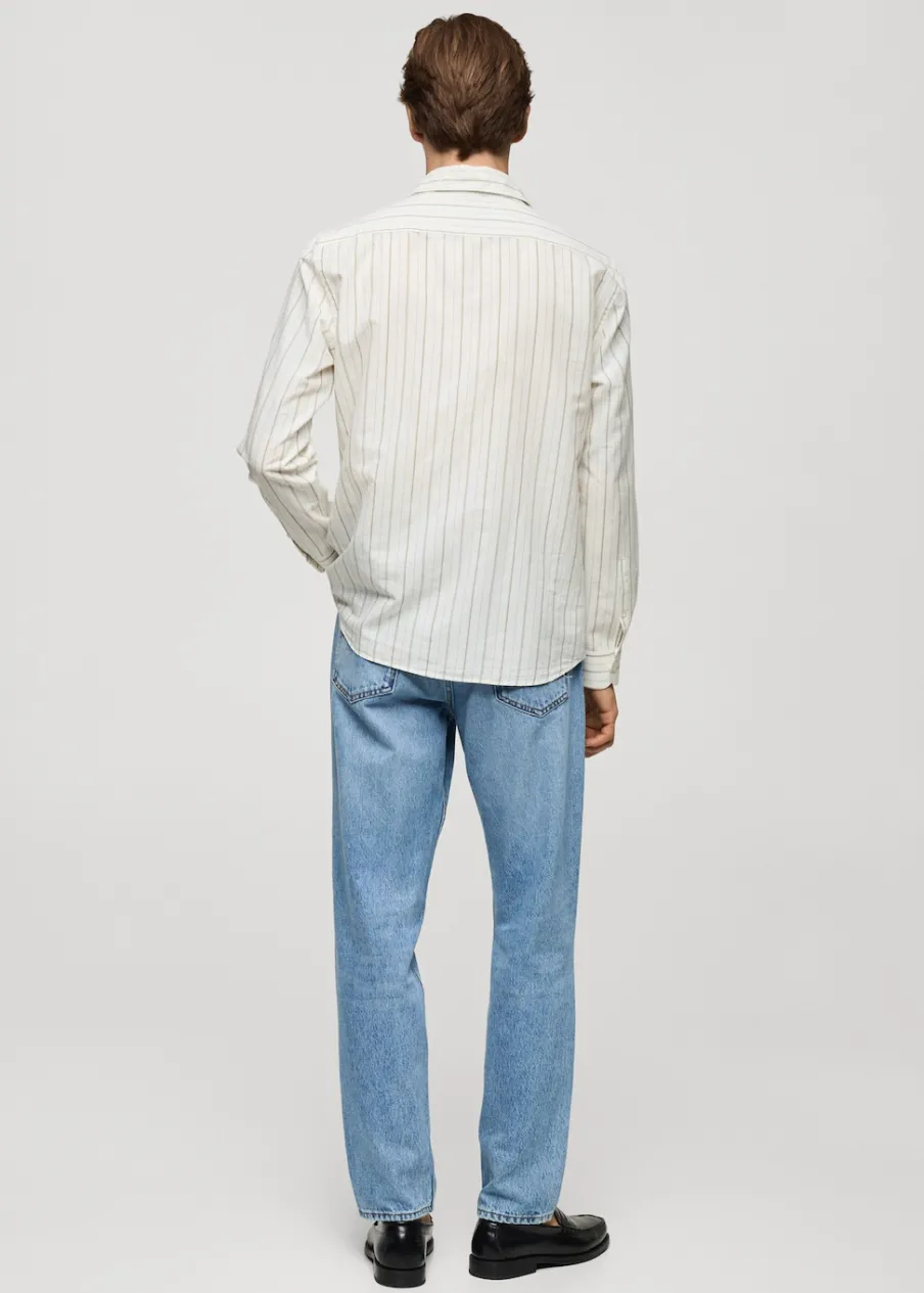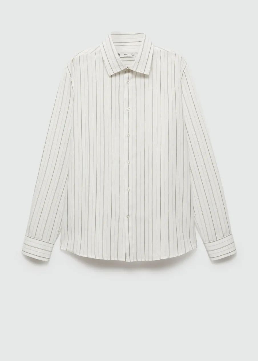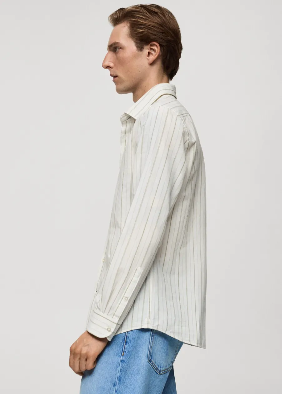 Krój regular. Tkanina mieszanka bawełny i lnu. Nadruk w pionowe paski. Koszulowy kołnierz. Zapięcie z przodu na guziki. Długi rękaw z guzikami na mankietach. Model ma 185 cm wzrostu i nosi rozmiar M. Zaokrąglony dół.