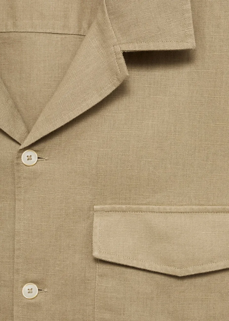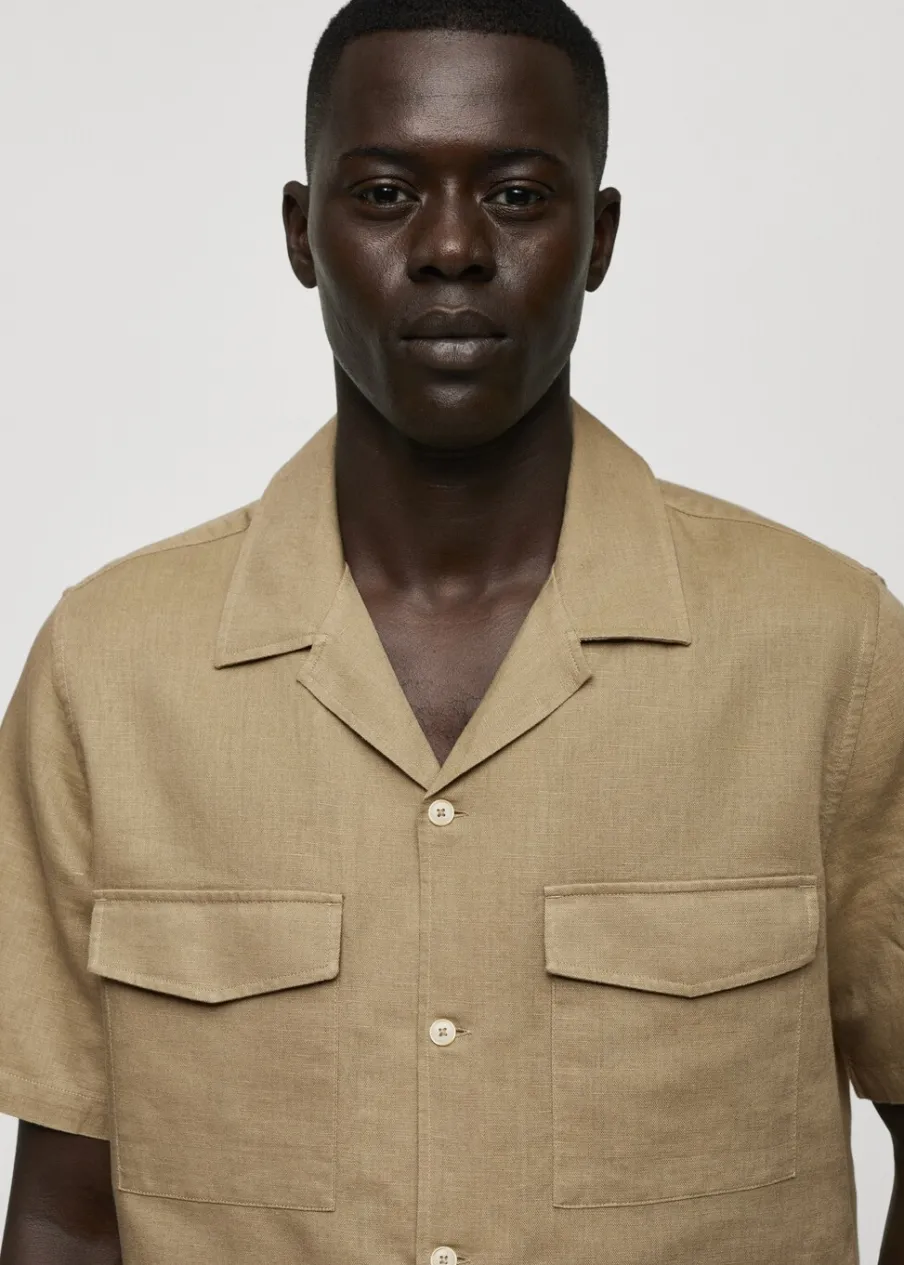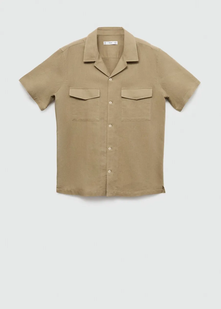 Krój regular. Tkanina z mieszanki lnu i bawełny. Kołnierzyk typu bowling. Krótki rękaw. Zapięcie z przodu na guziki. Dwie naszywane kieszenie z patkami z przodu. Prosty dół z rozcięciami po bokach. Model ma 187 cm wzrostu i nosi rozmiar M.