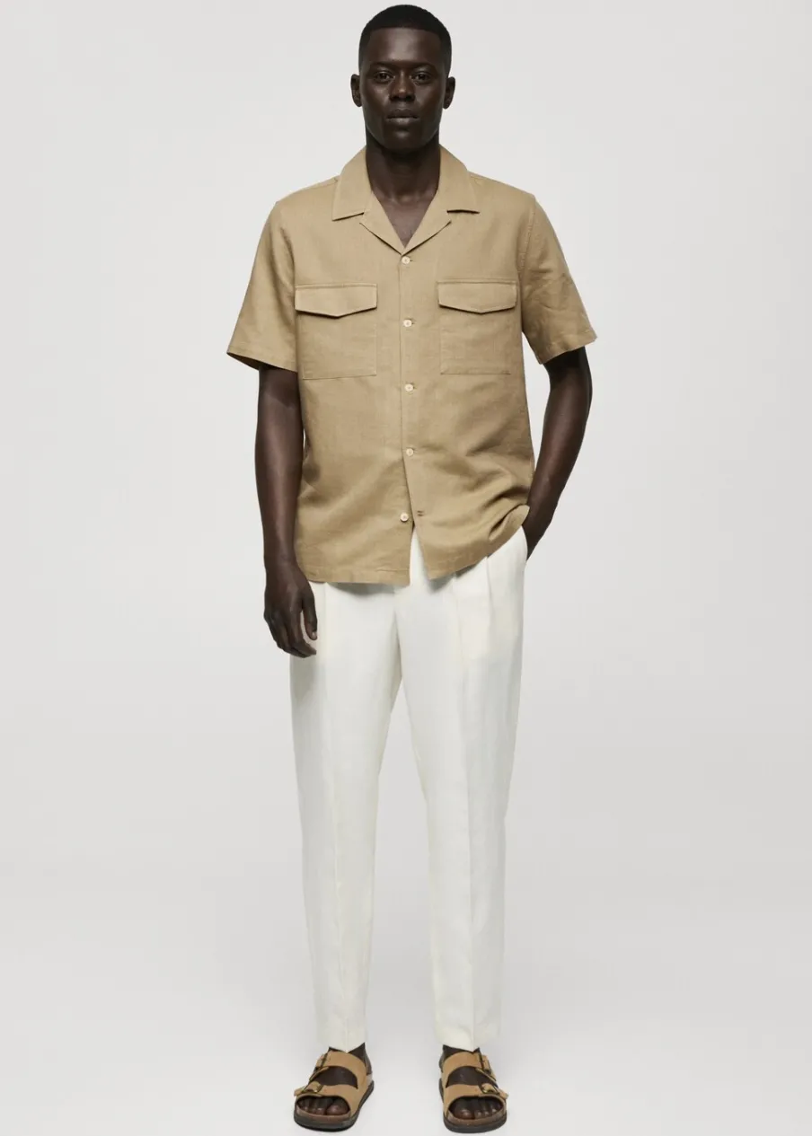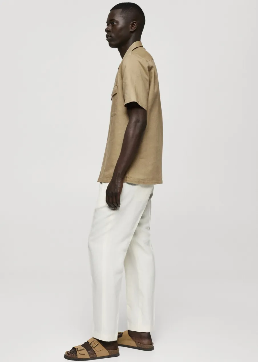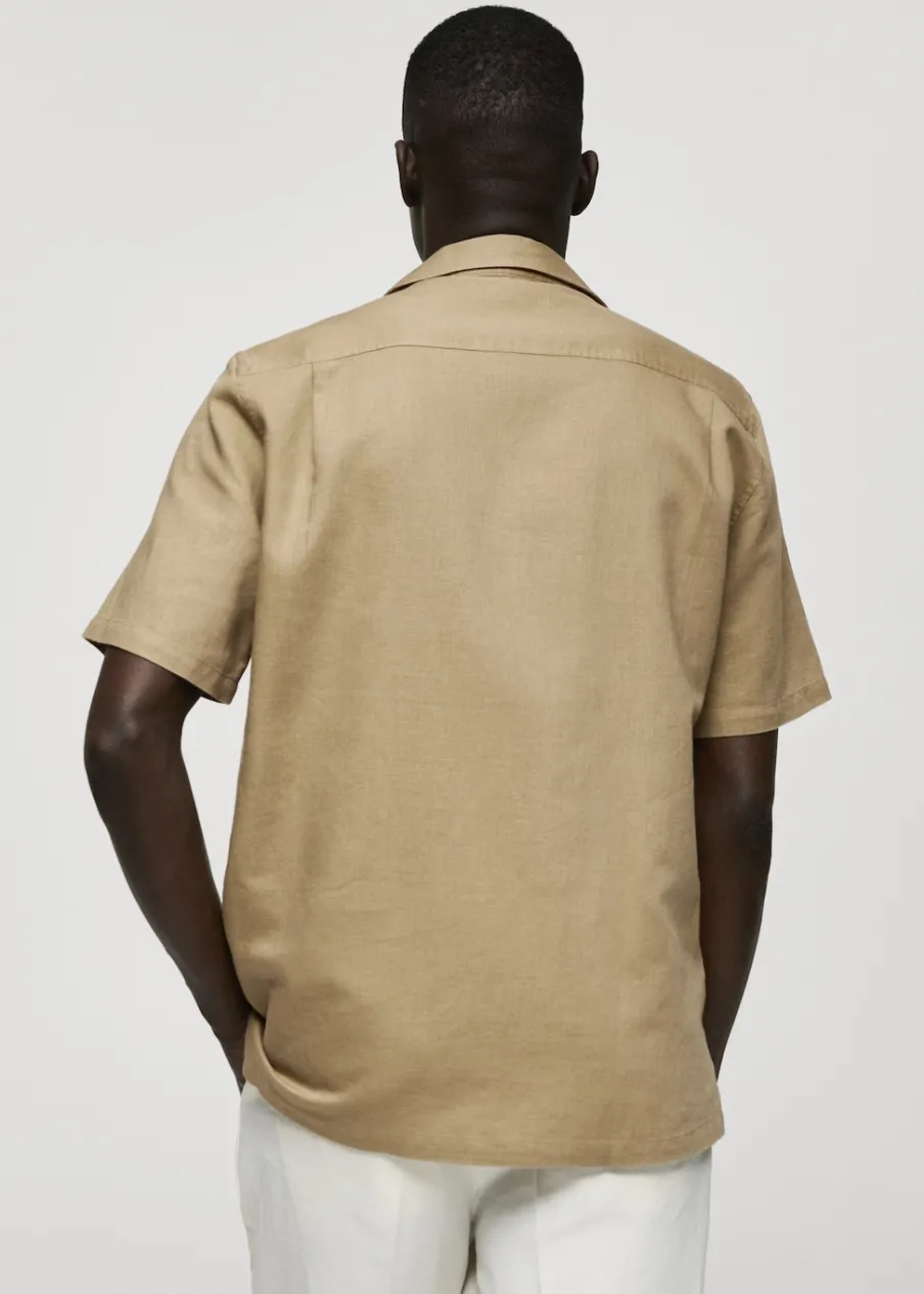 Krój regular. Tkanina z mieszanki lnu i bawełny. Kołnierzyk typu bowling. Krótki rękaw. Zapięcie z przodu na guziki. Dwie naszywane kieszenie z patkami z przodu. Prosty dół z rozcięciami po bokach. Model ma 187 cm wzrostu i nosi rozmiar M.