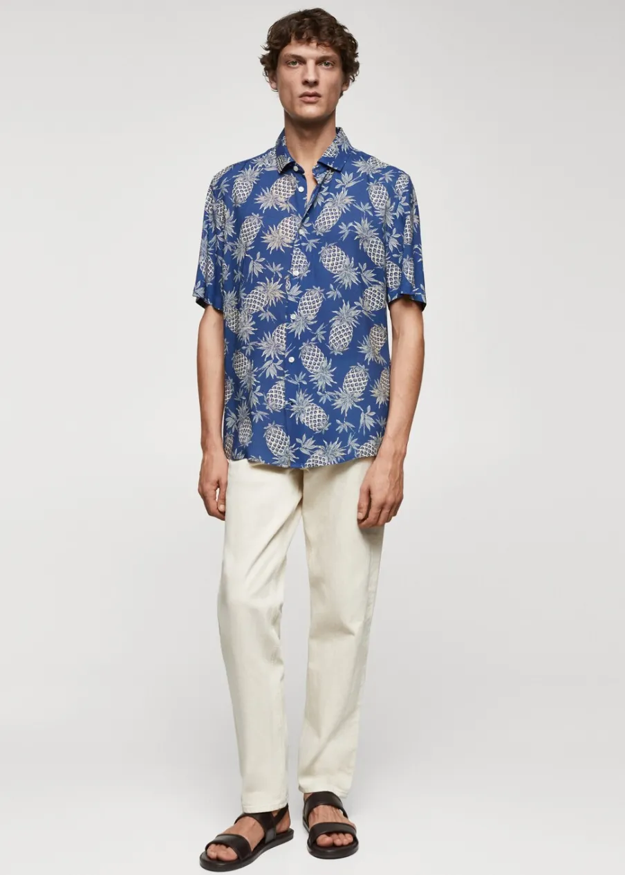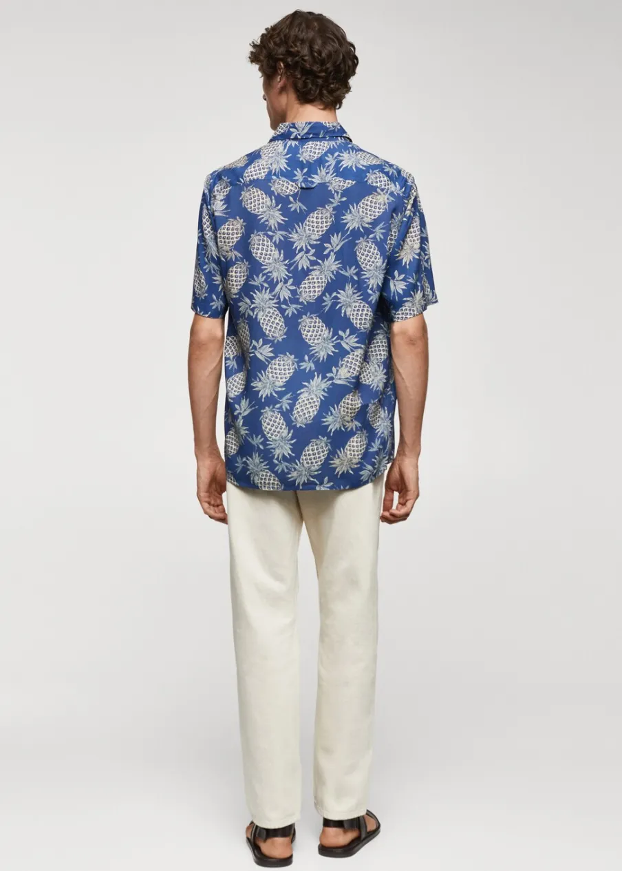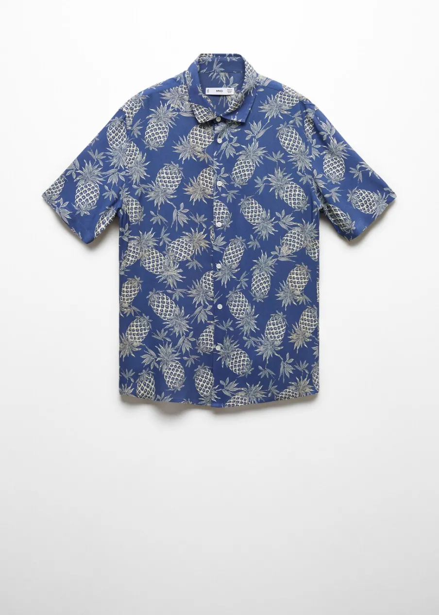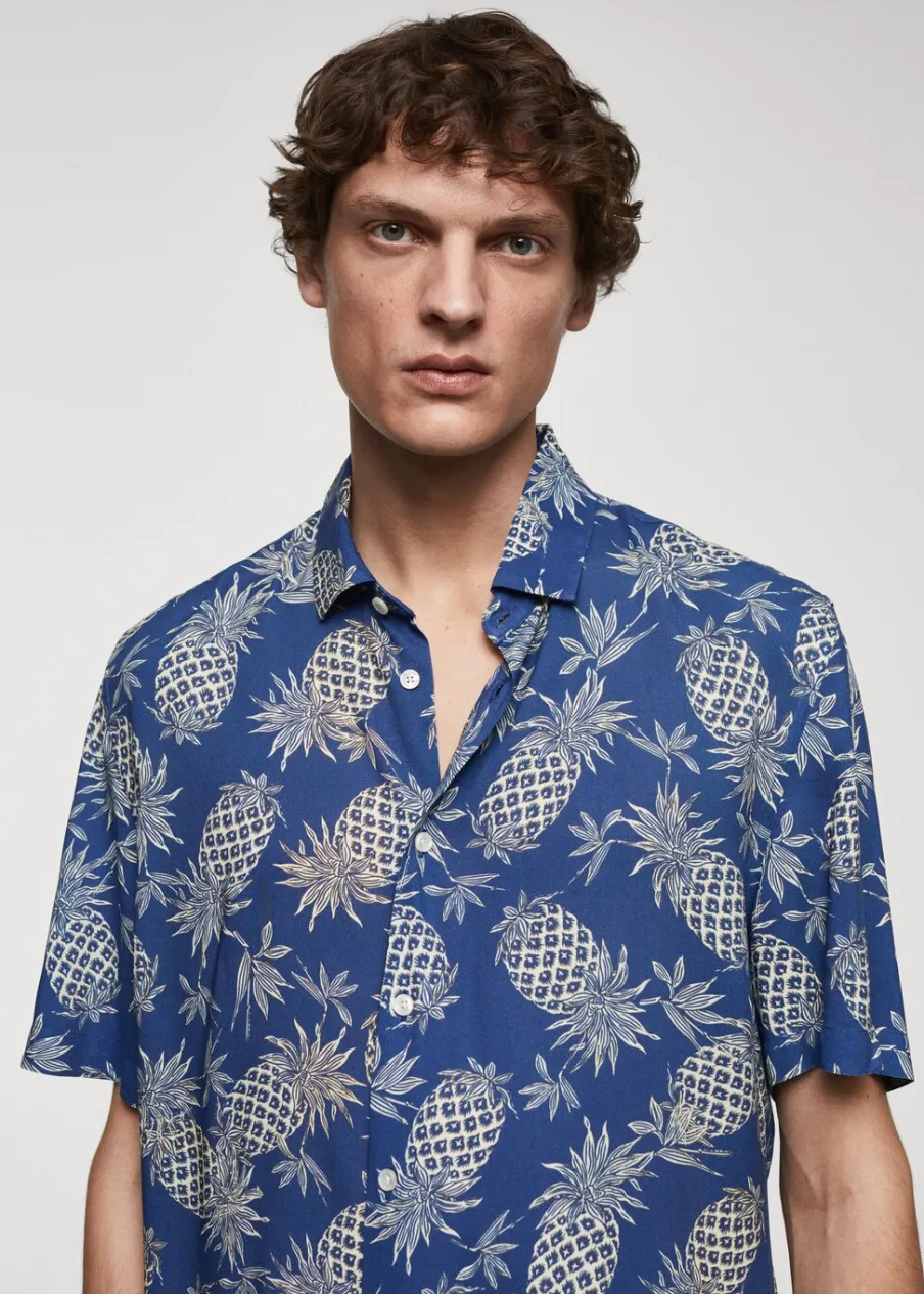 Krój regular. Koszulowy kołnierz. Krótki rękaw. Nadruk w ananasy. Prosty dół. Model ma 185 cm wzrostu i nosi rozmiar M. Zapięcie na guziki z przodu.