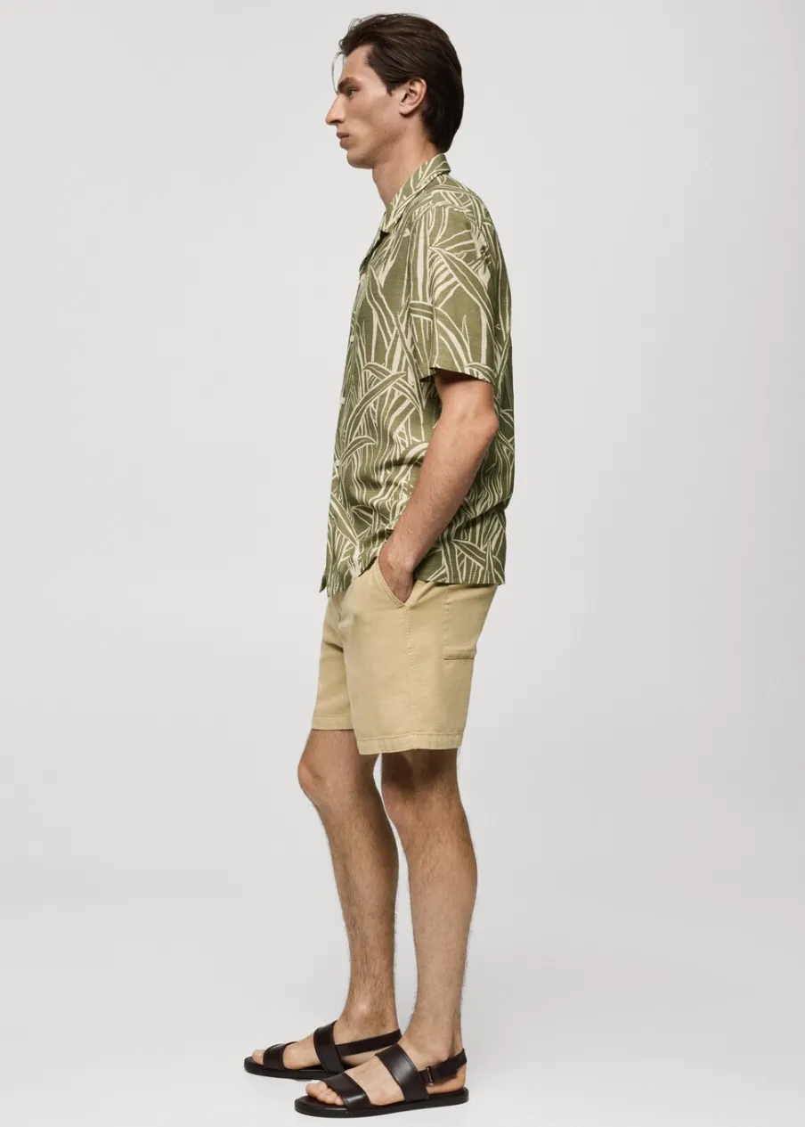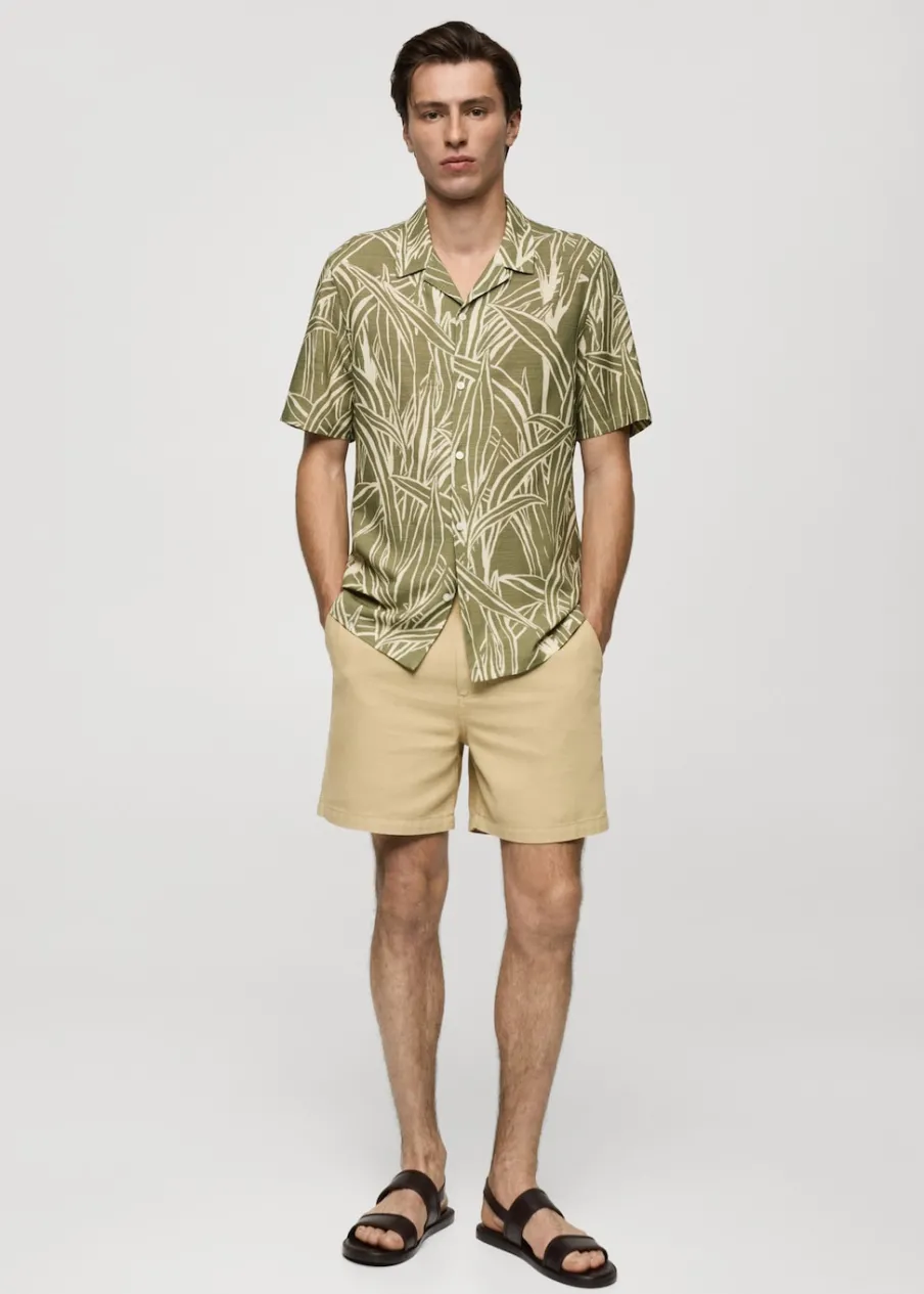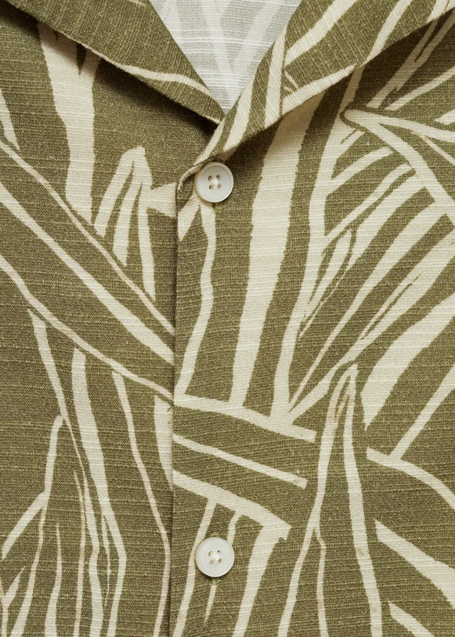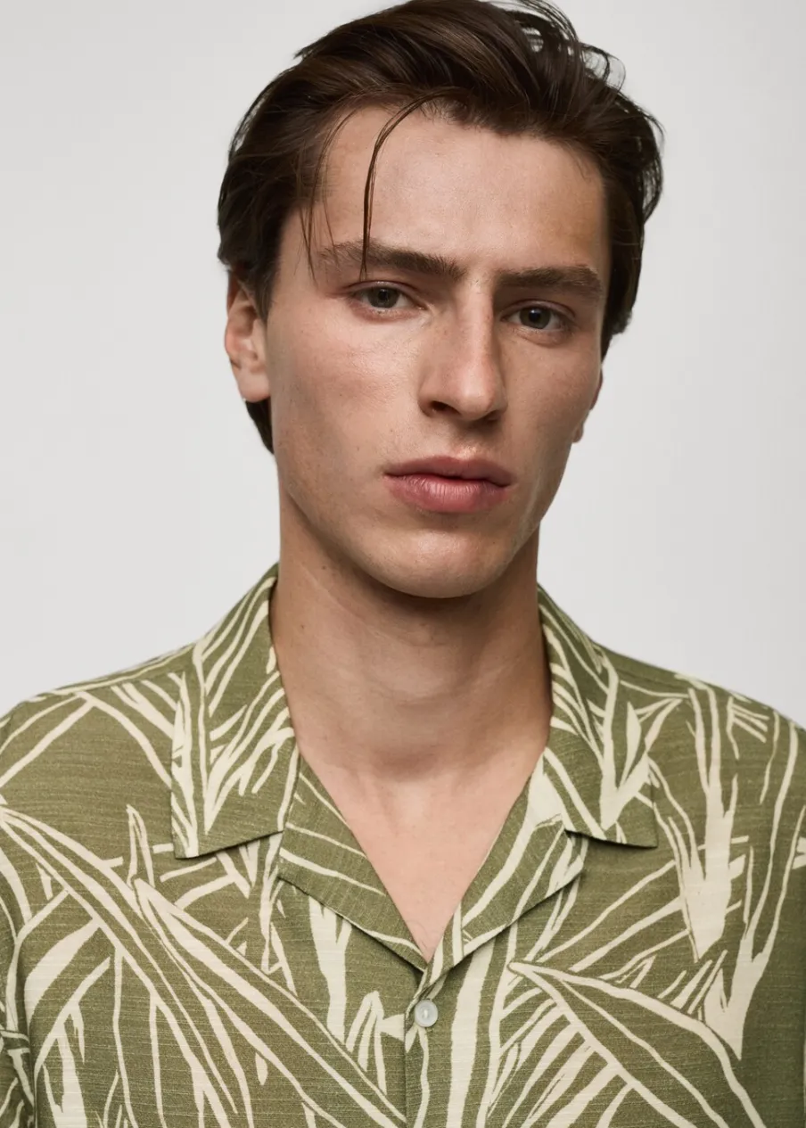 Krój regular. Tkanina mieszanka bawełny. Lejąca tkanina. Wzór w liście. Kołnierzyk typu bowling. Zapięcie z przodu na guziki. Krótki rękaw. Prosty dół. Model ma 187 cm wzrostu i nosi rozmiar M.