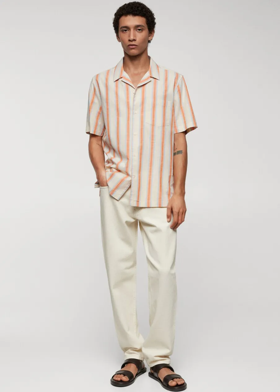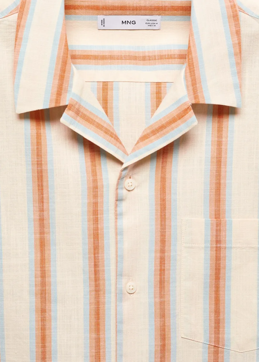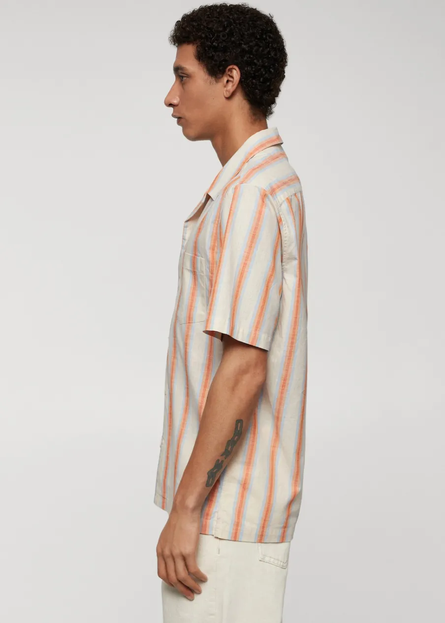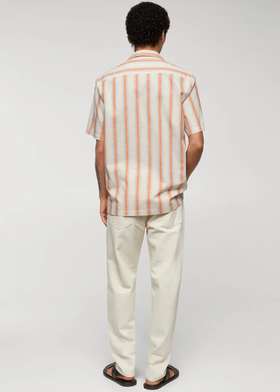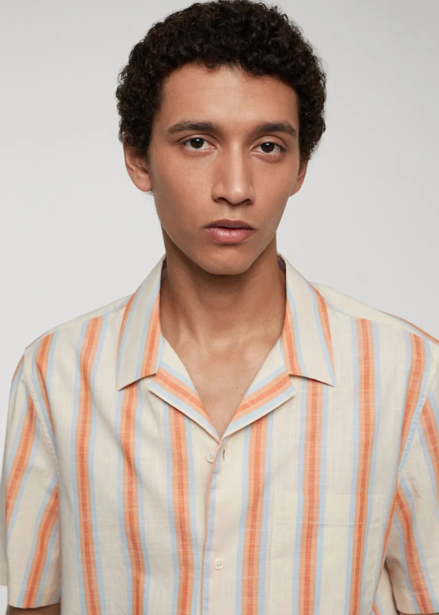 Krój regular. Lejąca tkanina. Nadruk w pionowe paski. Kieszeń nakładana na piersi. Krótki rękaw. Prosty dół z rozcięciami po bokach. Model ma 190 cm wzrostu i nosi rozmiar M. Zapięcie na guziki z przodu. Klasyczny kołnierzyk.
