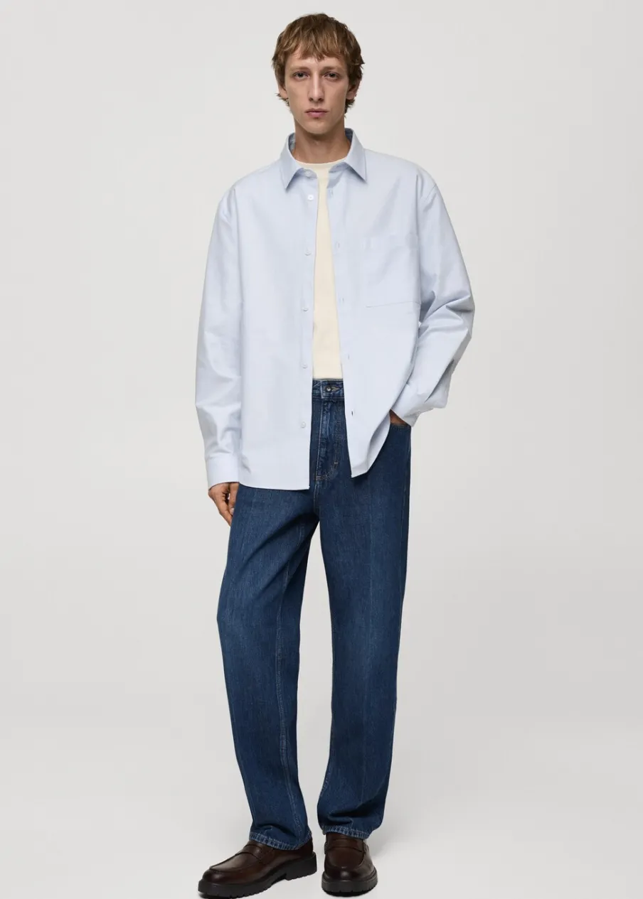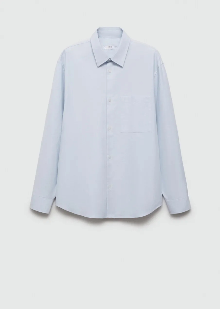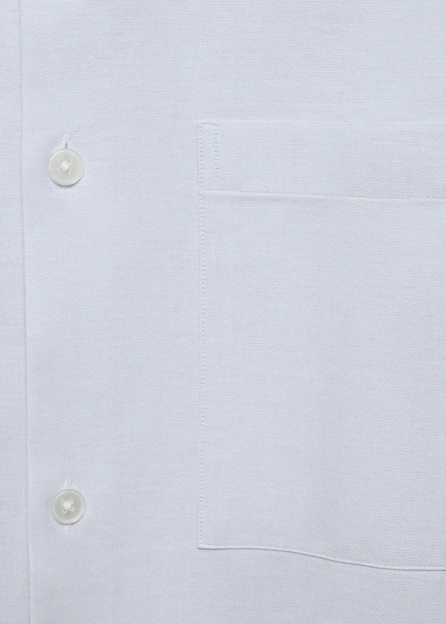 Bawełniana tkanina Oxford. Klasyczny kołnierzyk na guziki. Długi rękaw z guzikami na mankietach. Nakładana kieszeń przednia. Zapięcie na guziki. Model ma 190 cm wzrostu i nosi rozmiar M. Relaxed fit. Zaokrąglony dół.