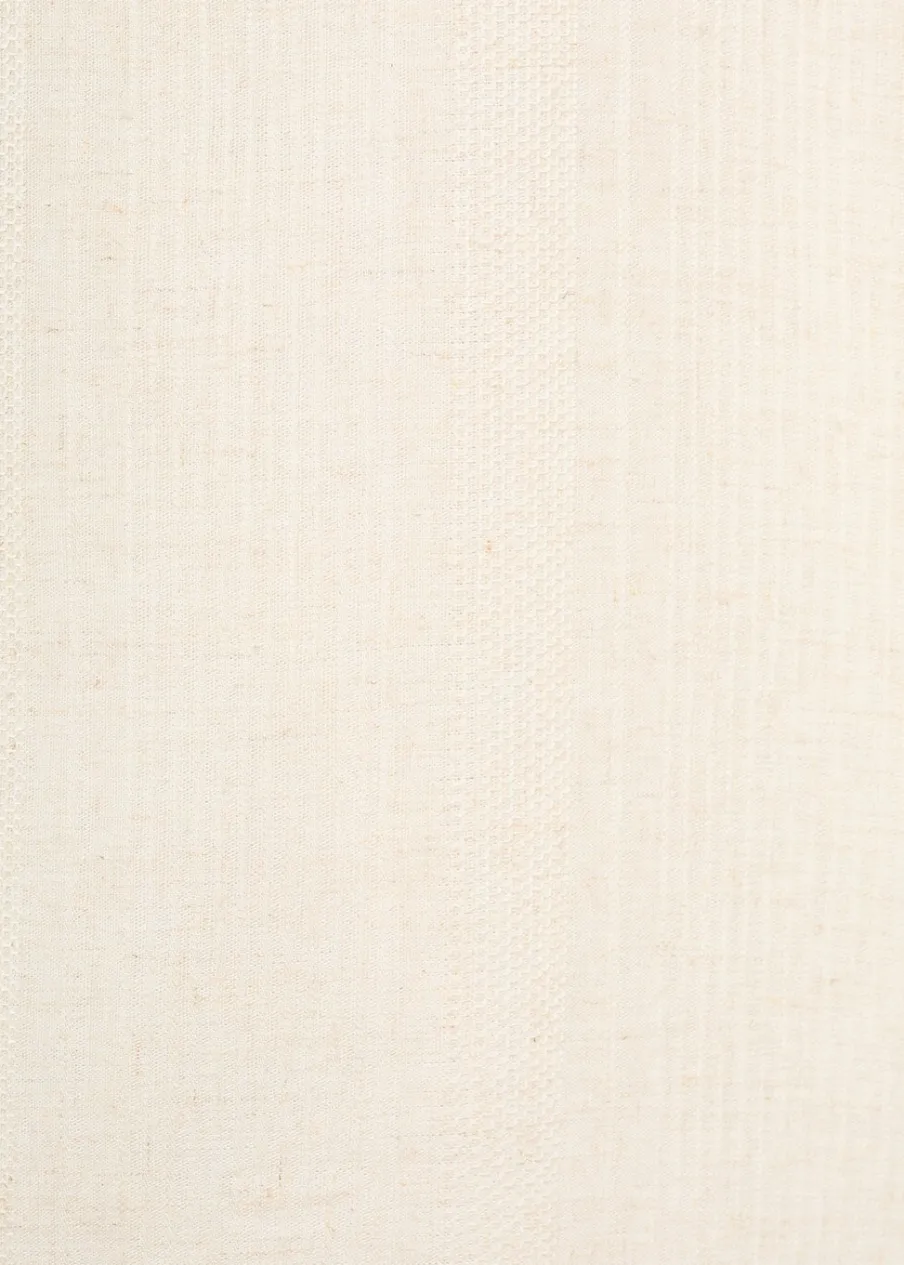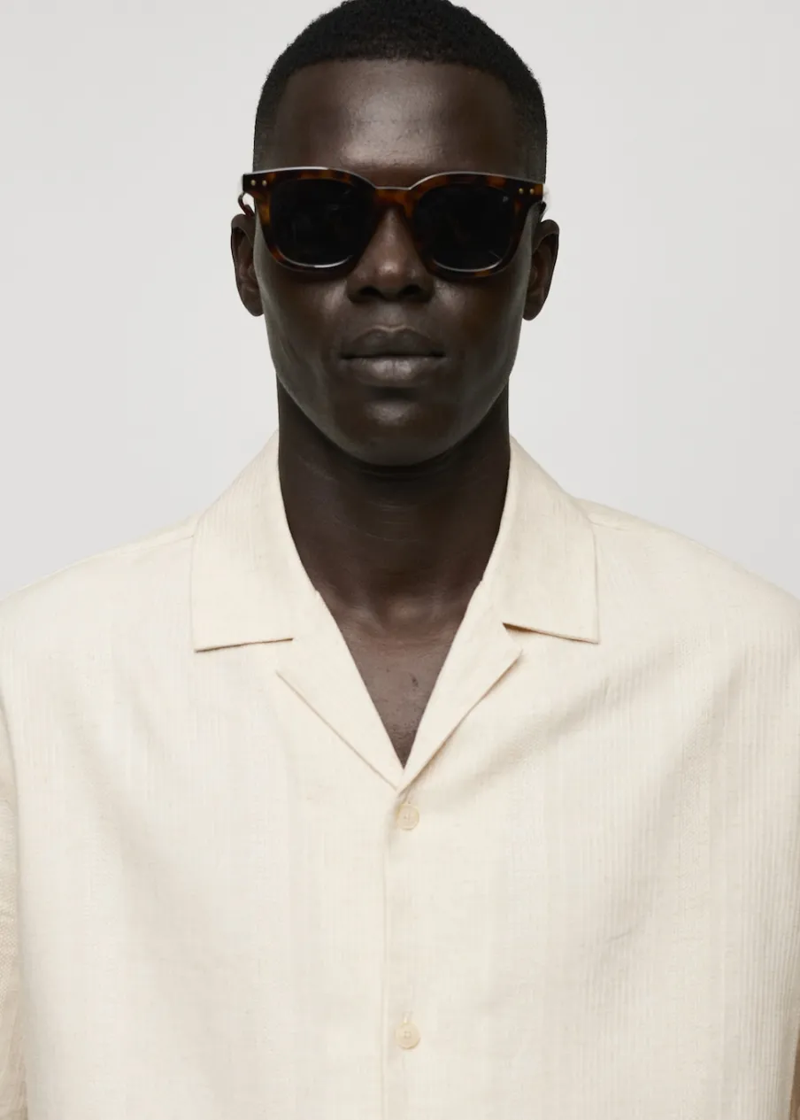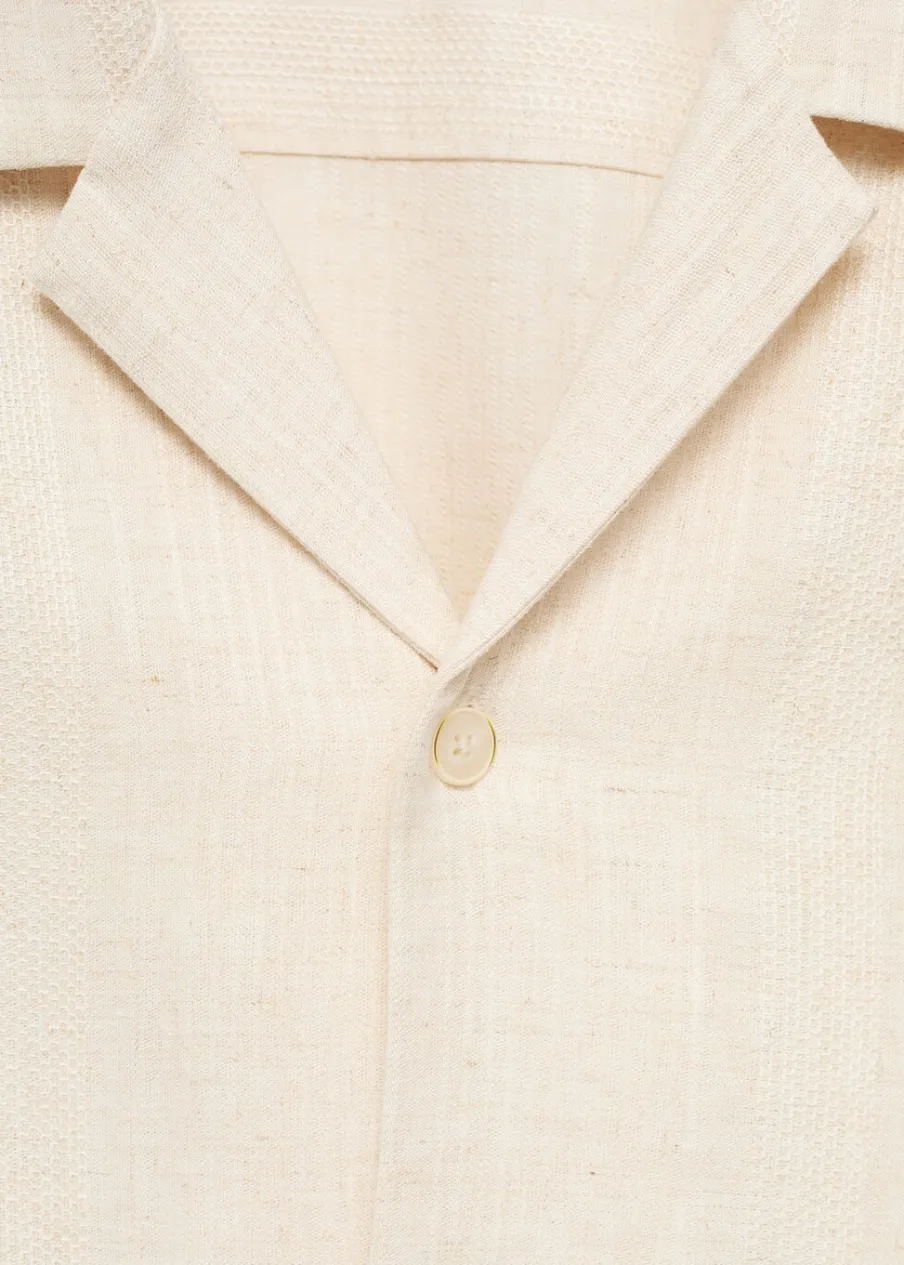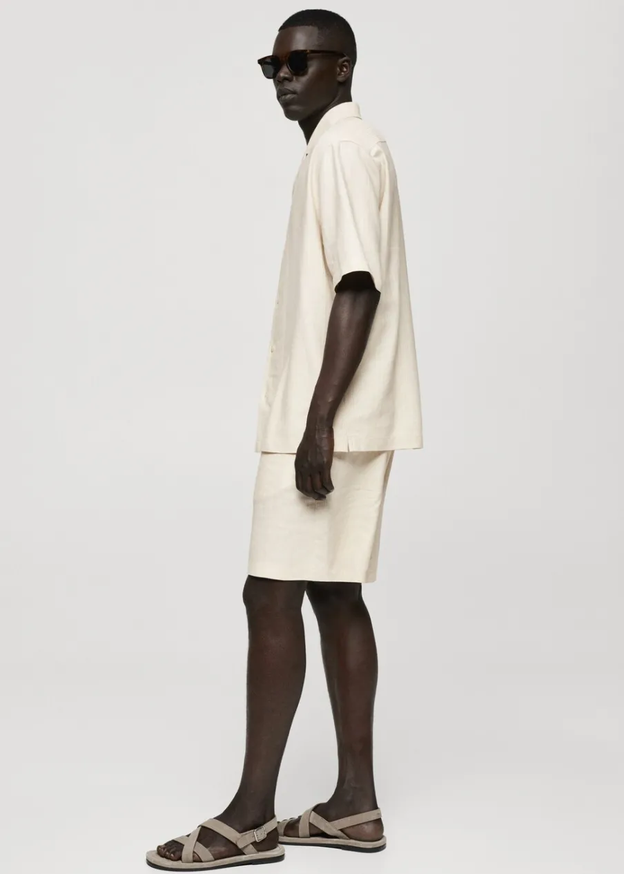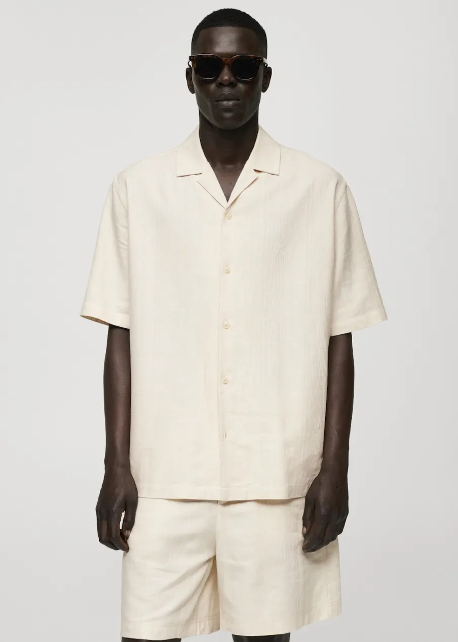 Dostępny zestaw total look. Relaxed fit. Tkanina z mieszanki lnu. Tkanina z mikroteksturą. Kołnierzyk typu bowling. Zapięcie z przodu na guziki. Krótki rękaw. Prosty dół z rozcięciami po bokach. Model ma 187 cm wzrostu i nosi rozmiar M.