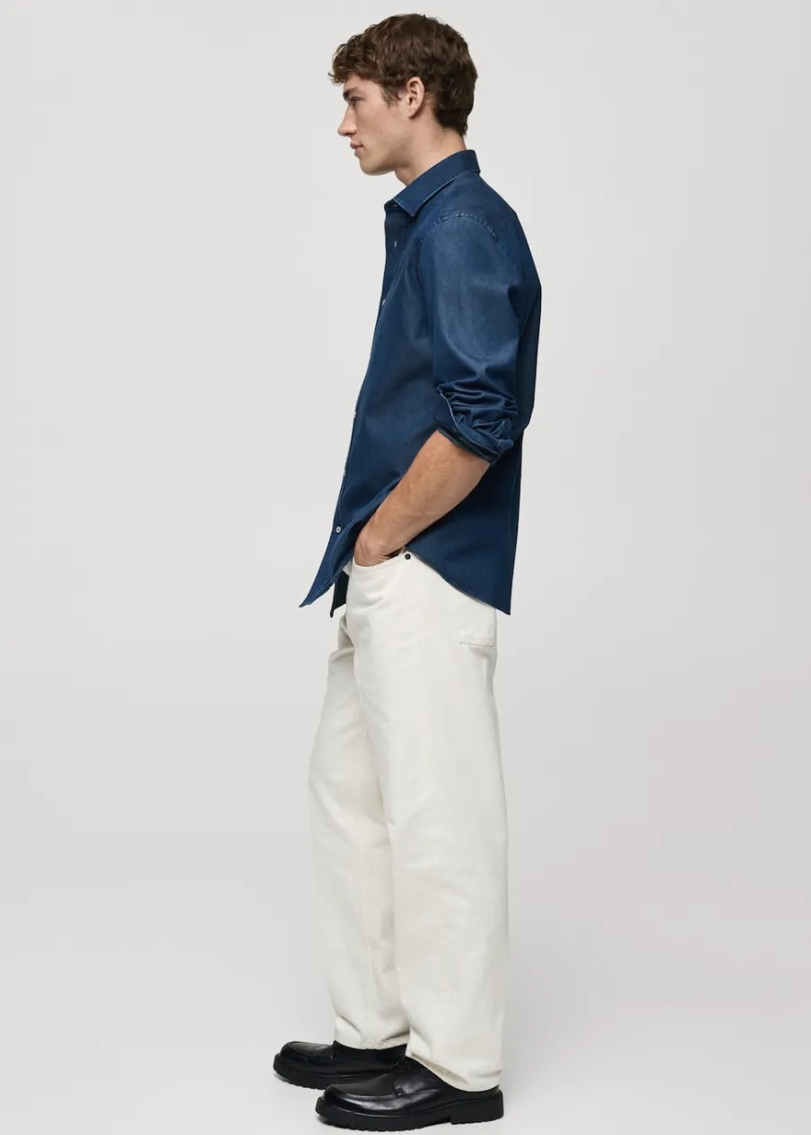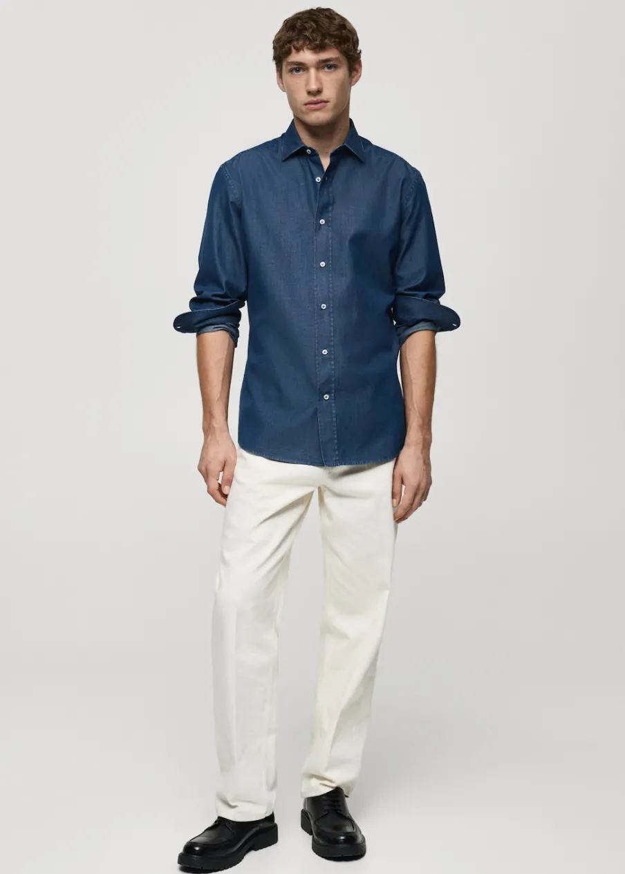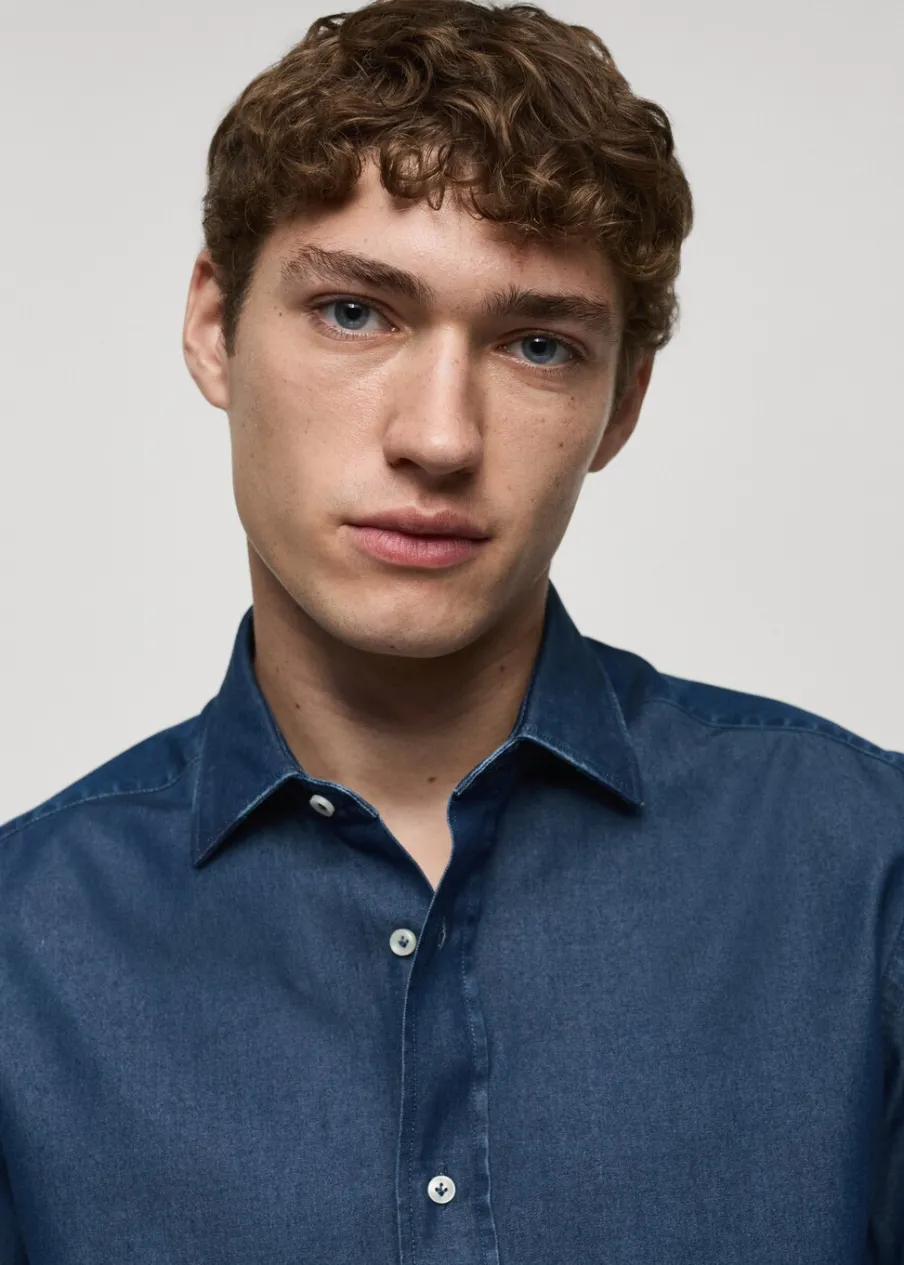 Slim-fit. 100% bomull. Bawełniana tkanina chambray. Koszulowy kołnierz. Zapięcie na guziki. Zapinane mankiety. Zaokrąglony dół. Model ma 185 cm wzrostu i nosi rozmiar M.
