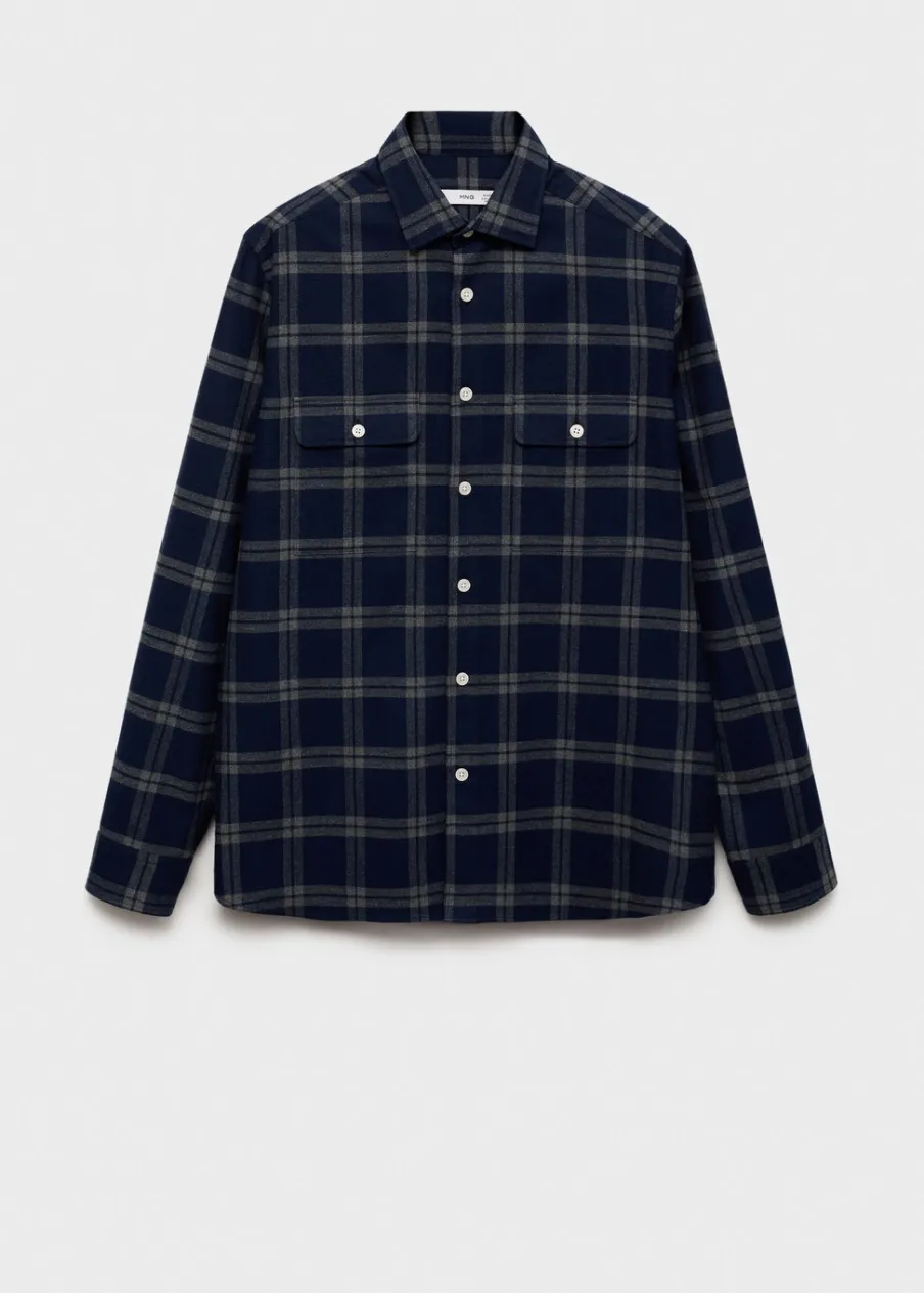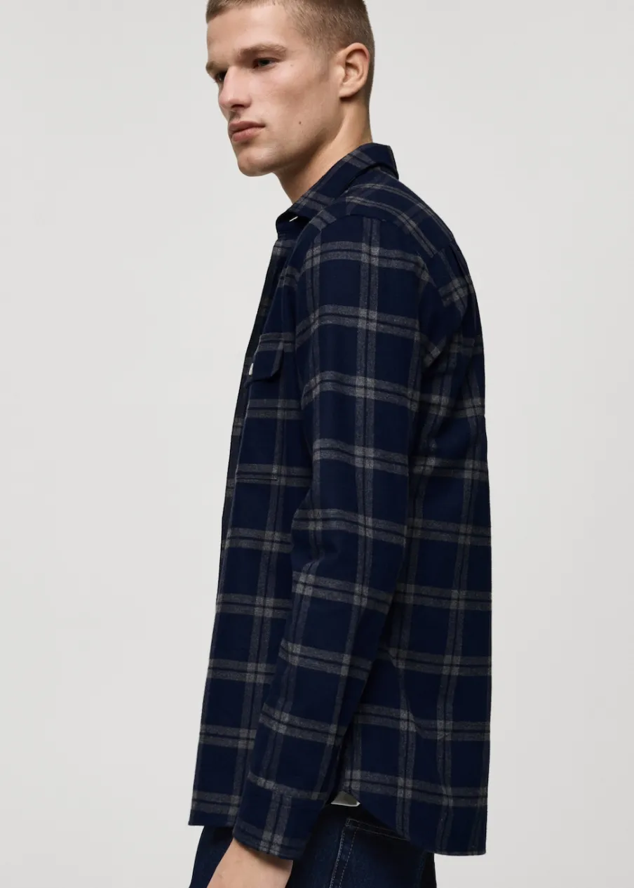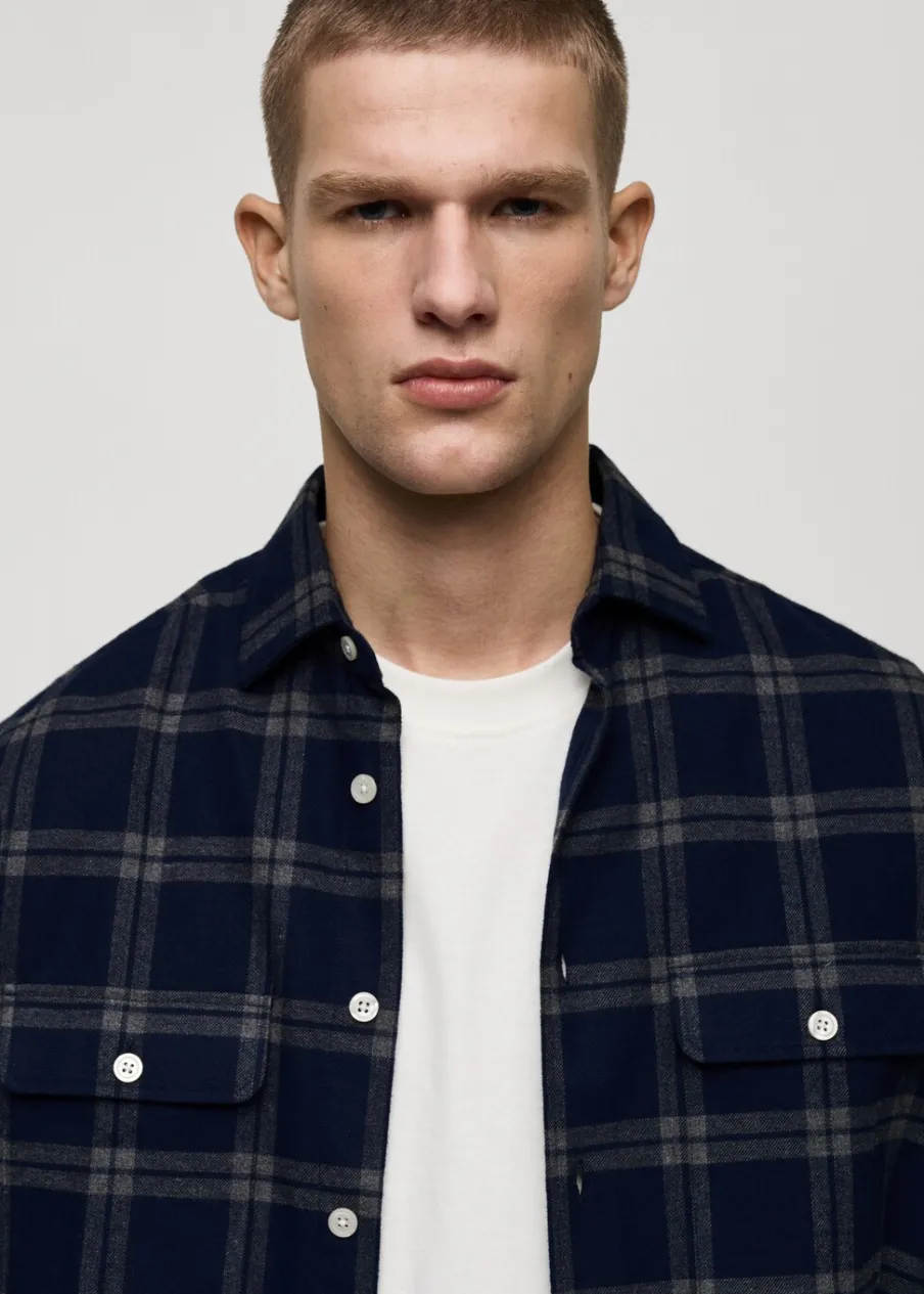 Krój regular. Tkanina flanelowa. Nadruk: krata. Tkanina z 100% bawełny. Koszulowy kołnierz. Zapięcie na guziki z przodu. Długi rękaw z guzikami na mankietach. Dwie naszywane kieszenie z patkami i guzikiem na piersi. Zaokrąglony dół. Model ma 190 cm wzrostu i nosi rozmiar M.