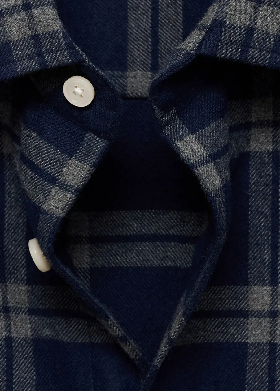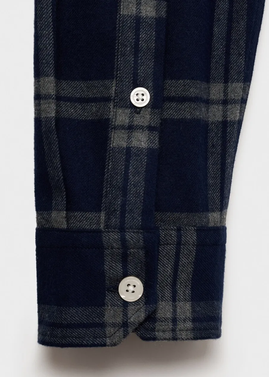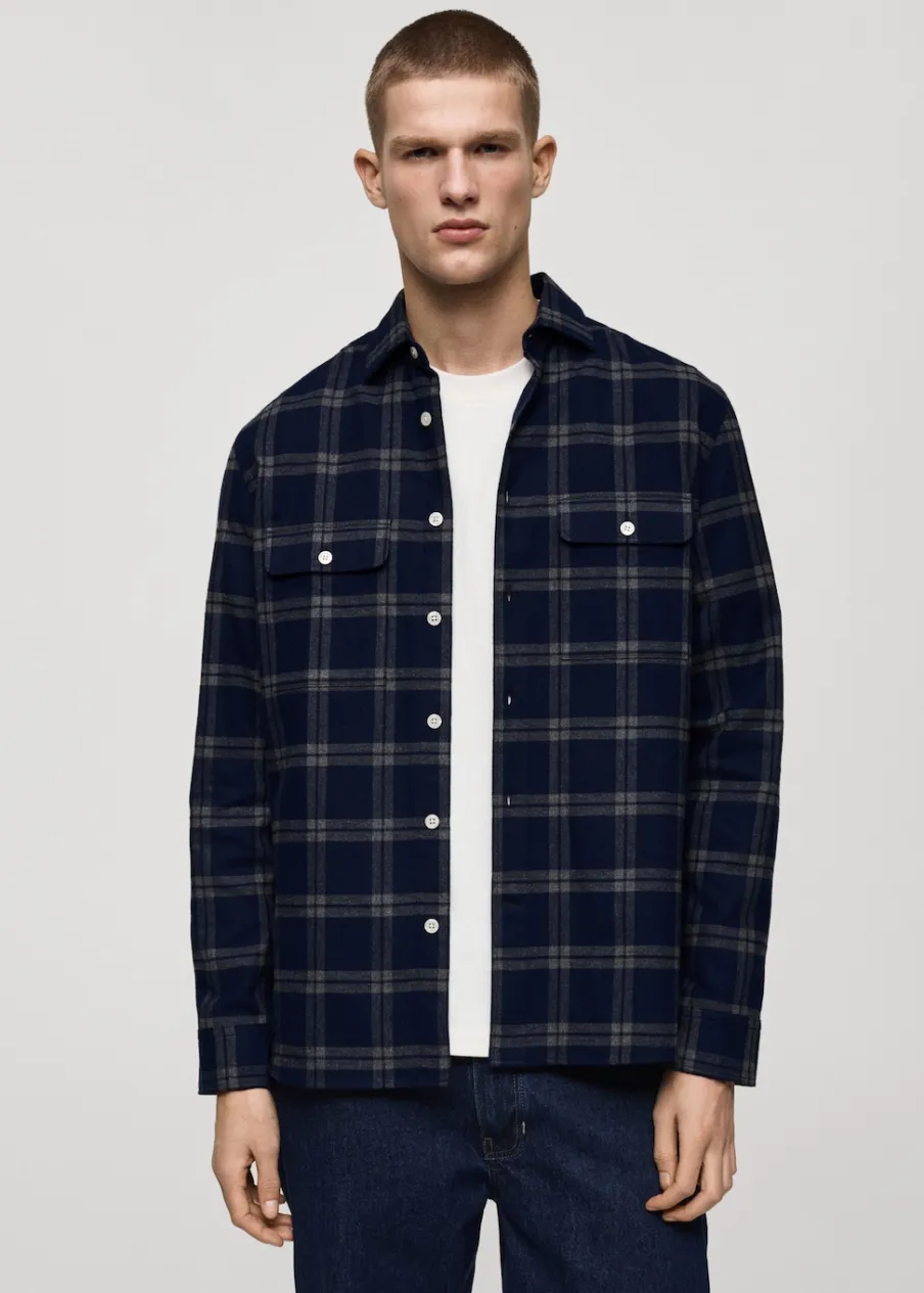 Krój regular. Tkanina flanelowa. Nadruk: krata. Tkanina z 100% bawełny. Koszulowy kołnierz. Zapięcie na guziki z przodu. Długi rękaw z guzikami na mankietach. Dwie naszywane kieszenie z patkami i guzikiem na piersi. Zaokrąglony dół. Model ma 190 cm wzrostu i nosi rozmiar M.