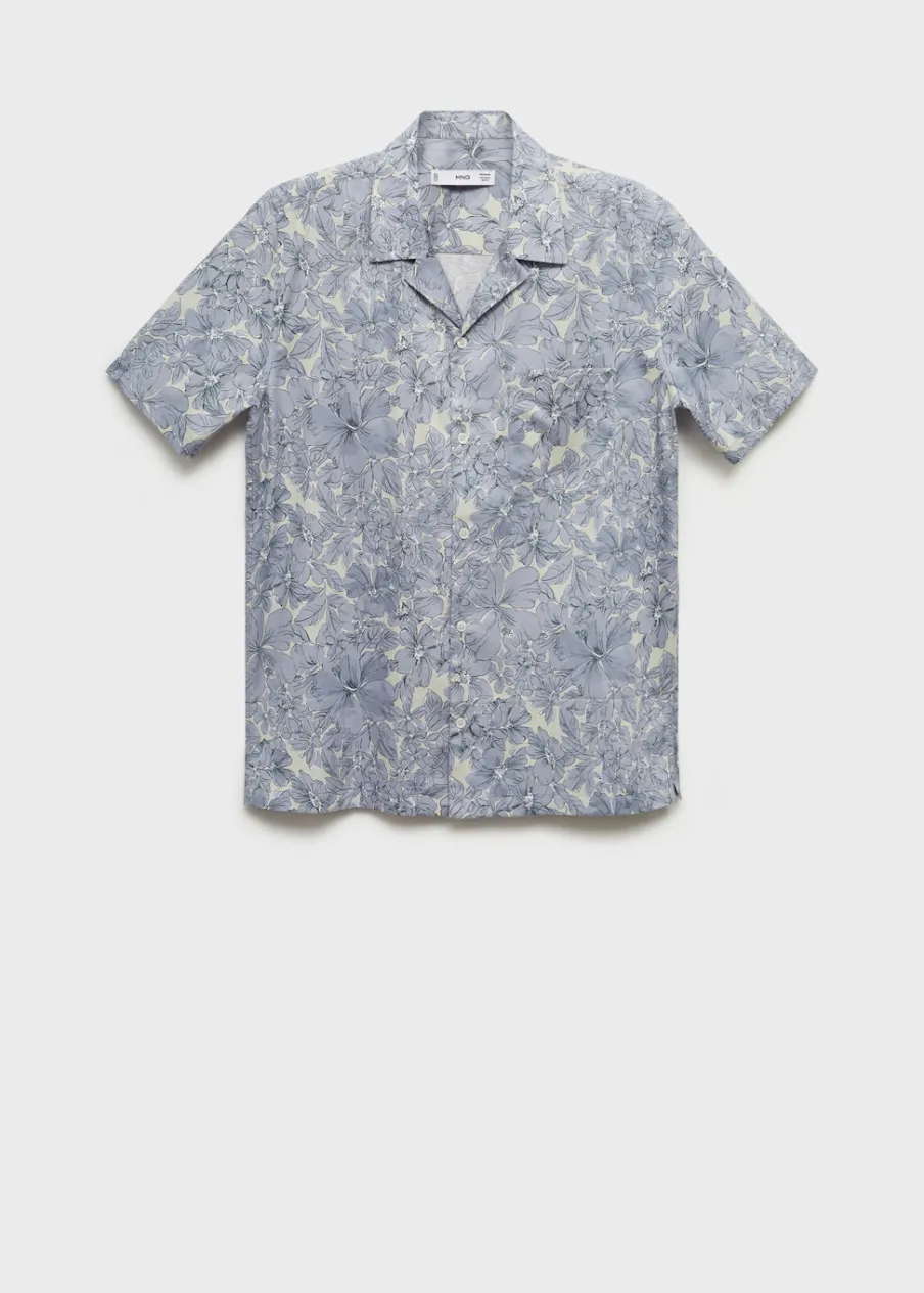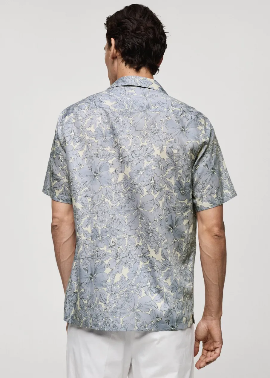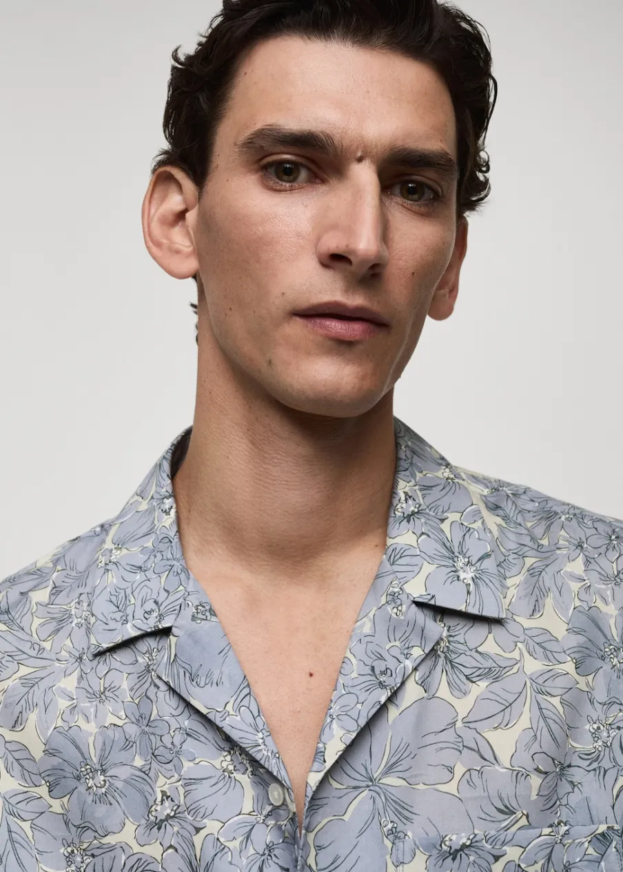 Krój regular. Kwiatowy wzór. Kołnierzyk typu bowling. Zapięcie z przodu na guziki. Krótki rękaw. Prosty dół. Model ma 185 cm wzrostu i nosi rozmiar M. Tkanina z 100% bawełny.