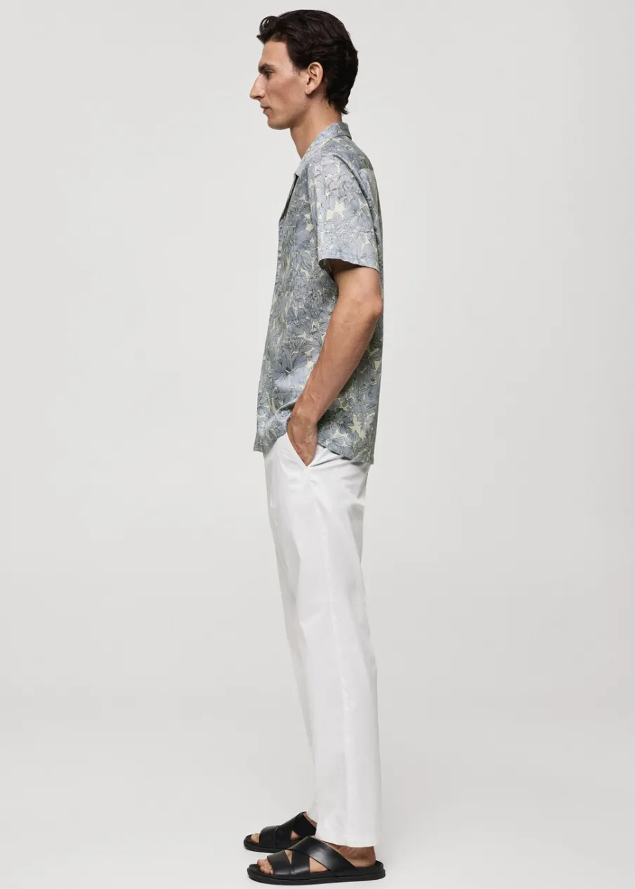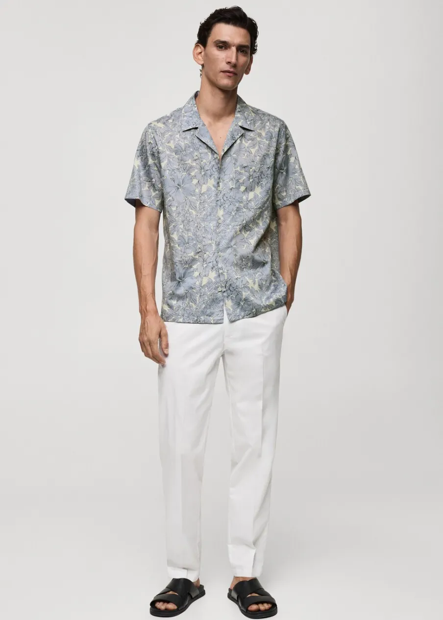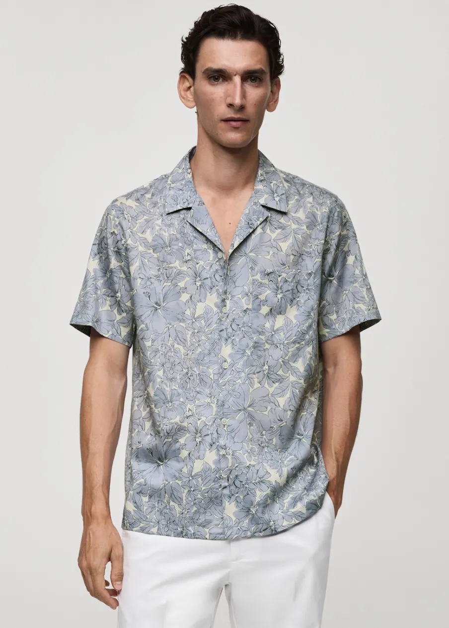Krój regular. Kwiatowy wzór. Kołnierzyk typu bowling. Zapięcie z przodu na guziki. Krótki rękaw. Prosty dół. Model ma 185 cm wzrostu i nosi rozmiar M. Tkanina z 100% bawełny.