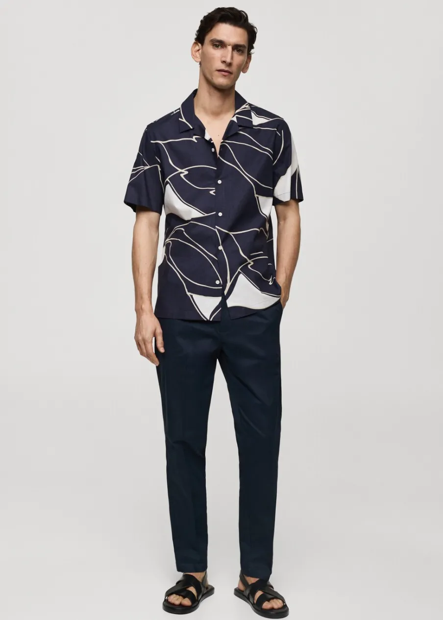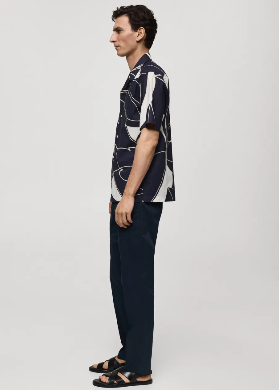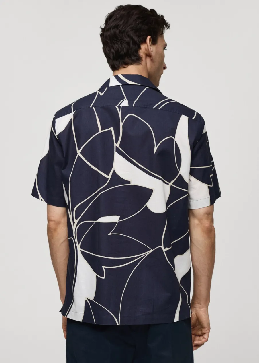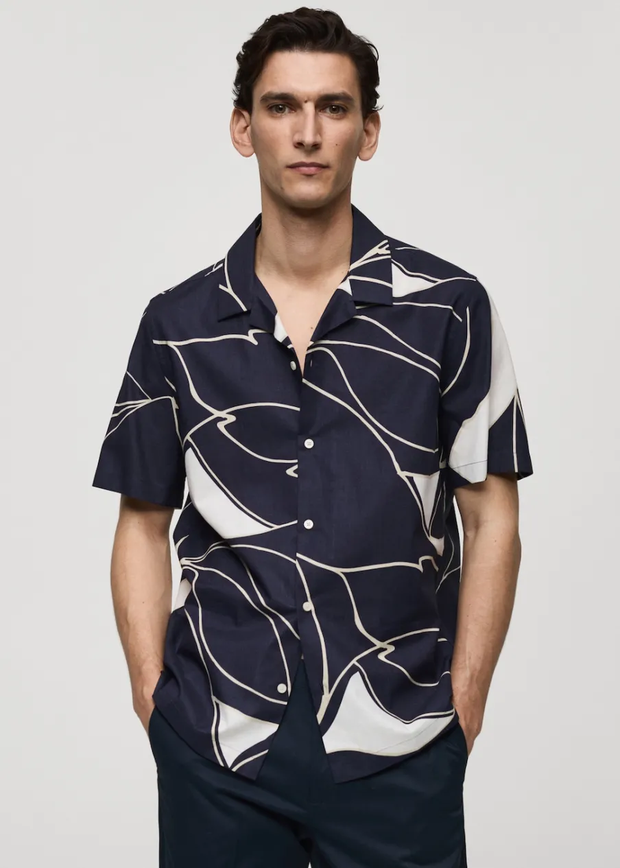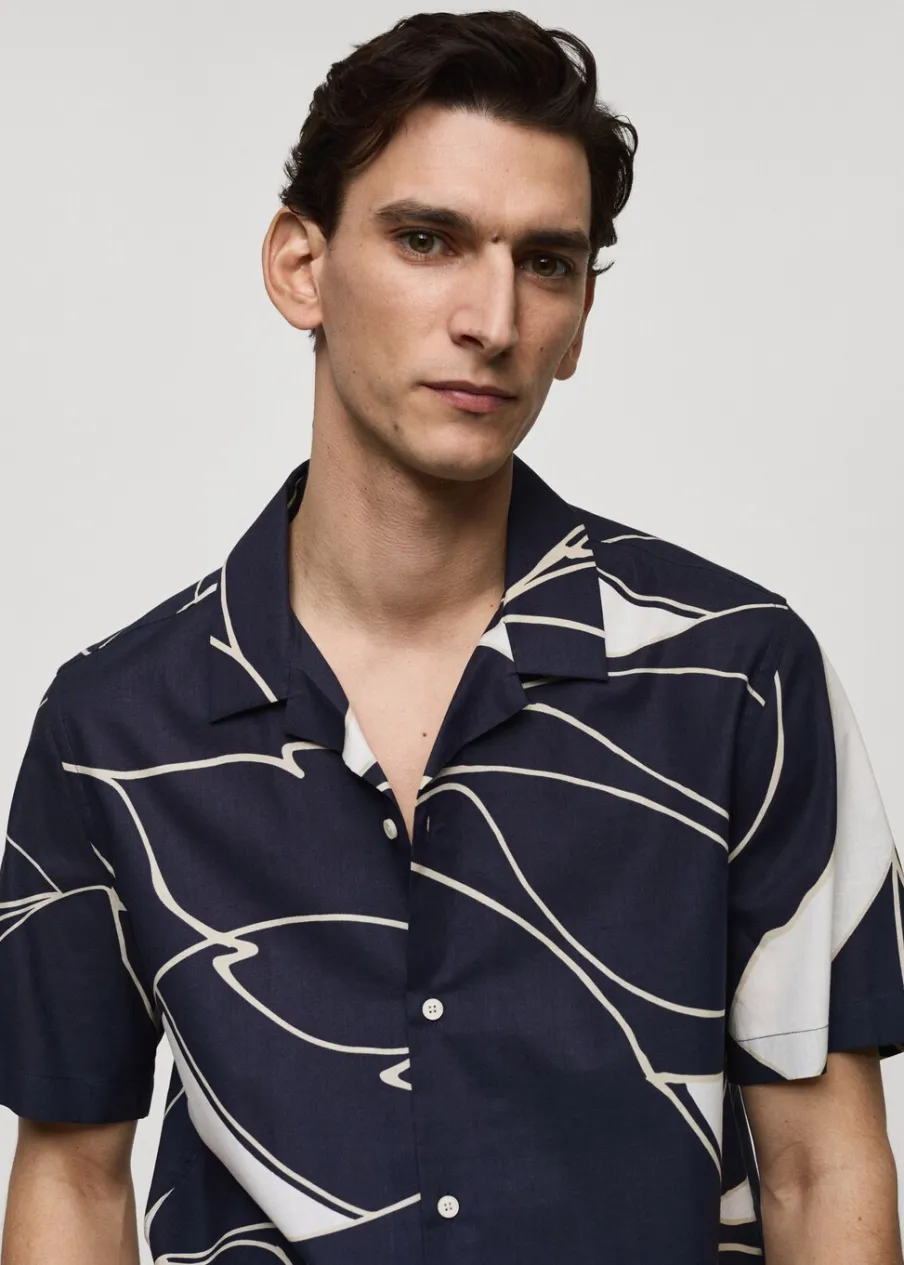 Krój regular. Kołnierzyk typu bowling. Krótki rękaw. Prosty dół. Model ma 185 cm wzrostu i nosi rozmiar M. Tkanina z 100% bawełny. Zapięcie na guziki z przodu. Nadruk.