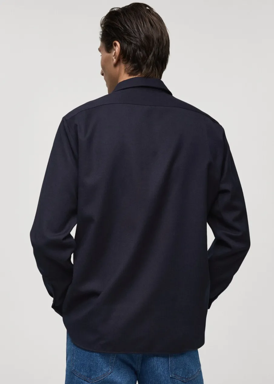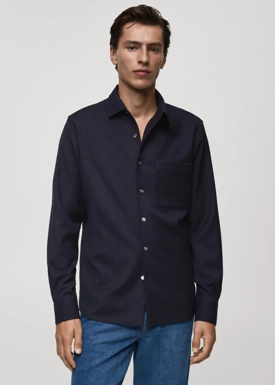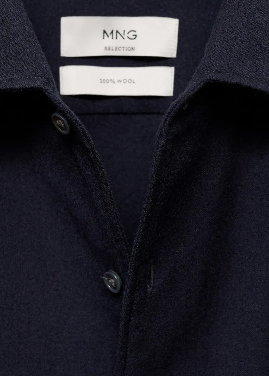 Kolekcja Selection. Tkanina z 100% wełny. Krój regular. Kołnierzyk z pojedynczego kawałka materiału, aby ukryć szwy łączące go z korpusem koszuli. Kieszeń nakładana na piersi. Długi rękaw z guzikami na mankietach. Zaokrąglony dół. Model ma 185 cm wzrostu i nosi rozmiar M. Zapięcie na guziki z przodu.