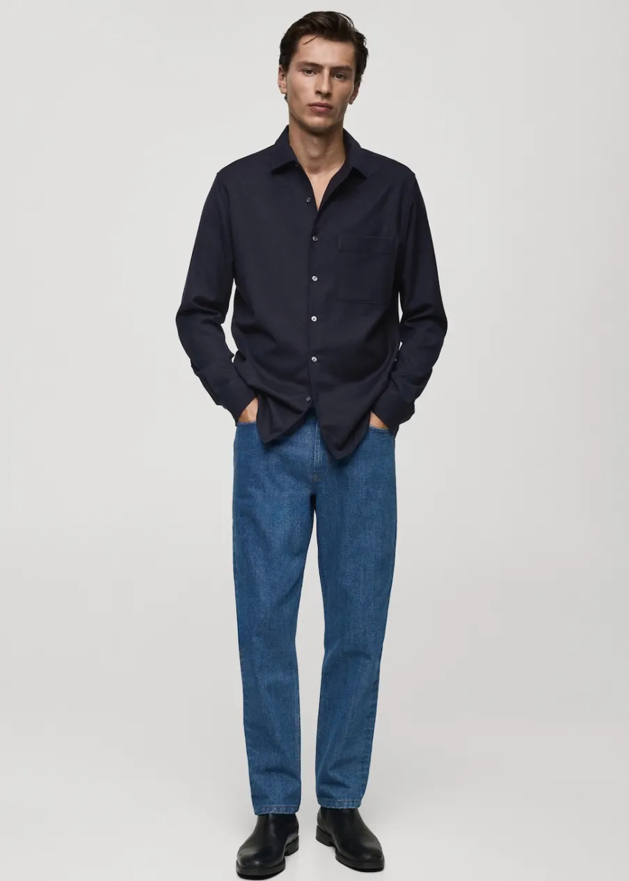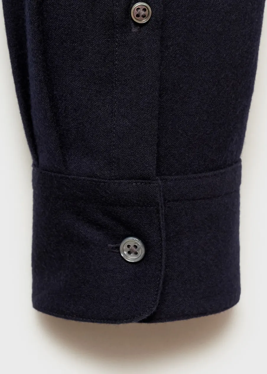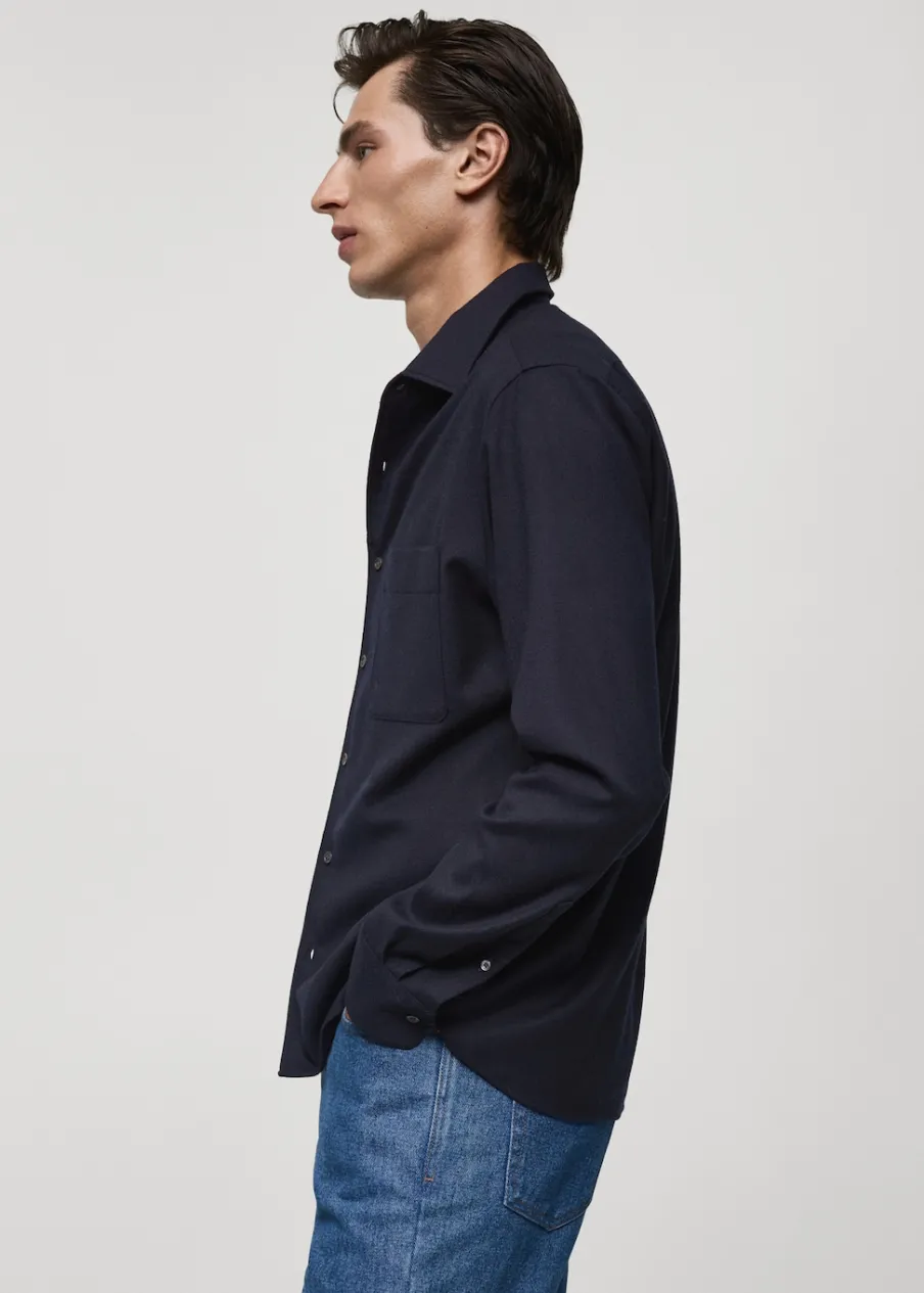 Kolekcja Selection. Tkanina z 100% wełny. Krój regular. Kołnierzyk z pojedynczego kawałka materiału, aby ukryć szwy łączące go z korpusem koszuli. Kieszeń nakładana na piersi. Długi rękaw z guzikami na mankietach. Zaokrąglony dół. Model ma 185 cm wzrostu i nosi rozmiar M. Zapięcie na guziki z przodu.