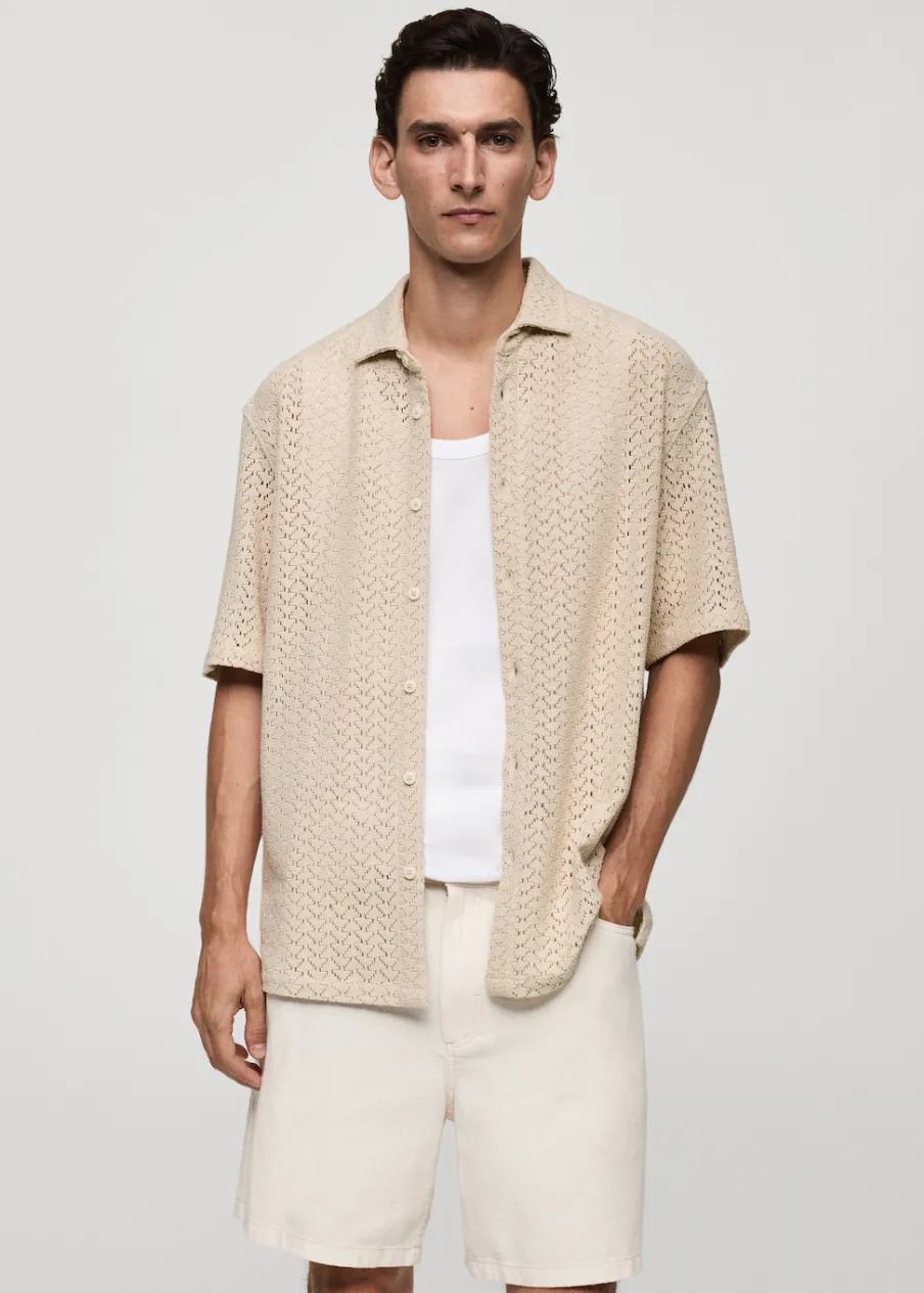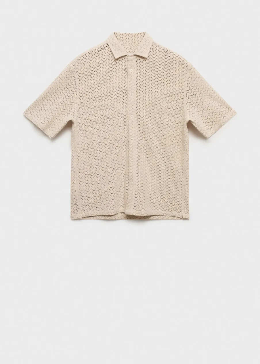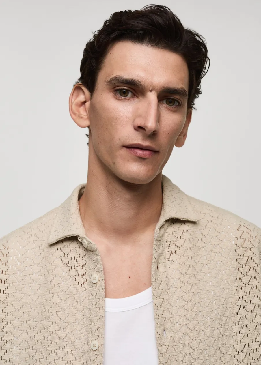 Krój regular. Ażurowa dzianina. Koszulowy kołnierz. Krótki rękaw. Prosty dół. Dół z rozcięciem po bokach. Model ma 190 cm wzrostu i nosi rozmiar M. Tkanina z 100% bawełny. Zapięcie na guziki z przodu.