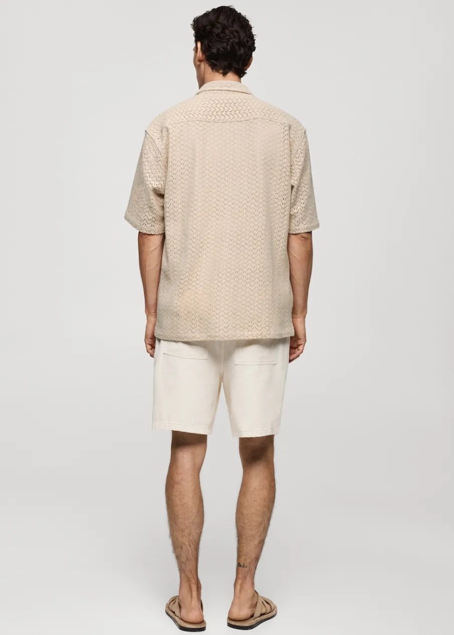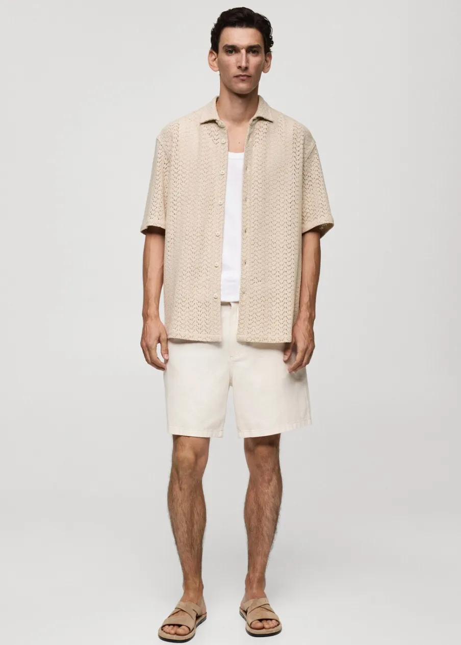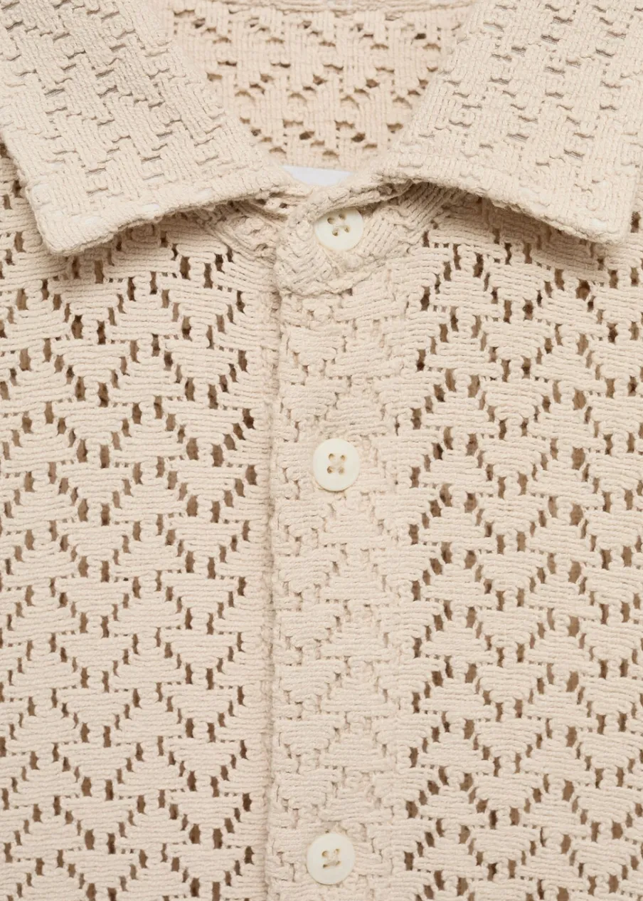 Krój regular. Ażurowa dzianina. Koszulowy kołnierz. Krótki rękaw. Prosty dół. Dół z rozcięciem po bokach. Model ma 190 cm wzrostu i nosi rozmiar M. Tkanina z 100% bawełny. Zapięcie na guziki z przodu.