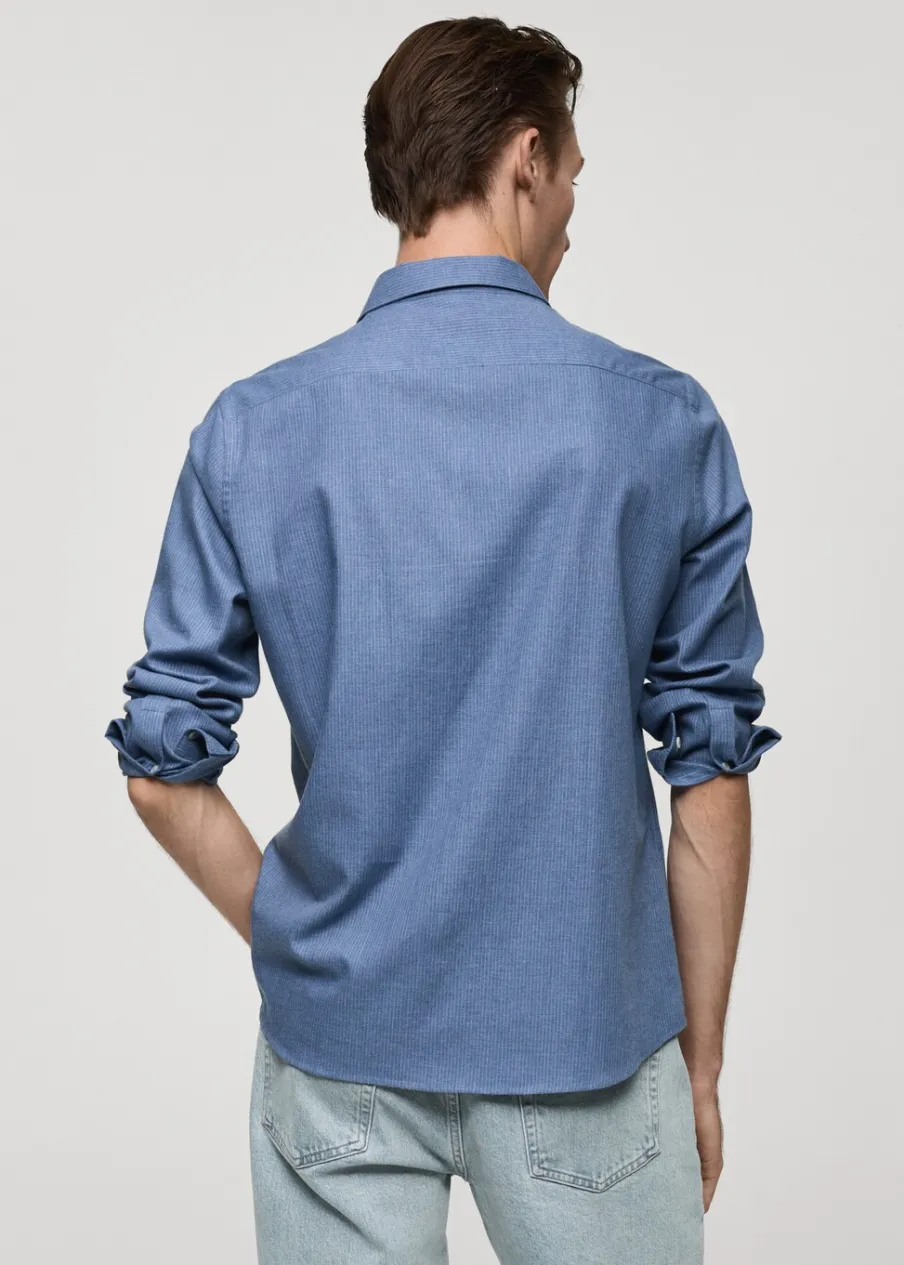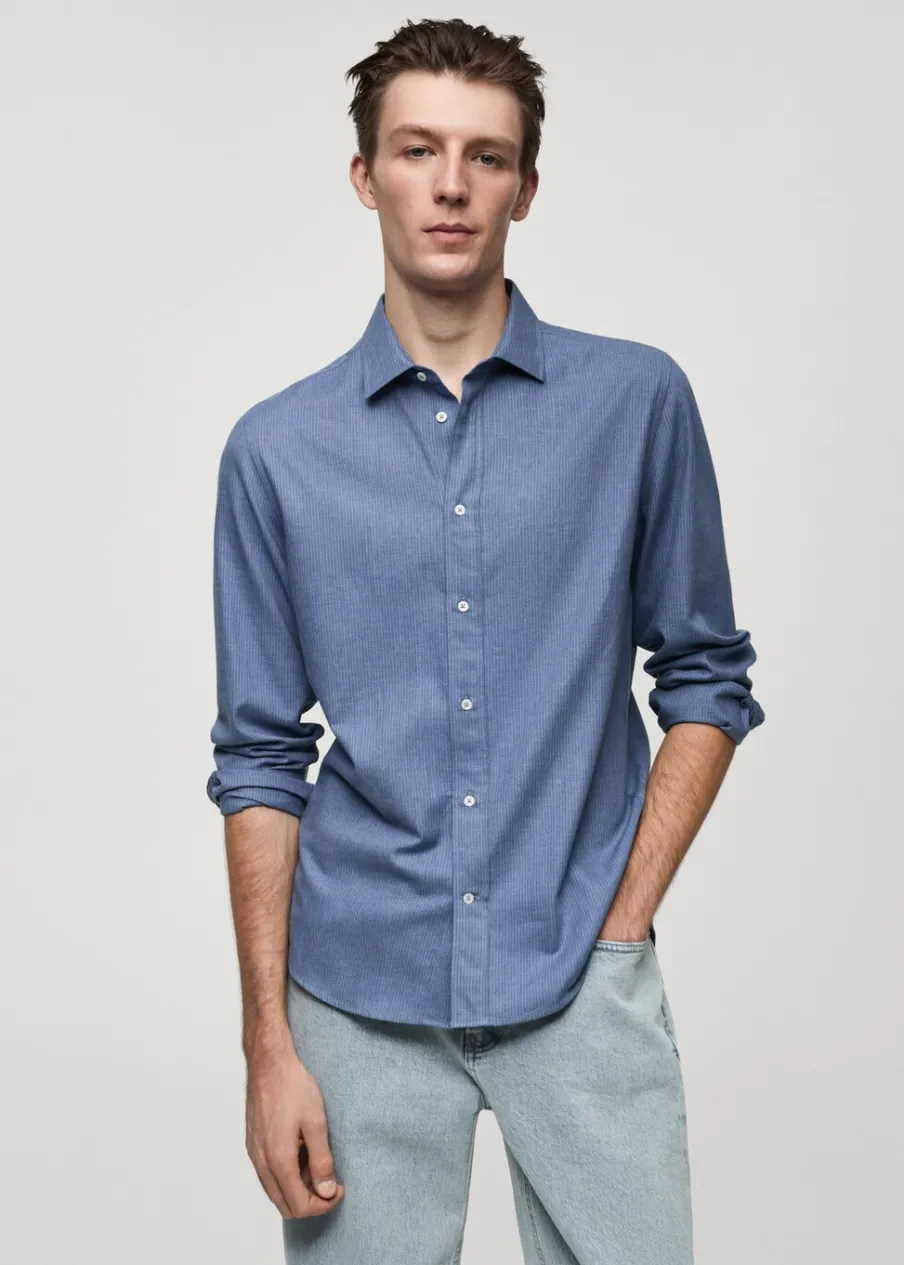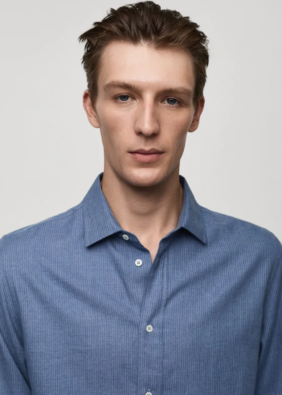 Bawełna 100%. Tkanina flanelowa. Wzór w drobne paseczki. Klasyczny kołnierzyk. Zapięcie na guziki. Zapinane mankiety. Zaokrąglony dół. Model ma 185 cm wzrostu i nosi rozmiar M. Slim-fit.