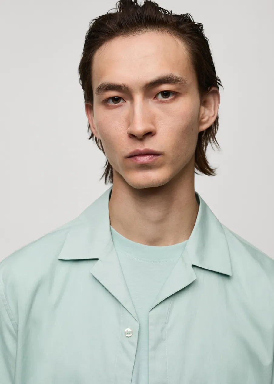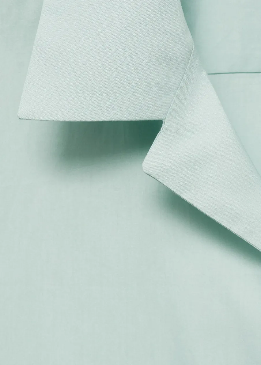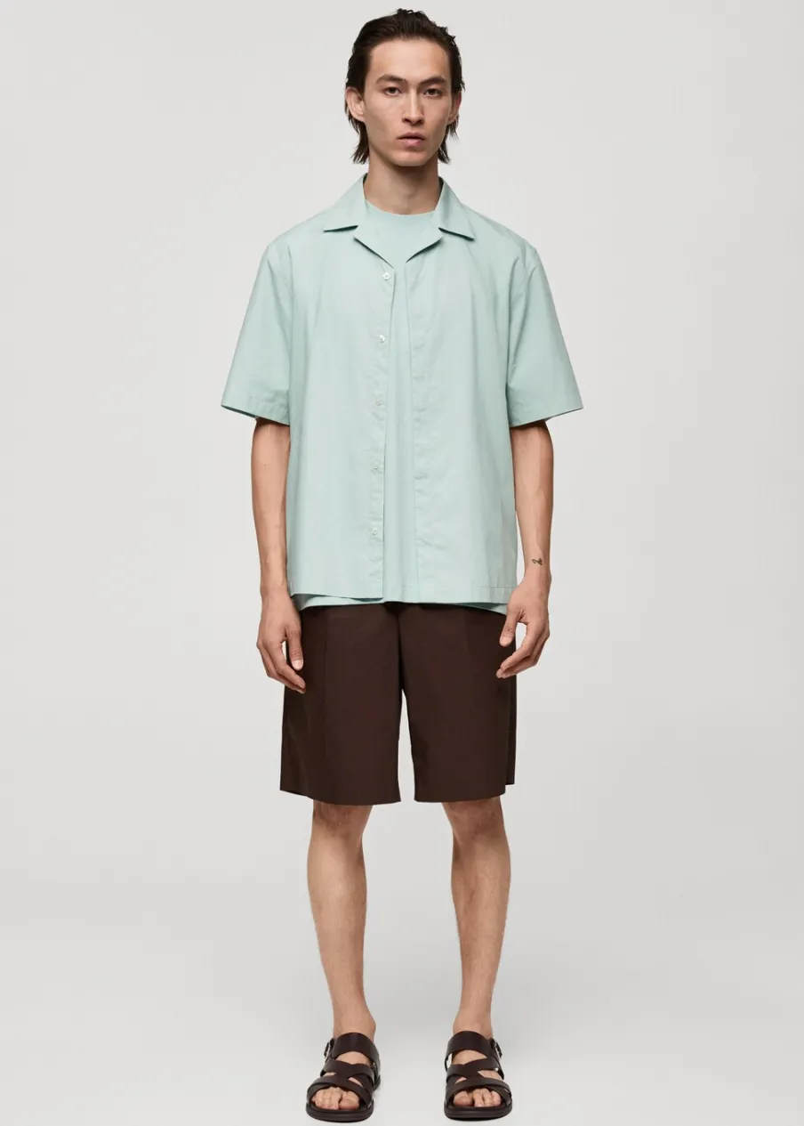 Wyłącznie online. Kołnierzyk typu bowling. Zapięcie z przodu na guziki. Krótki rękaw. Prosty dół. Model ma 185 cm wzrostu i nosi rozmiar M. Tkanina z 100% bawełny.