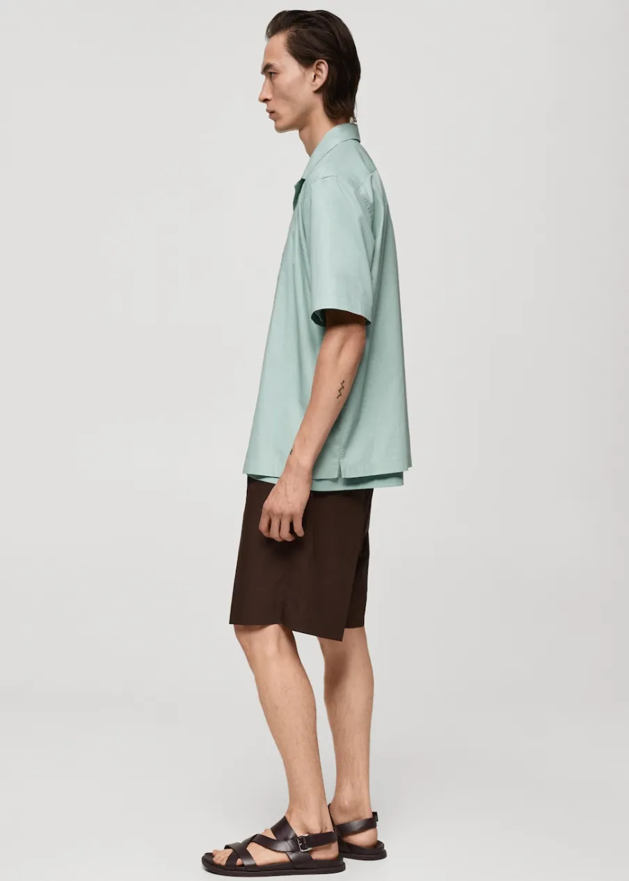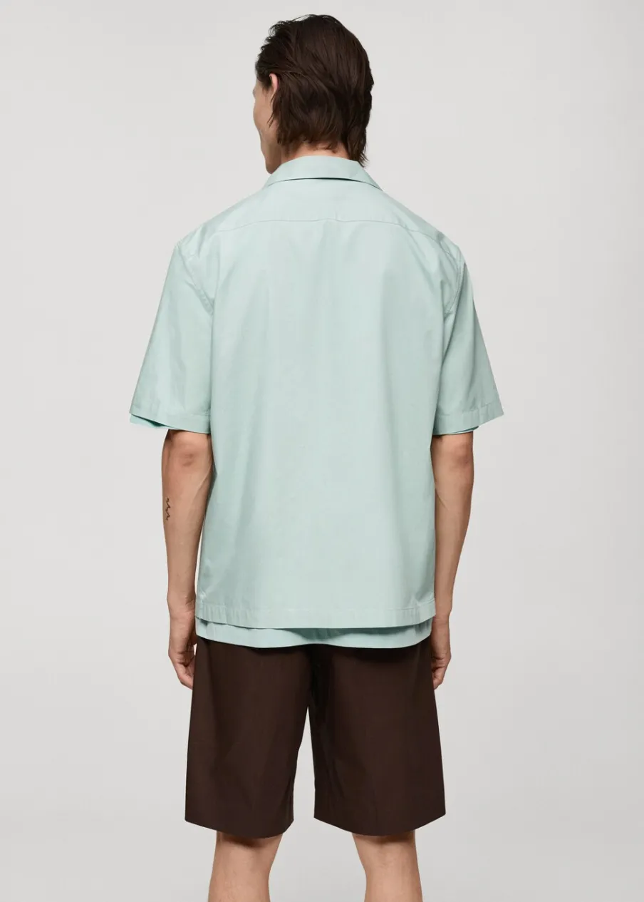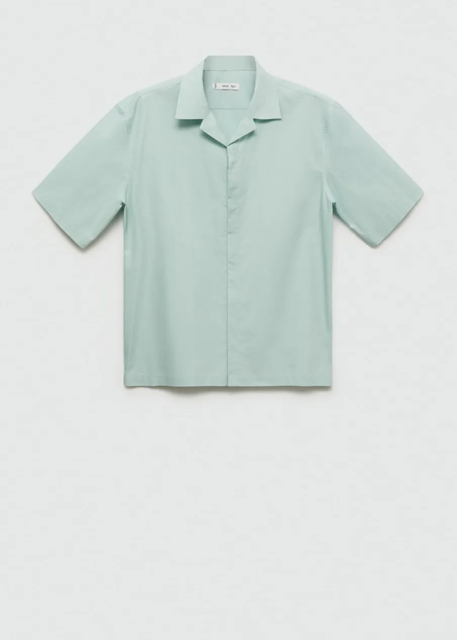 Wyłącznie online. Kołnierzyk typu bowling. Zapięcie z przodu na guziki. Krótki rękaw. Prosty dół. Model ma 185 cm wzrostu i nosi rozmiar M. Tkanina z 100% bawełny.