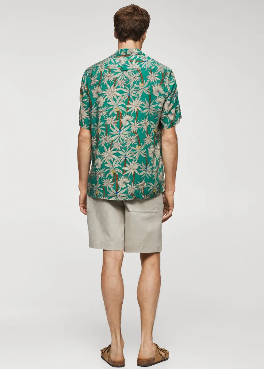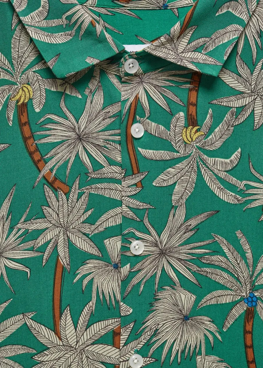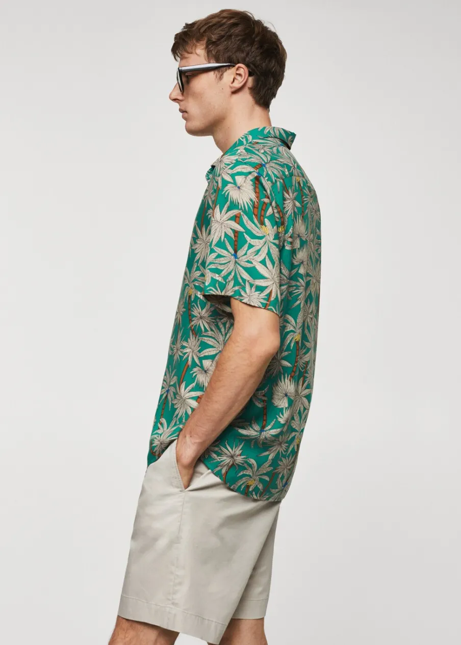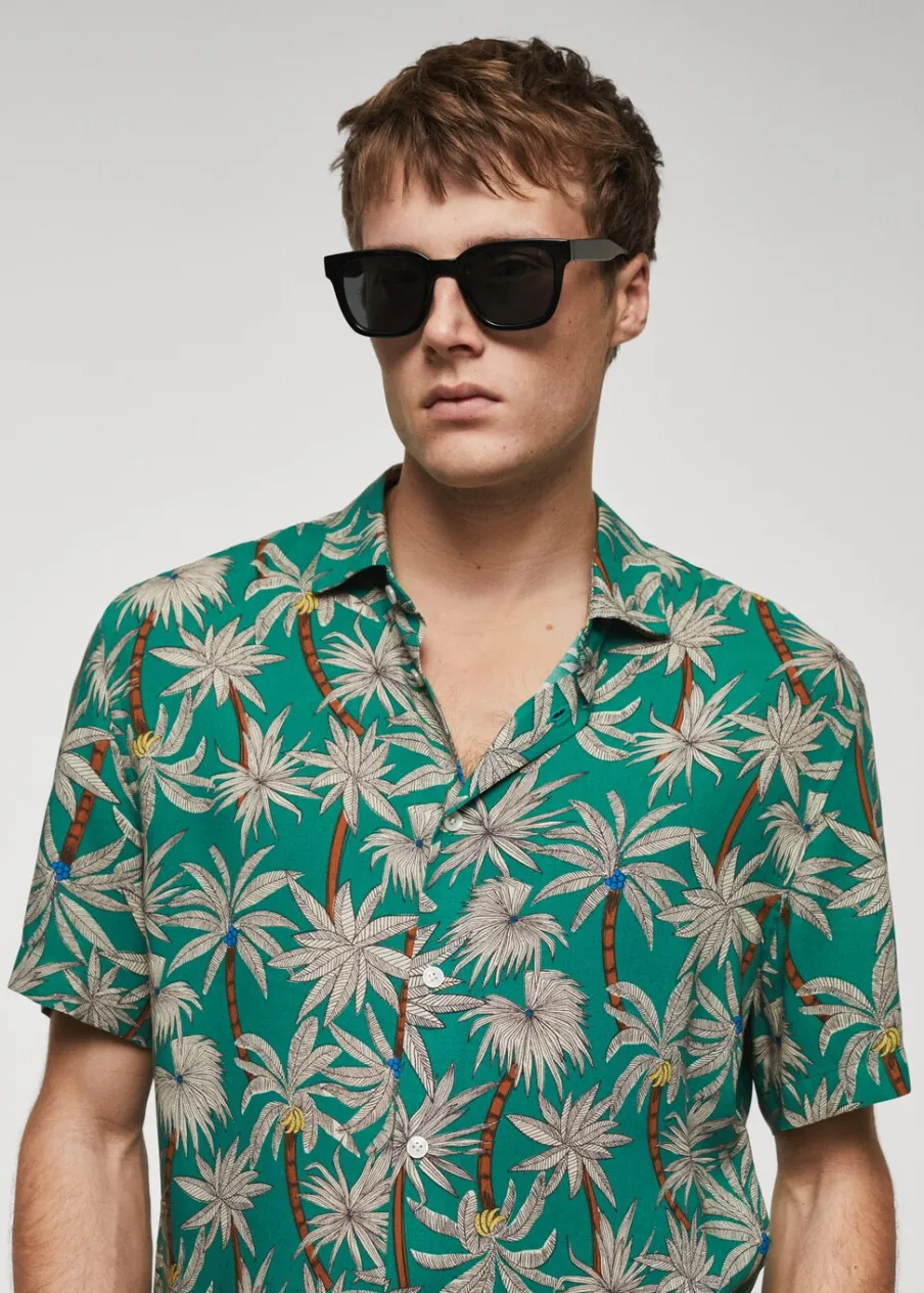 Krój regular. Krótki rękaw. Hawajski wzór. Model ma 185 cm wzrostu i nosi rozmiar M. Zaokrąglony dół. Klasyczny kołnierzyk. Zapięcie na guziki z przodu.