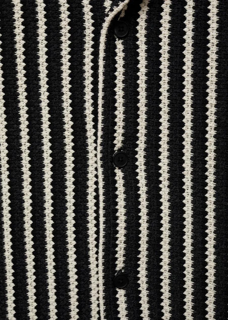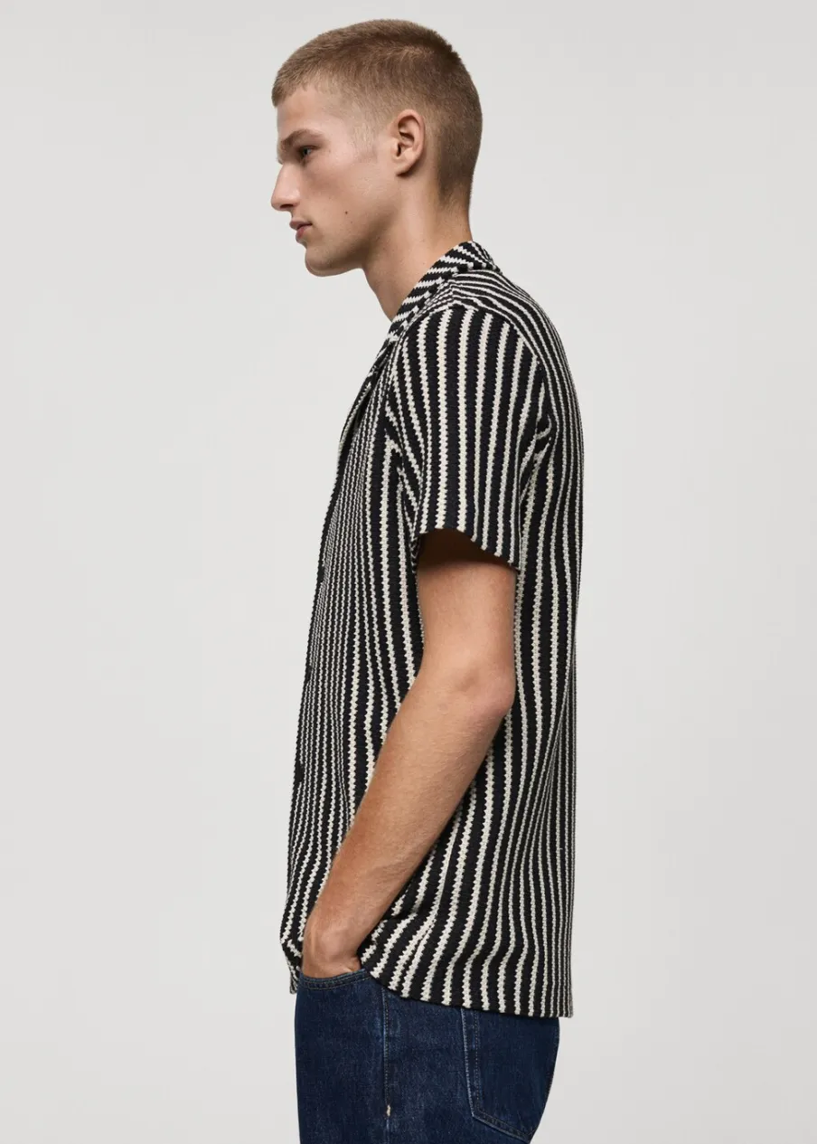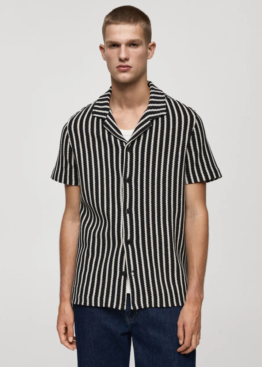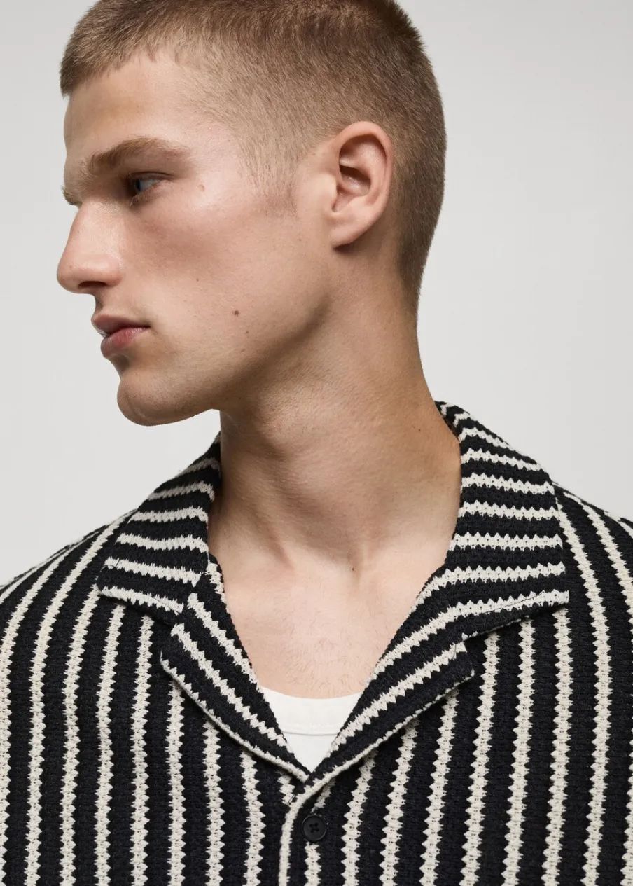 Krój regular. Kołnierzyk typu bowling. Krótki rękaw. Prosty dół. Model ma 190 cm wzrostu i nosi rozmiar M. Szydełkowa tkanina. Zapięcie na guziki z przodu.