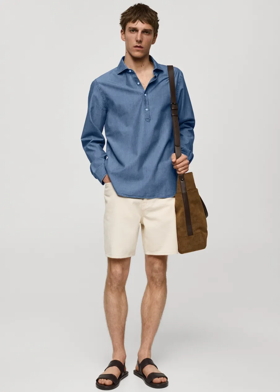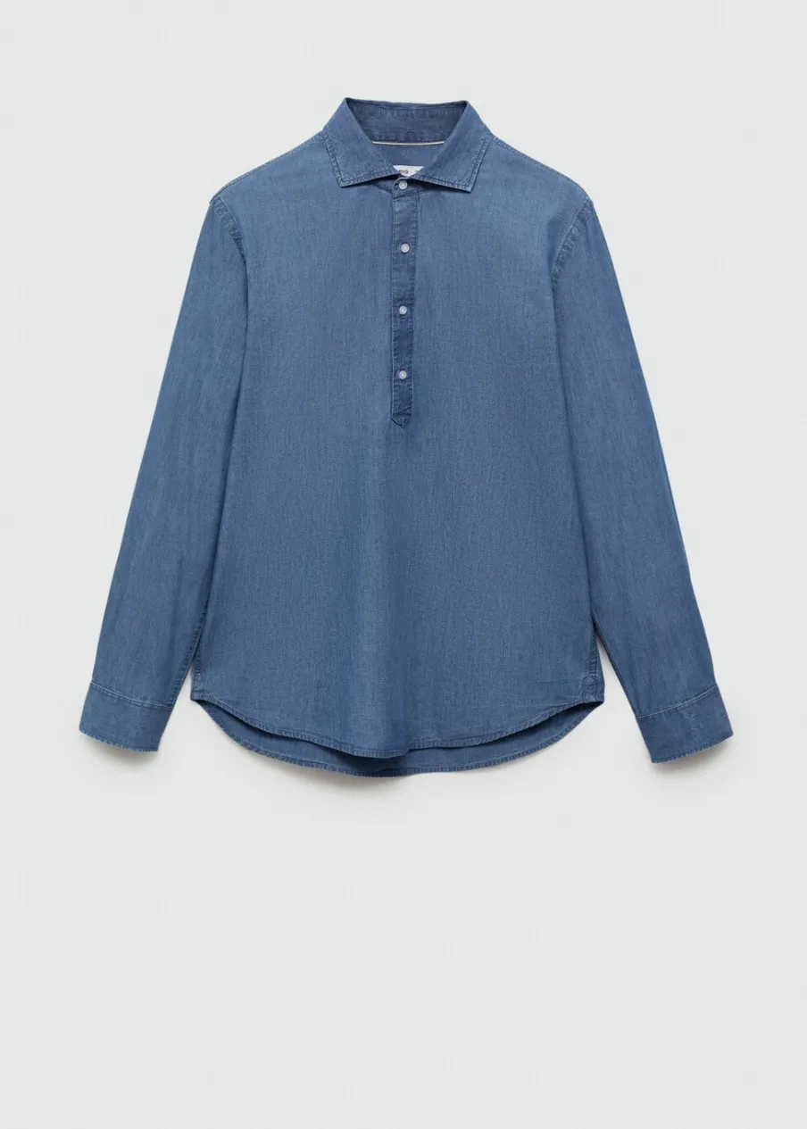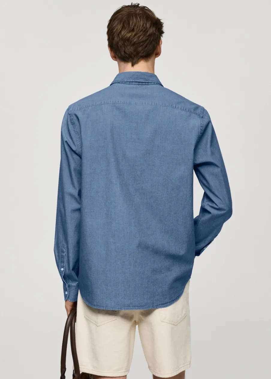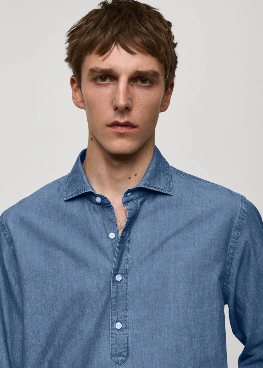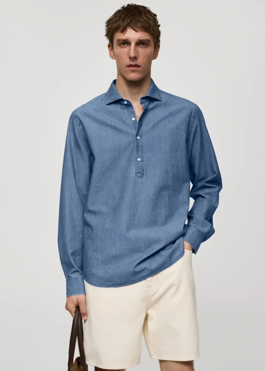 Wyłącznie online. Bawełniana tkanina chambray. Tkanina przypominająca wyglądem denim. Koszulowy kołnierz. Długi rękaw z guzikami na mankietach. Model ma 187 cm wzrostu i nosi rozmiar M. Tkanina z 100% bawełny. Zapięcie na guziki z przodu. Zaokrąglony dół.