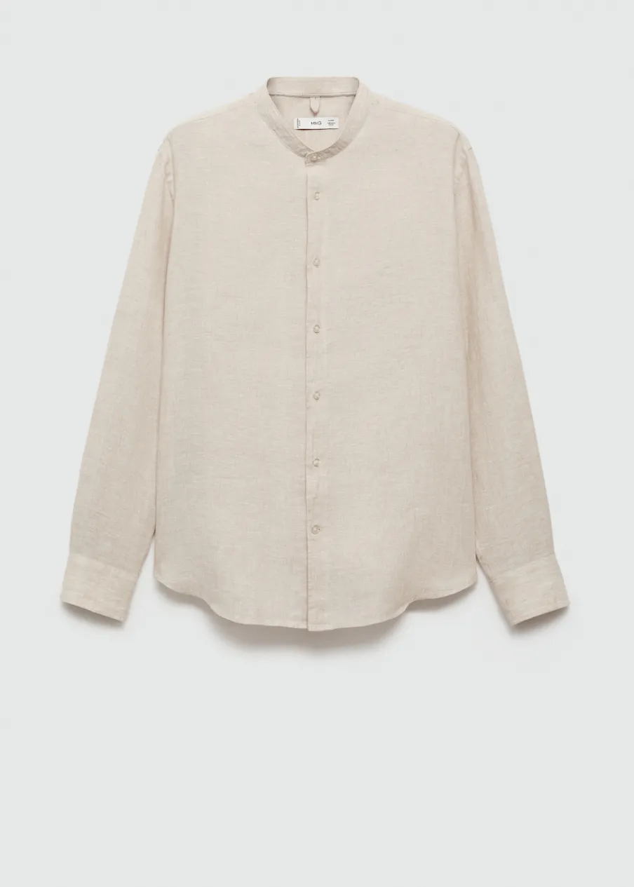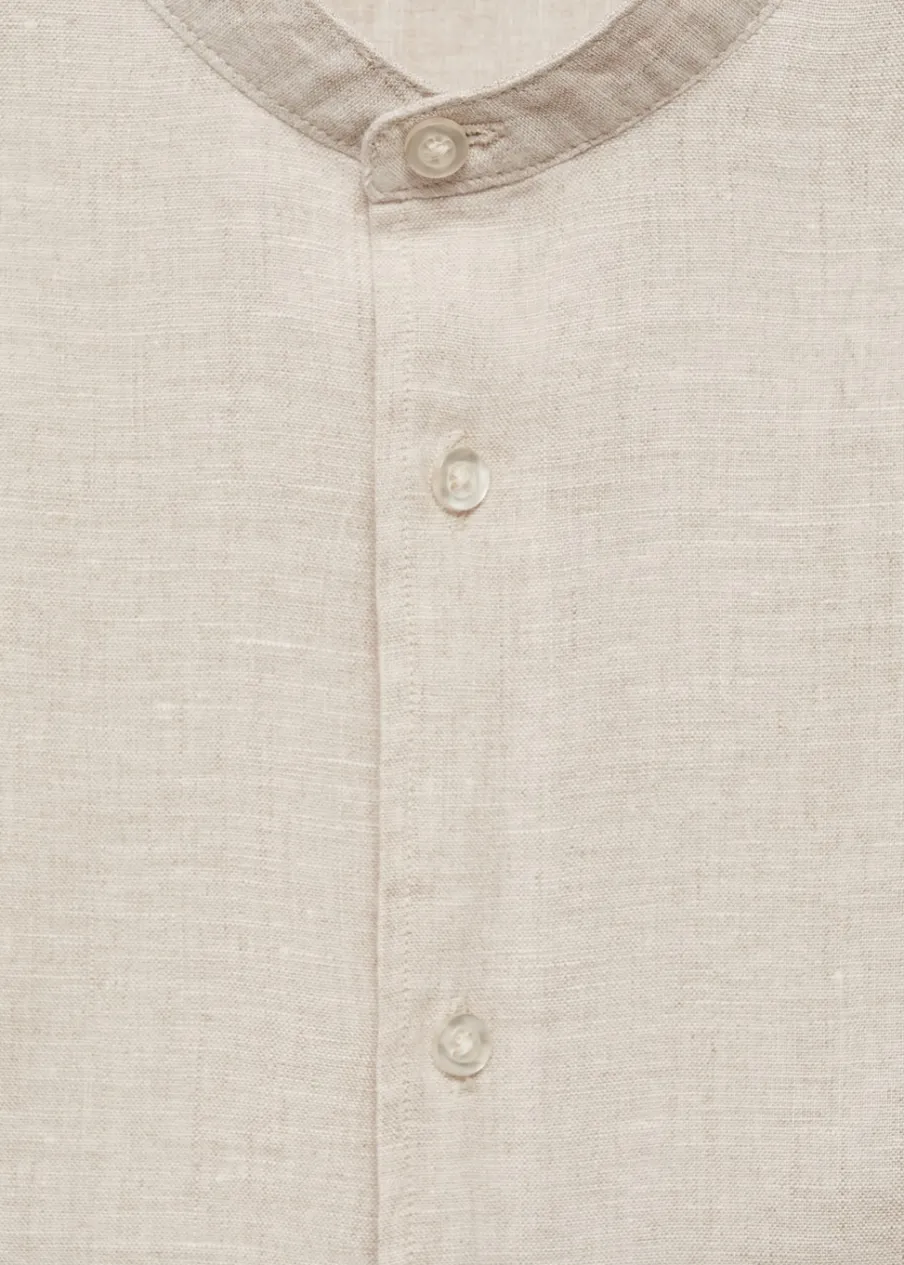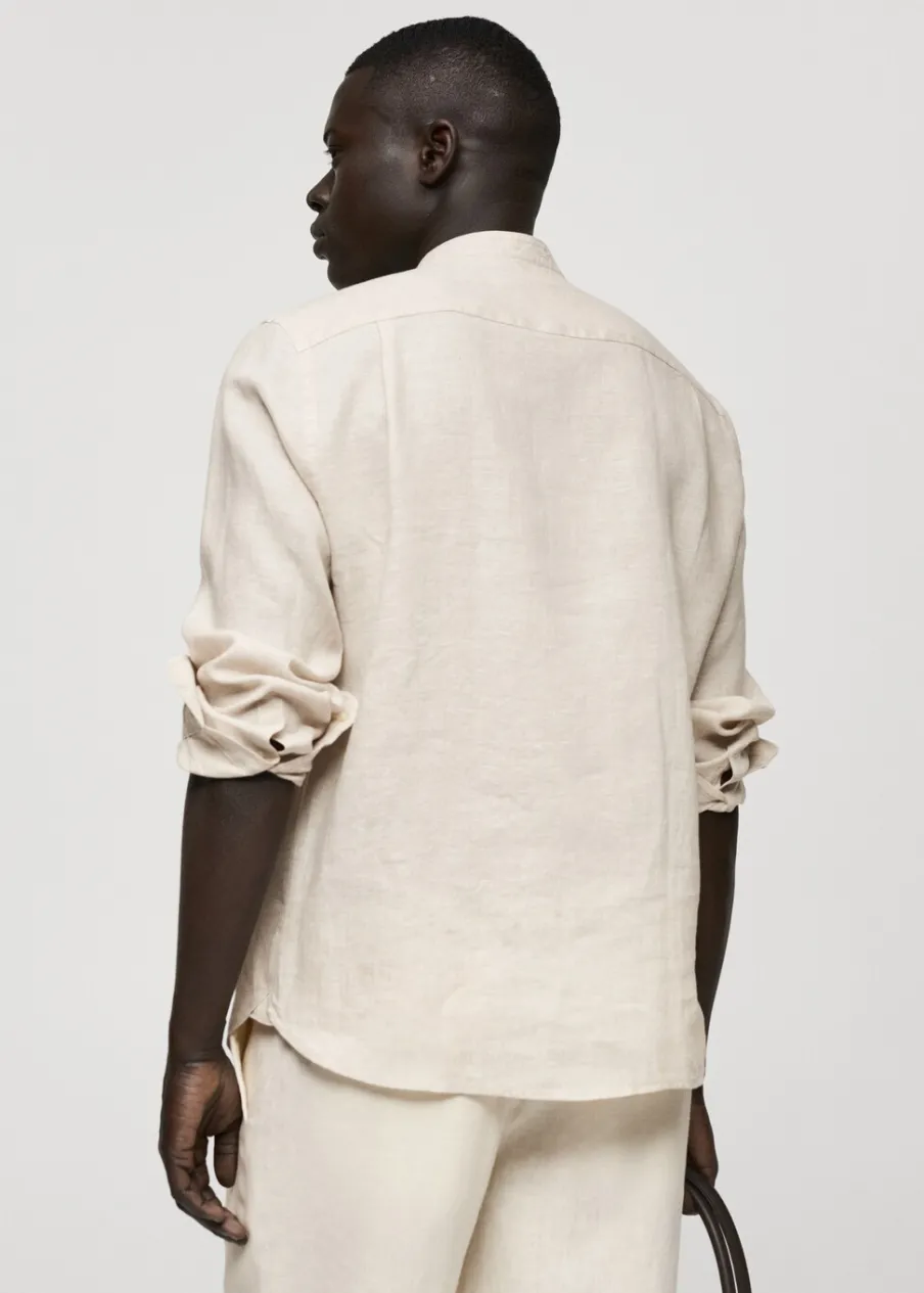 Tkanina z 100% lnu. Cienka tkanina. Stójkowy kołnierzyk. Zapięcie z przodu na guziki. Długi rękaw z guzikami na mankietach. Model ma 185 cm wzrostu i nosi rozmiar M. Klasyczny krój. Zaokrąglony dół.