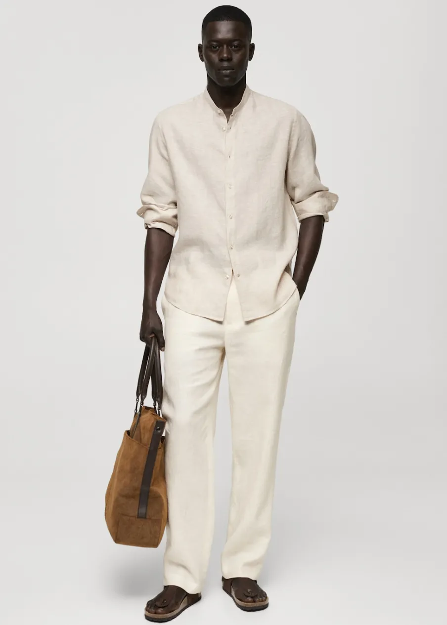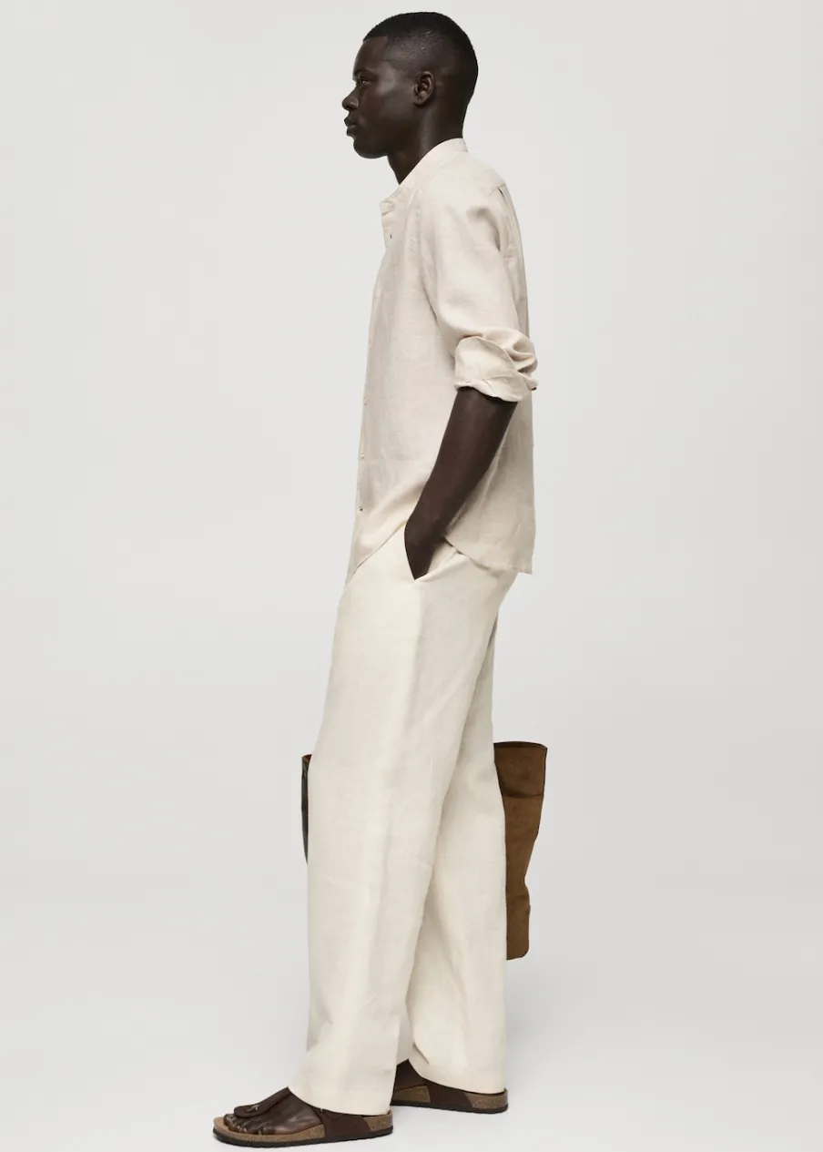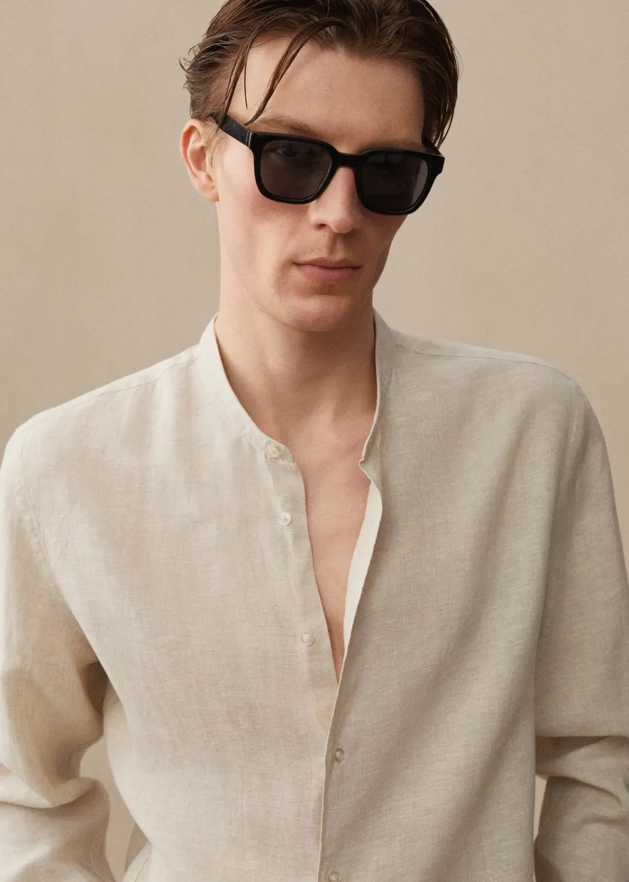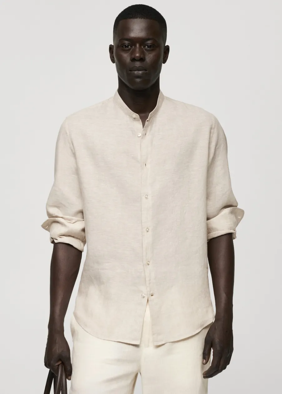 Tkanina z 100% lnu. Cienka tkanina. Stójkowy kołnierzyk. Zapięcie z przodu na guziki. Długi rękaw z guzikami na mankietach. Model ma 185 cm wzrostu i nosi rozmiar M. Klasyczny krój. Zaokrąglony dół.