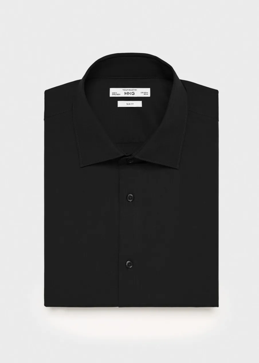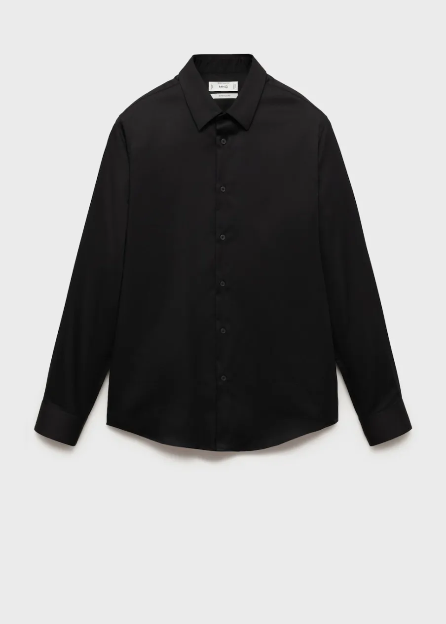 Slim-fit. Bawełniana tkanina stretch. Klasyczny kołnierzyk. Zapięcie na guziki z przodu. Długi rękaw z guzikami na mankietach. Zaokrąglony dół. Model ma 190 cm wzrostu i nosi rozmiar M.