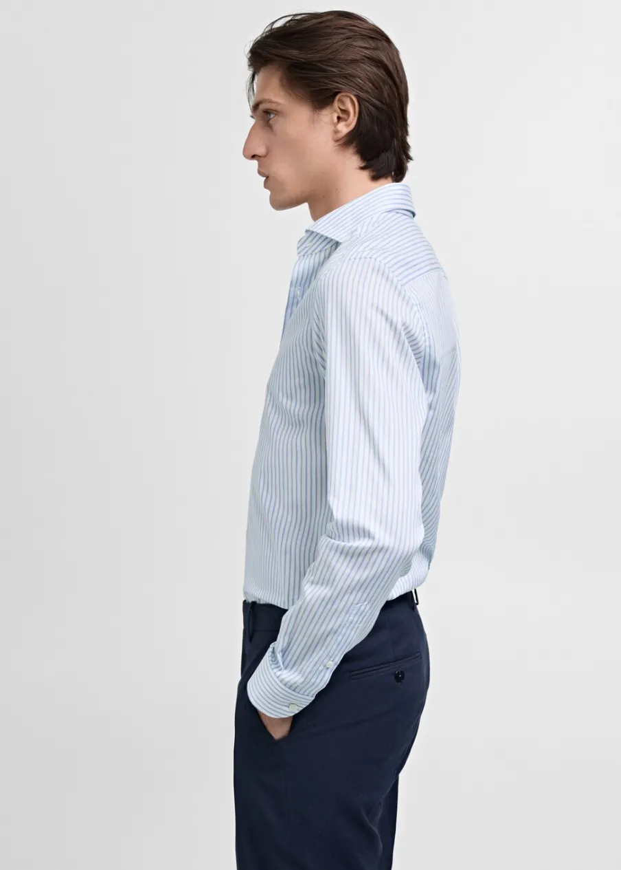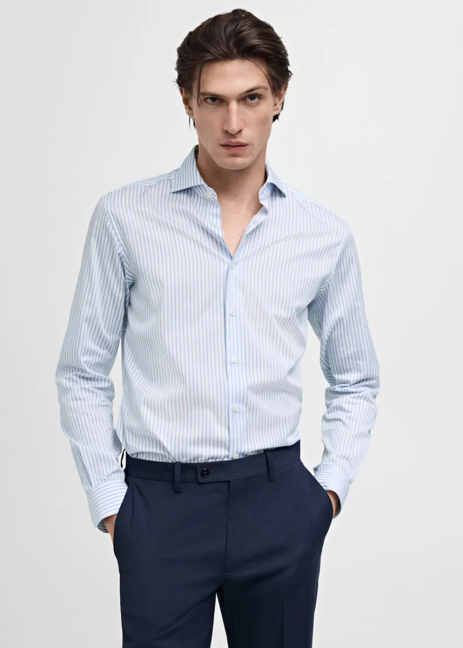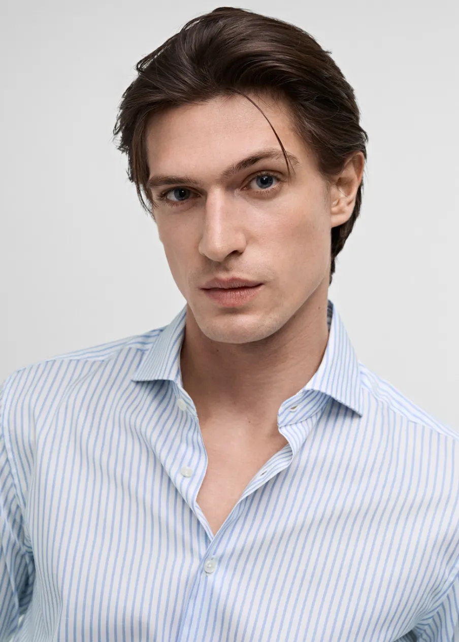 Slim-fit. Tkanina z 100% bawełny. Nadruk: paski. Kołnierzyk włoski. Długi, zapinany rękaw. Zaokrąglony dół. Model ma 190 cm wzrostu i nosi rozmiar M.