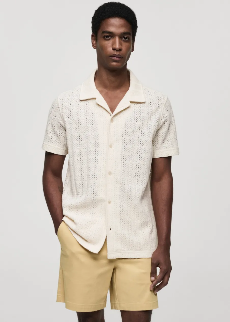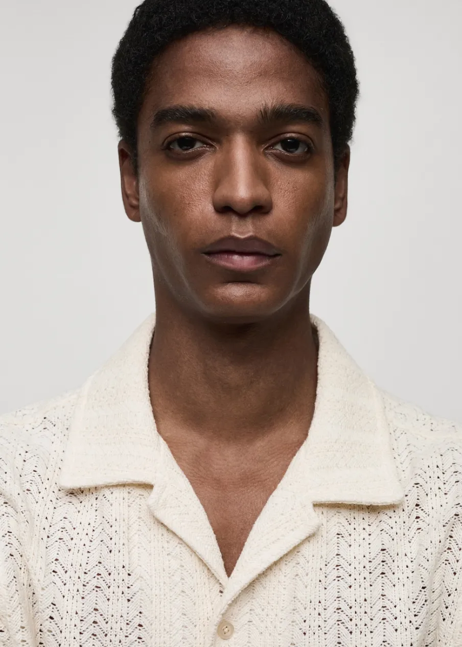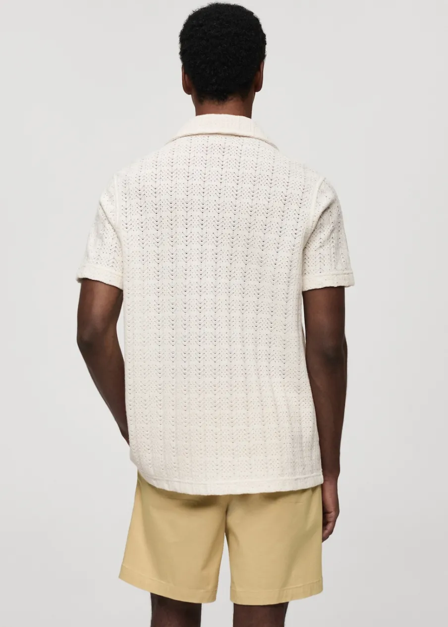 Tkanina mieszanka bawełny. Ażurowa dzianina. Kołnierzyk typu bowling. Zapięcie z przodu na guziki. Krótki rękaw. Prosty dół. Model ma 185 cm wzrostu i nosi rozmiar M.