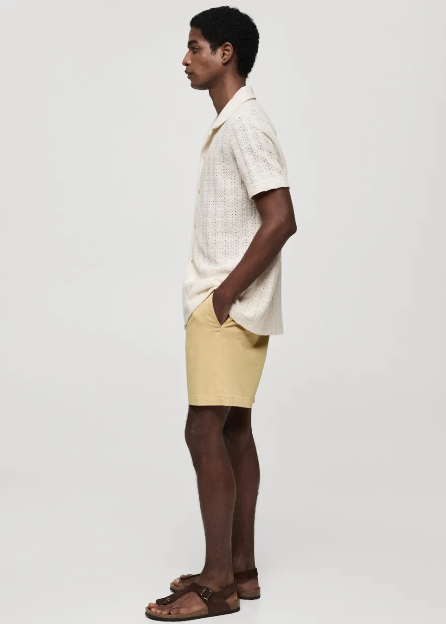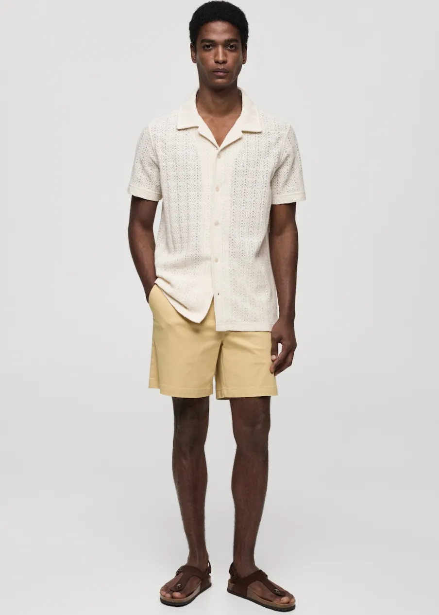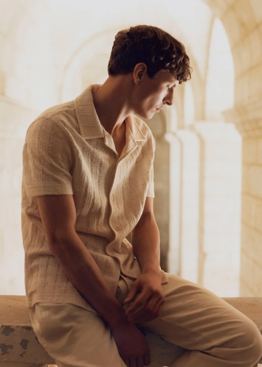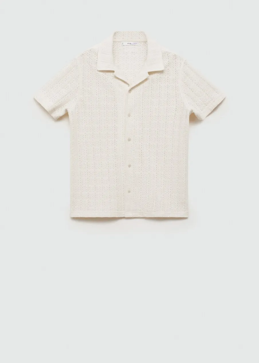 Tkanina mieszanka bawełny. Ażurowa dzianina. Kołnierzyk typu bowling. Zapięcie z przodu na guziki. Krótki rękaw. Prosty dół. Model ma 185 cm wzrostu i nosi rozmiar M.