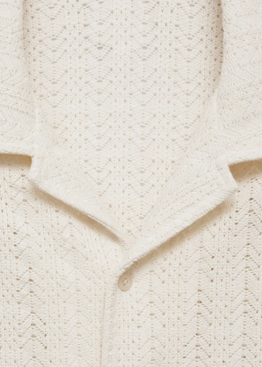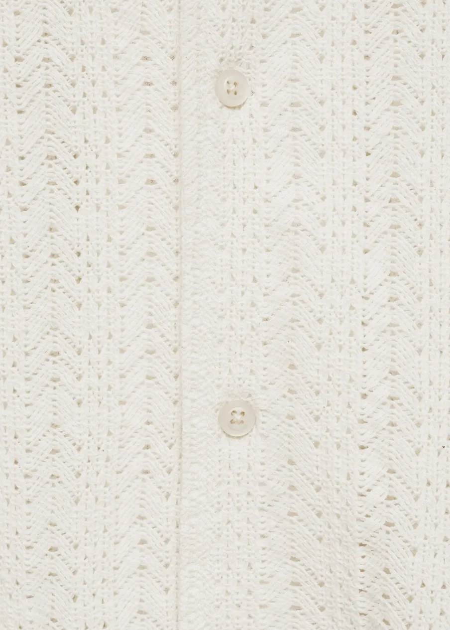 OpisTkanina mieszanka bawełny. Ażurowa dzianina. Kołnierzyk typu bowling. Zapięcie z przodu na guziki. Krótki ręka…
