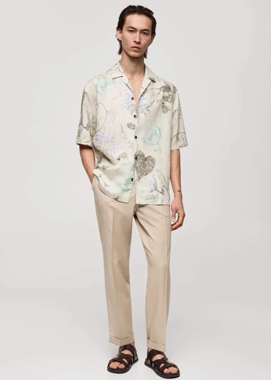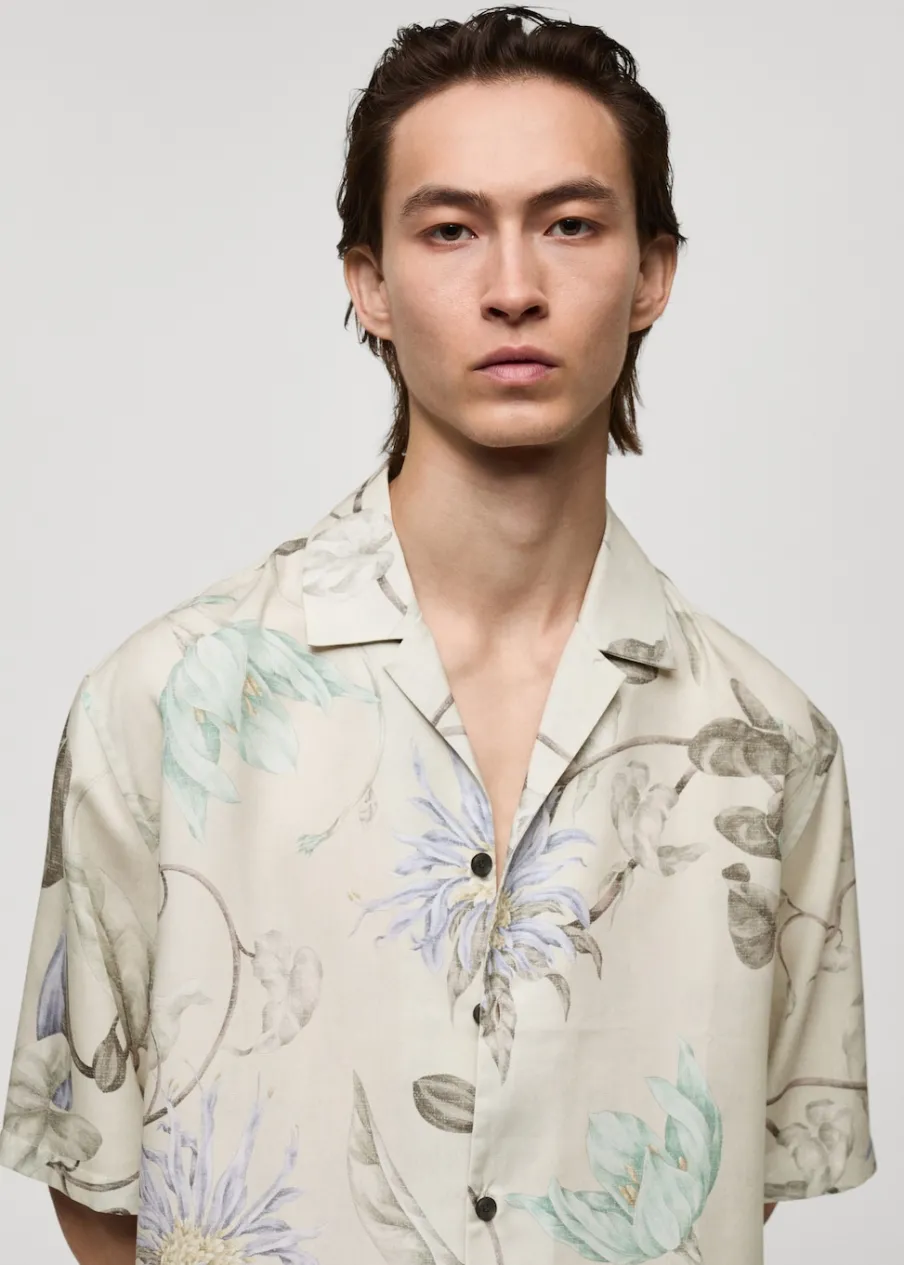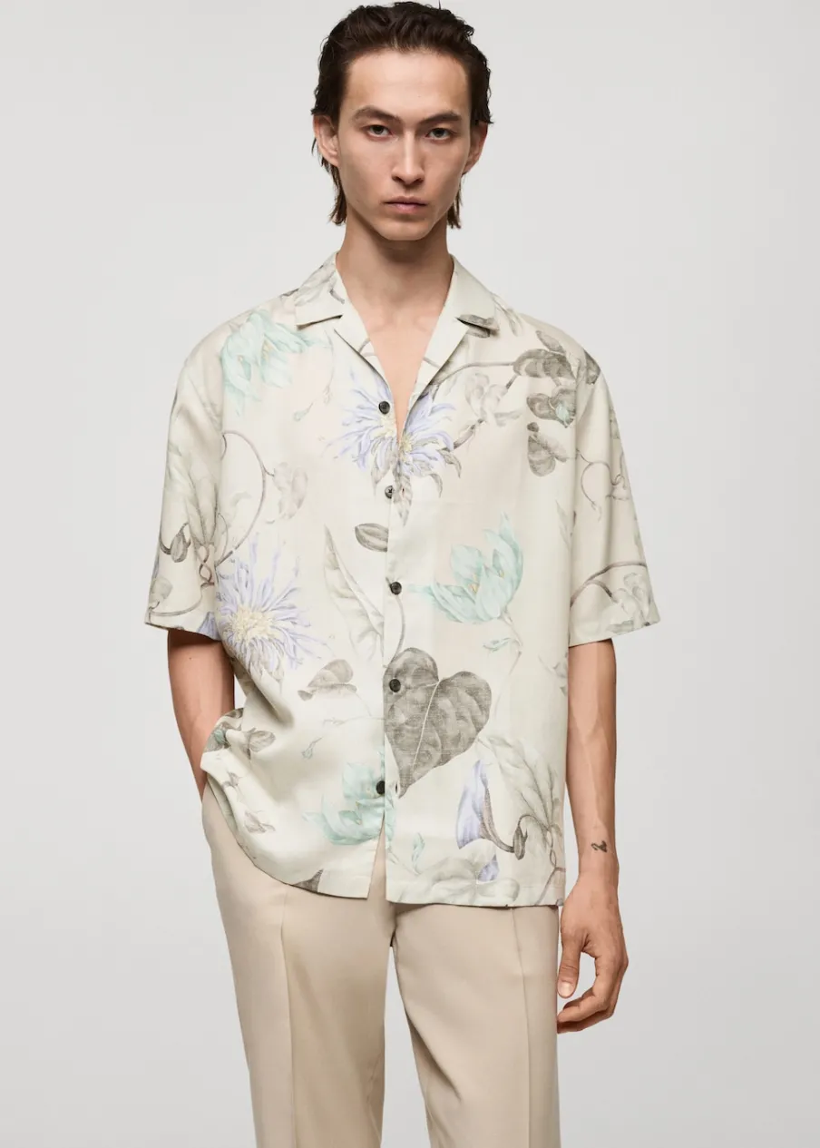 Krój regular. Tkanina z 100% tencelu. Lejąca tkanina. Tropikalny wzór. Kołnierzyk typu bowling. Zapięcie z przodu na guziki. Krótki rękaw. Prosty dół. Model ma 187 cm wzrostu i nosi rozmiar M.