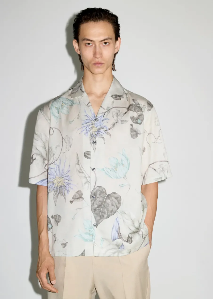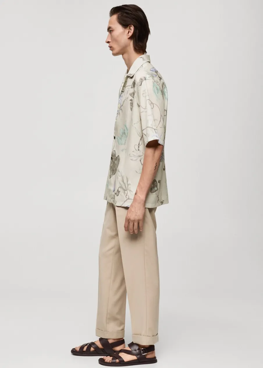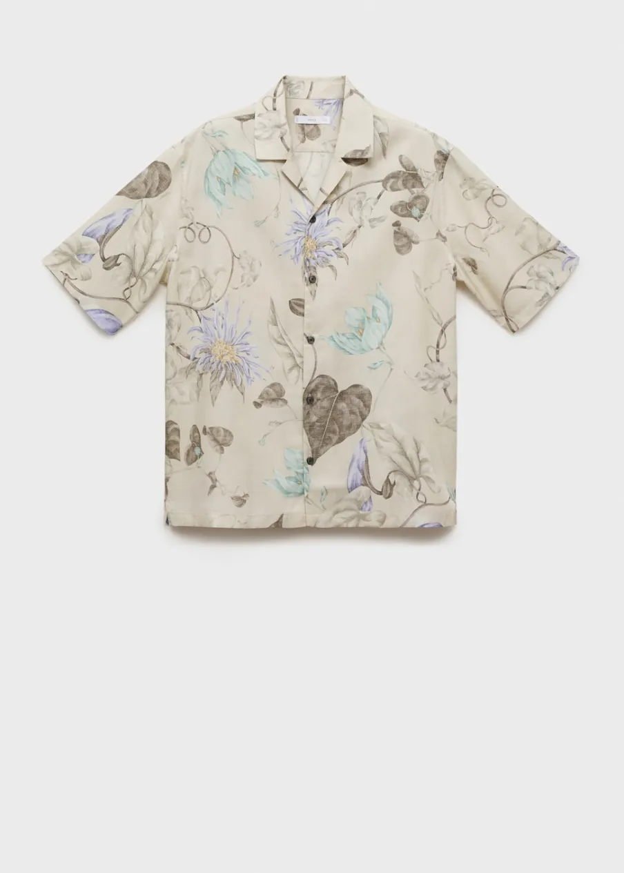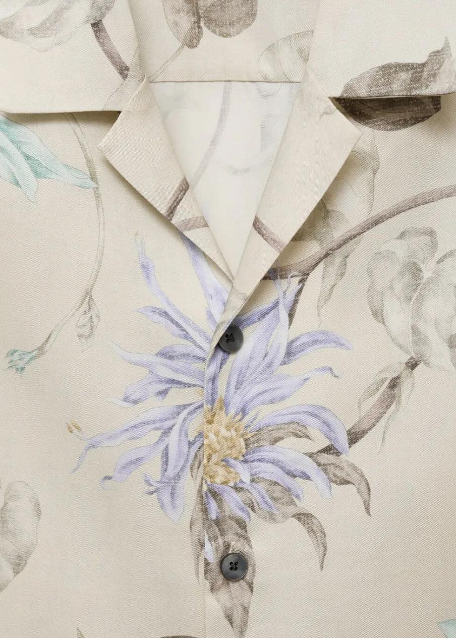 Krój regular. Tkanina z 100% tencelu. Lejąca tkanina. Tropikalny wzór. Kołnierzyk typu bowling. Zapięcie z przodu na guziki. Krótki rękaw. Prosty dół. Model ma 187 cm wzrostu i nosi rozmiar M.