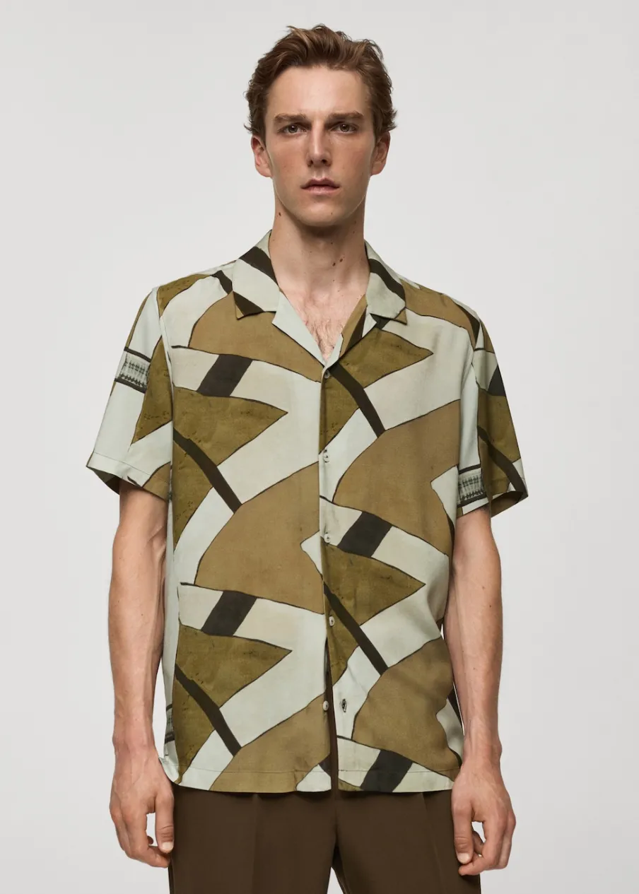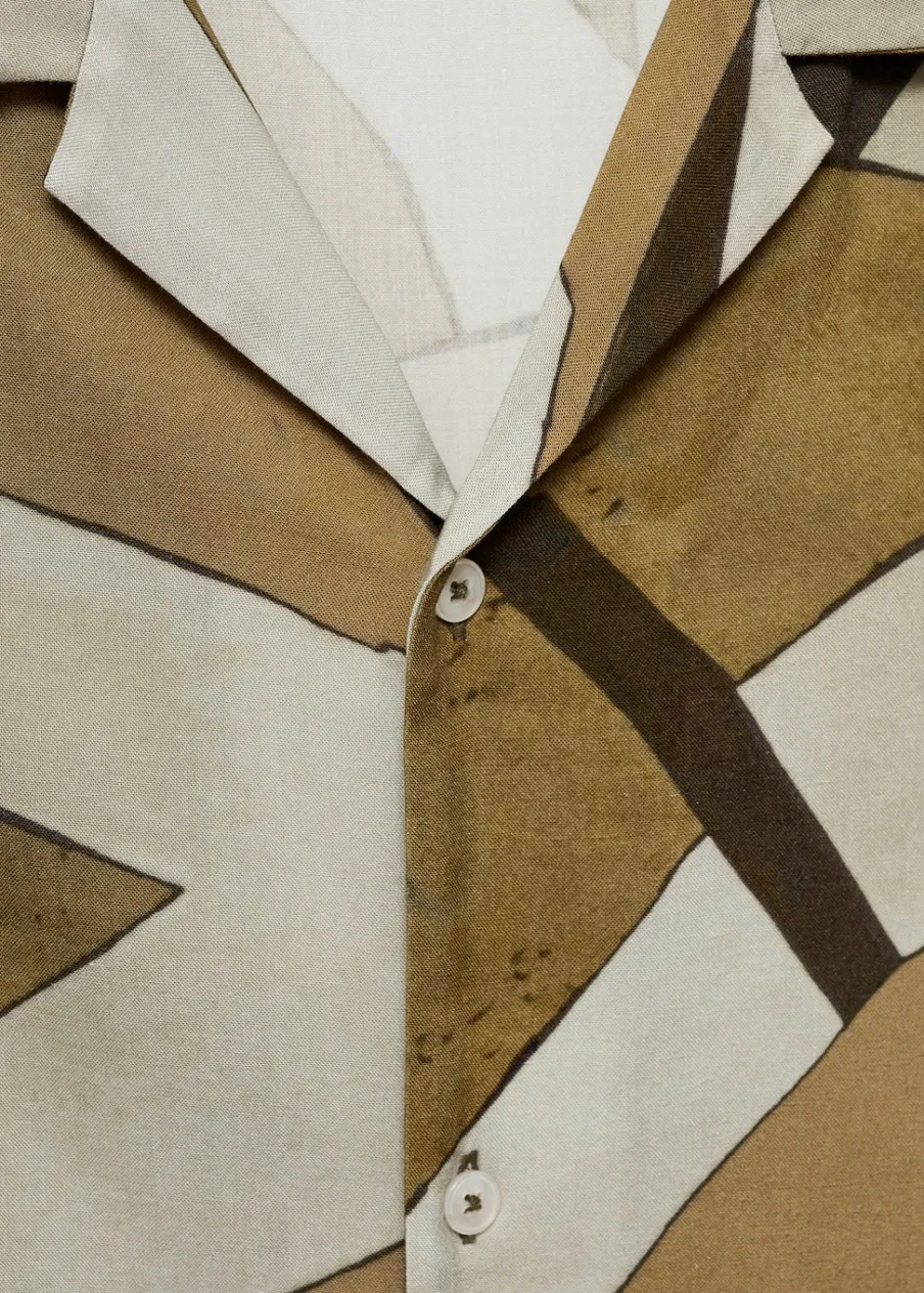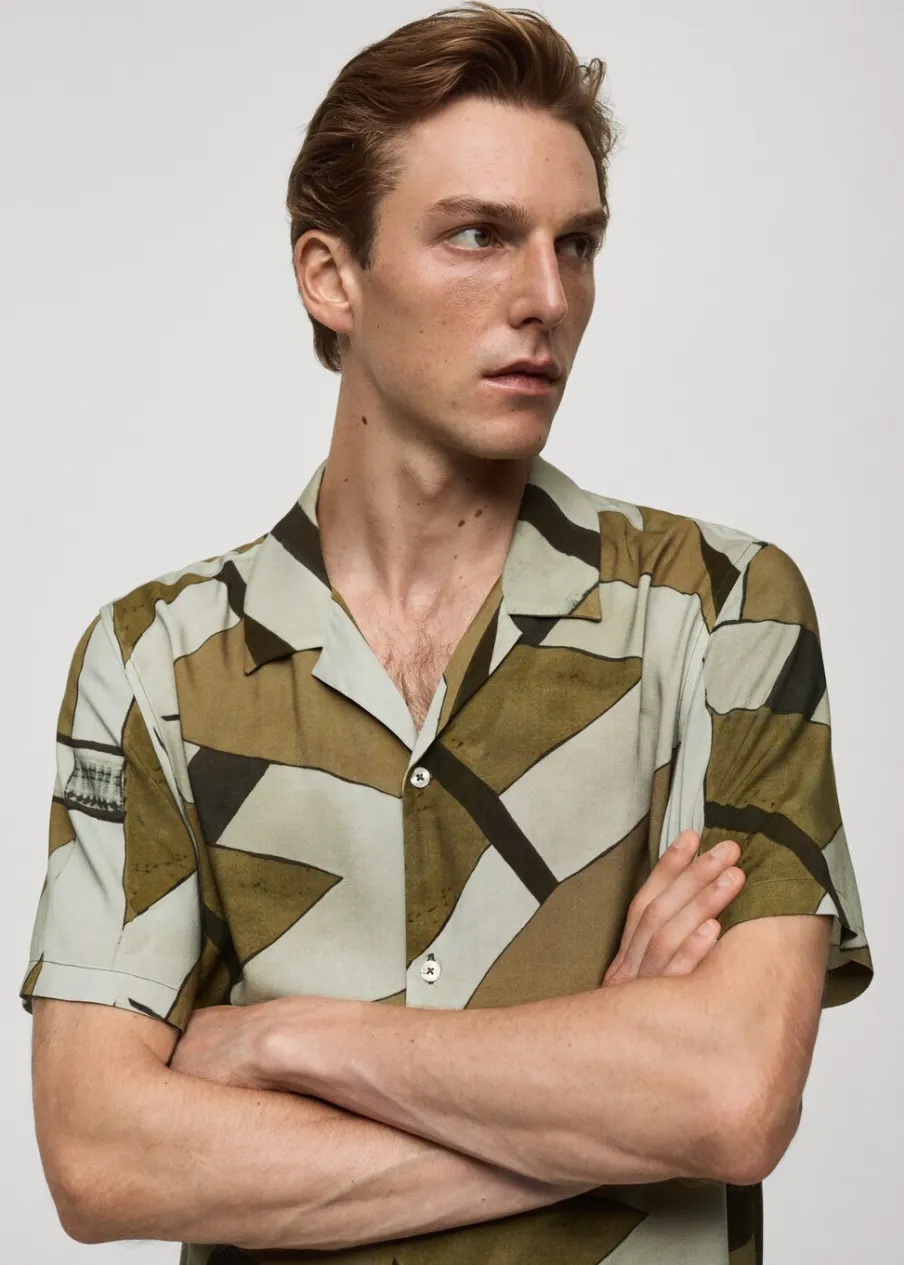 Krój regular. Lejąca tkanina. Kołnierzyk typu bowling. Krótki rękaw. Geometryczny wzór. Dół z rozcięciem po bokach. Model ma 190 cm wzrostu i nosi rozmiar M. Zapięcie na guziki z przodu.