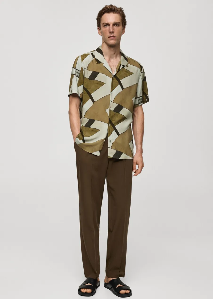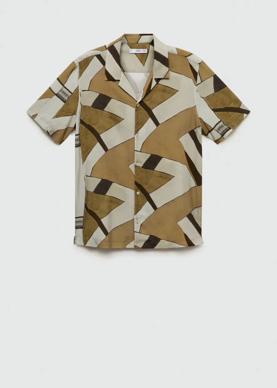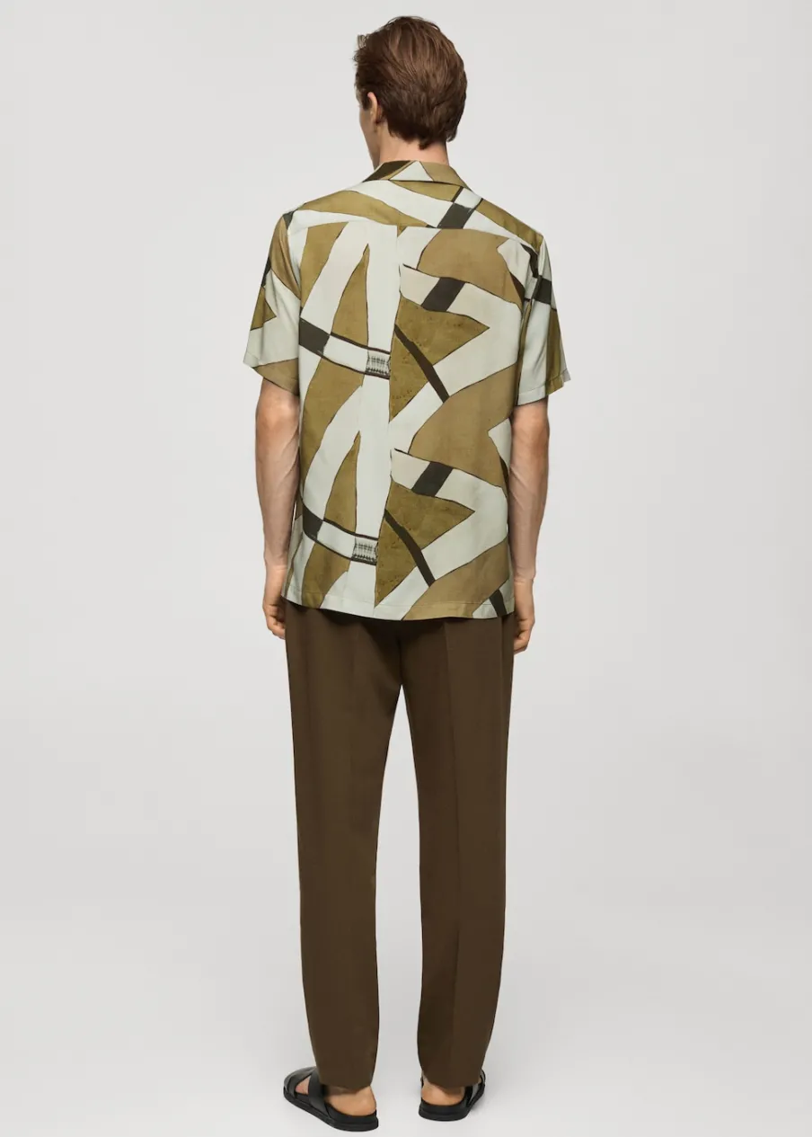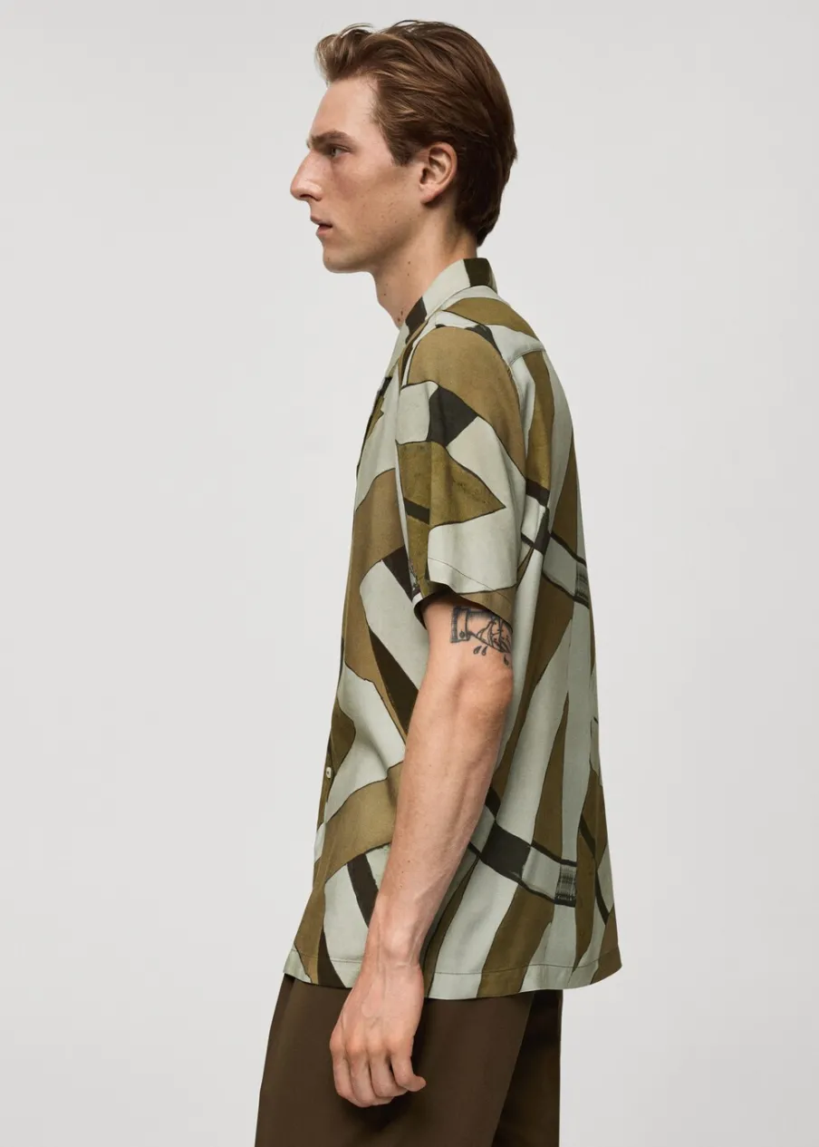 Krój regular. Lejąca tkanina. Kołnierzyk typu bowling. Krótki rękaw. Geometryczny wzór. Dół z rozcięciem po bokach. Model ma 190 cm wzrostu i nosi rozmiar M. Zapięcie na guziki z przodu.